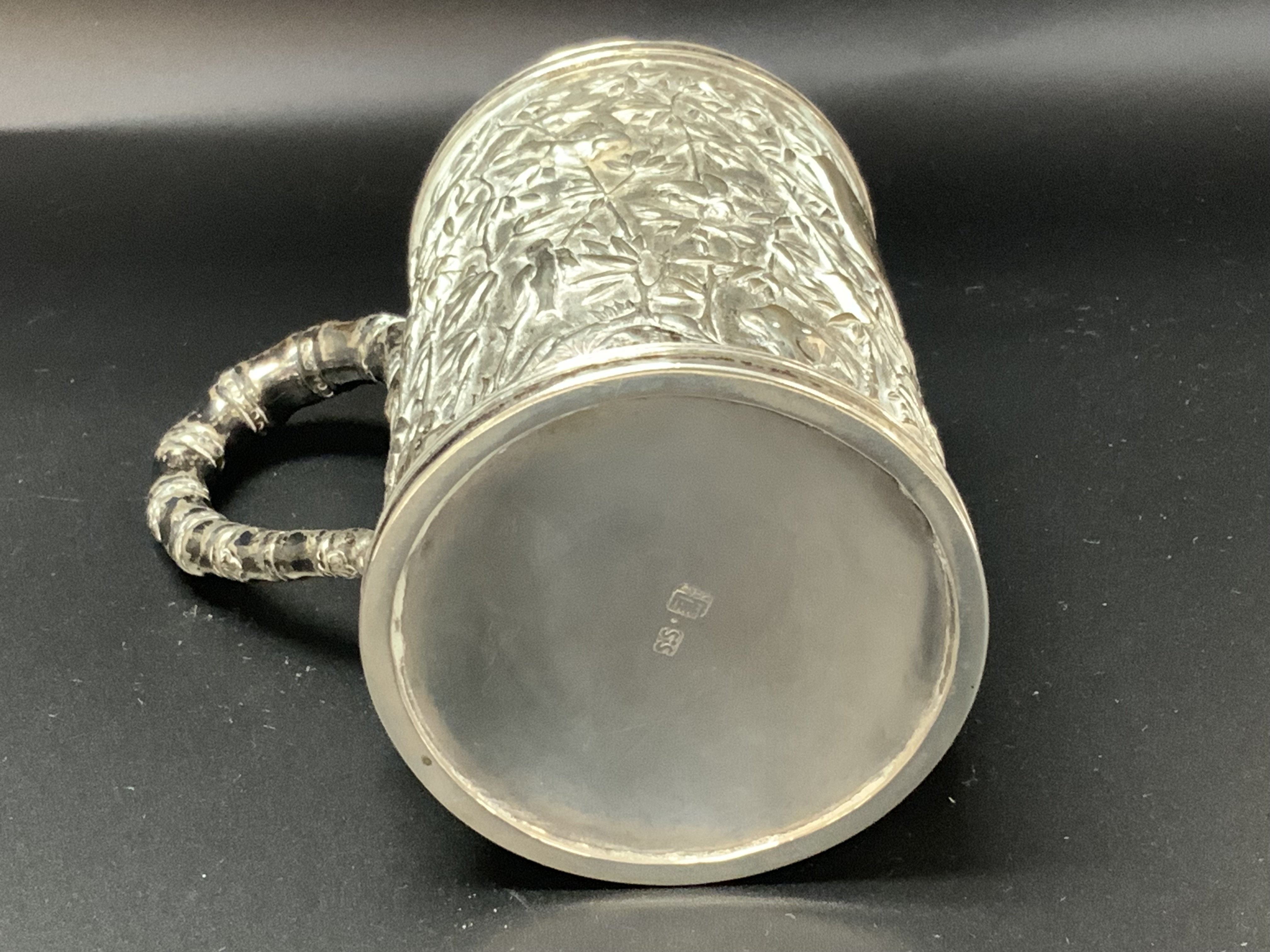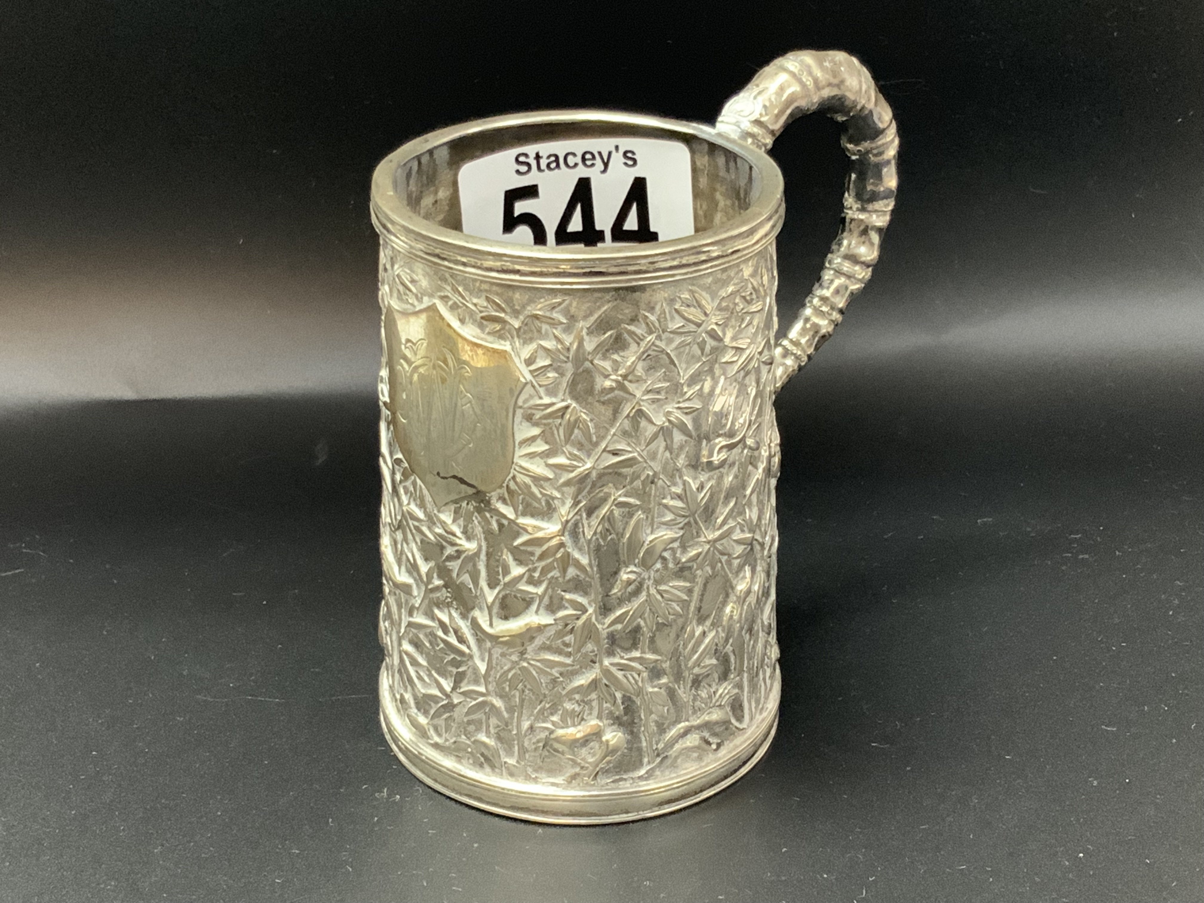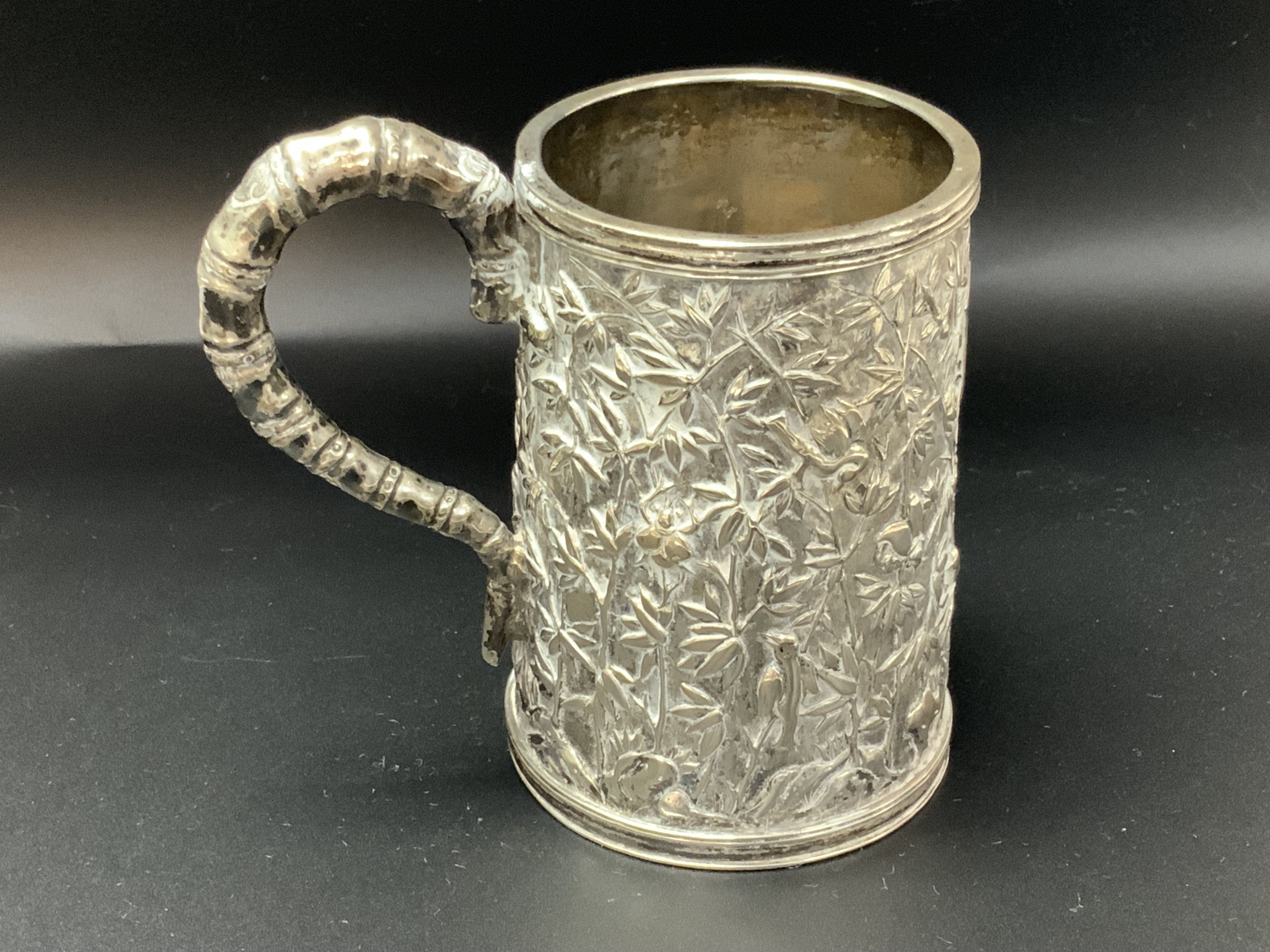A late 19th Century Chinese silver mug with perfuse raised bamboo with small birds Shield with initials. Height 9cm weight 145g