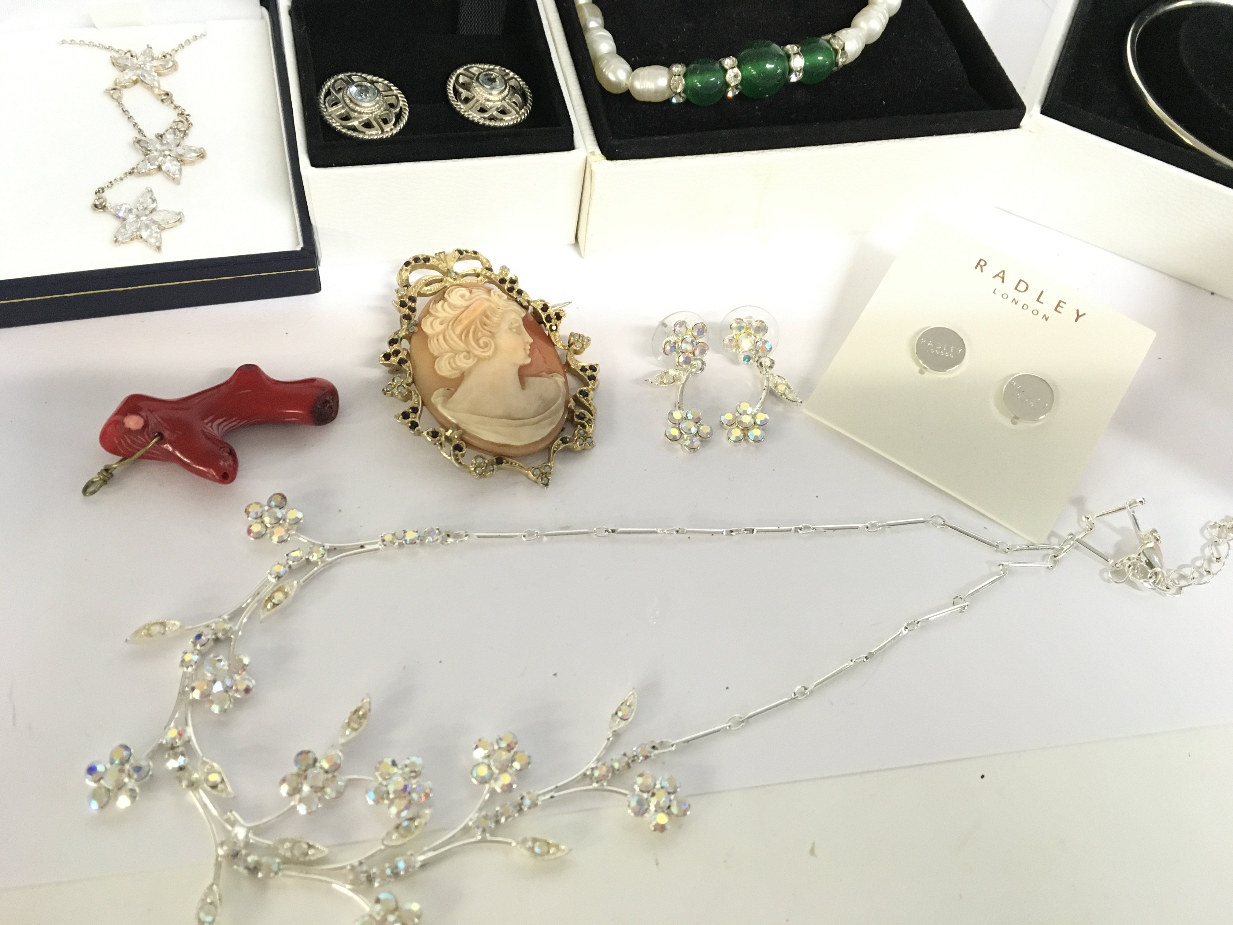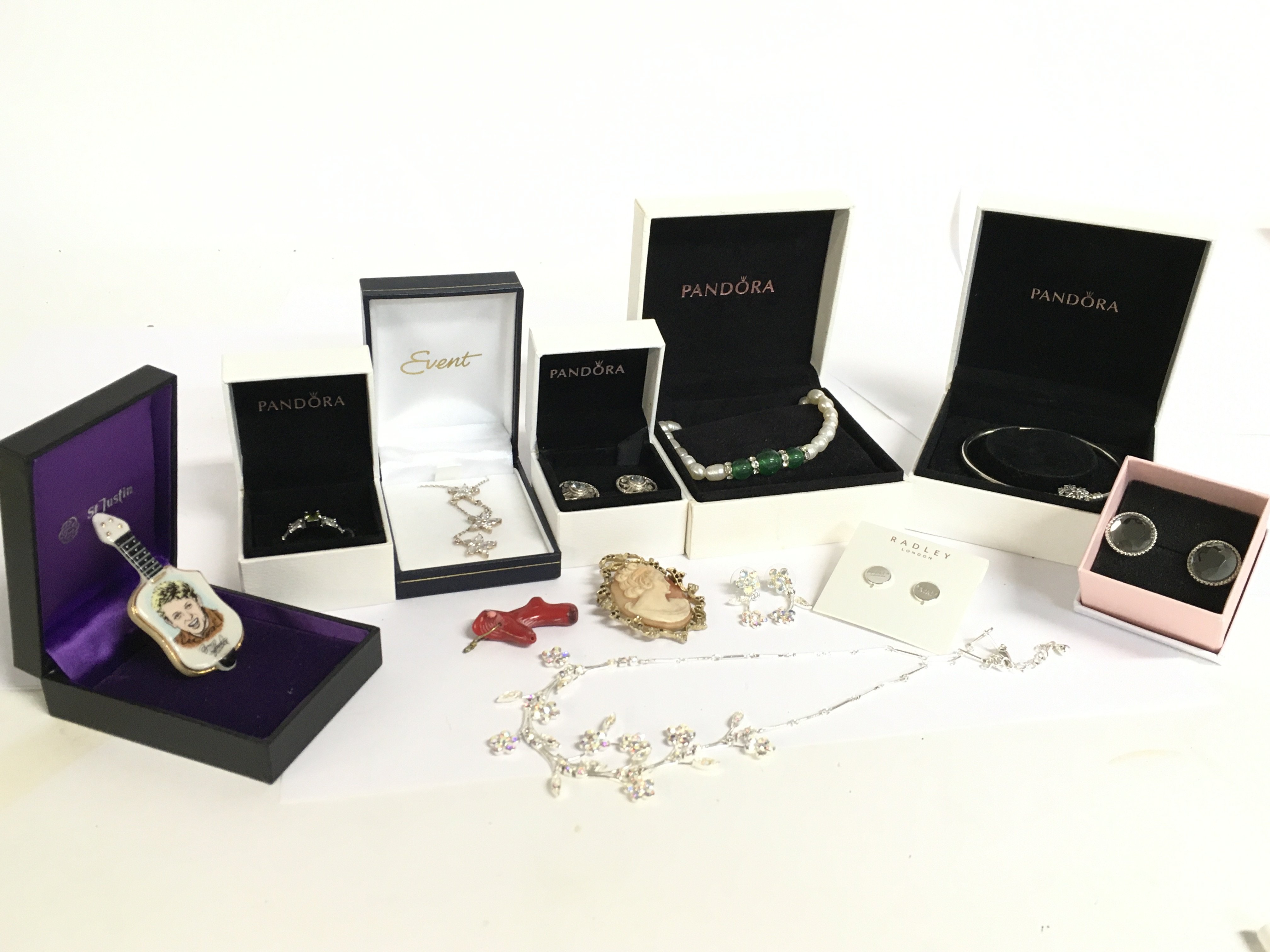 A selection of Pandora jewellery, a Tommy Steele Wade porcelain brooch, Cameo brooch, Swarovski necklace with matching earrings and a red coral pendant