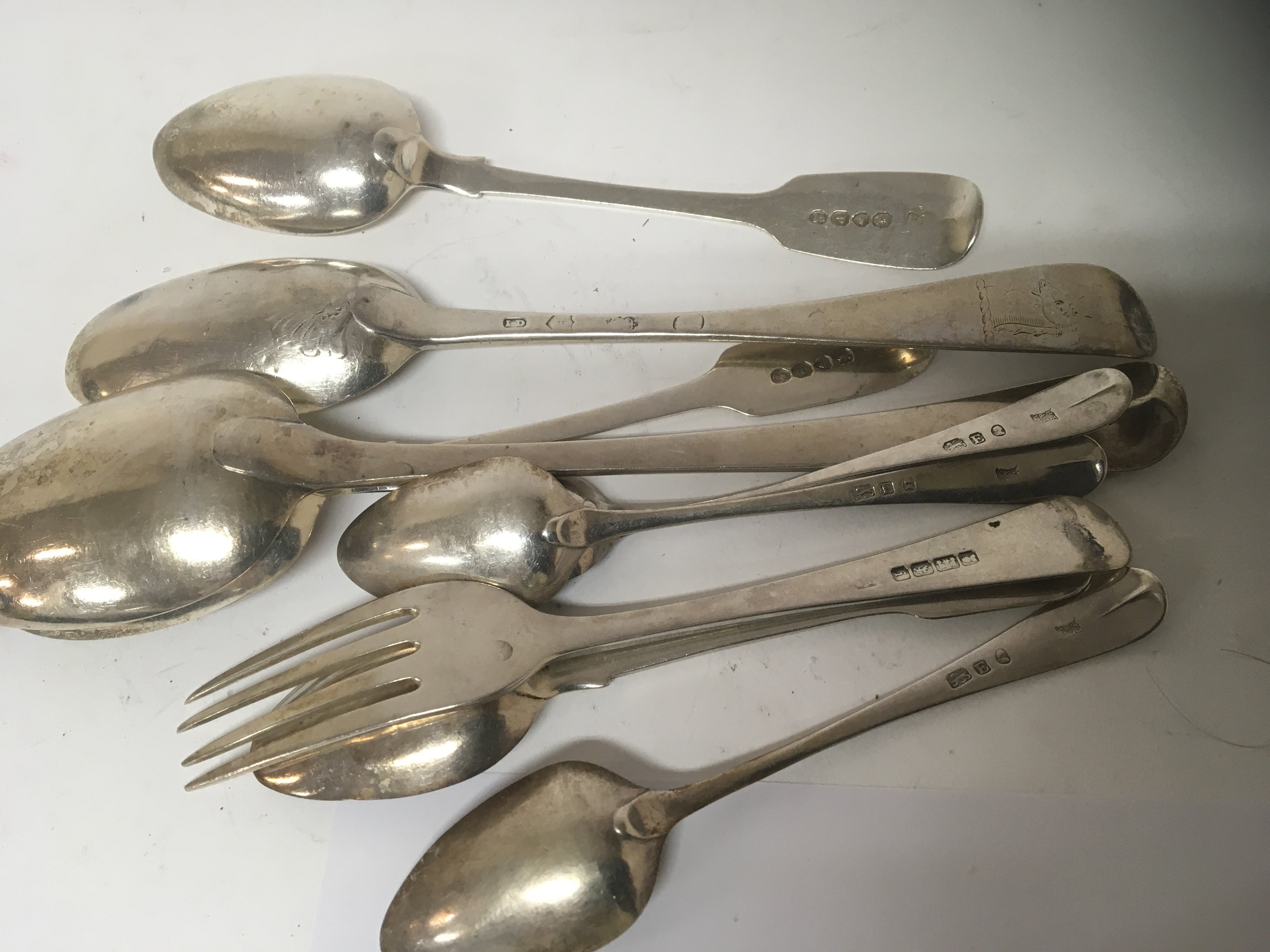A collection of George III and later silver spoons mixed hallmarks including one spoon with George II hallmarks marks worn.