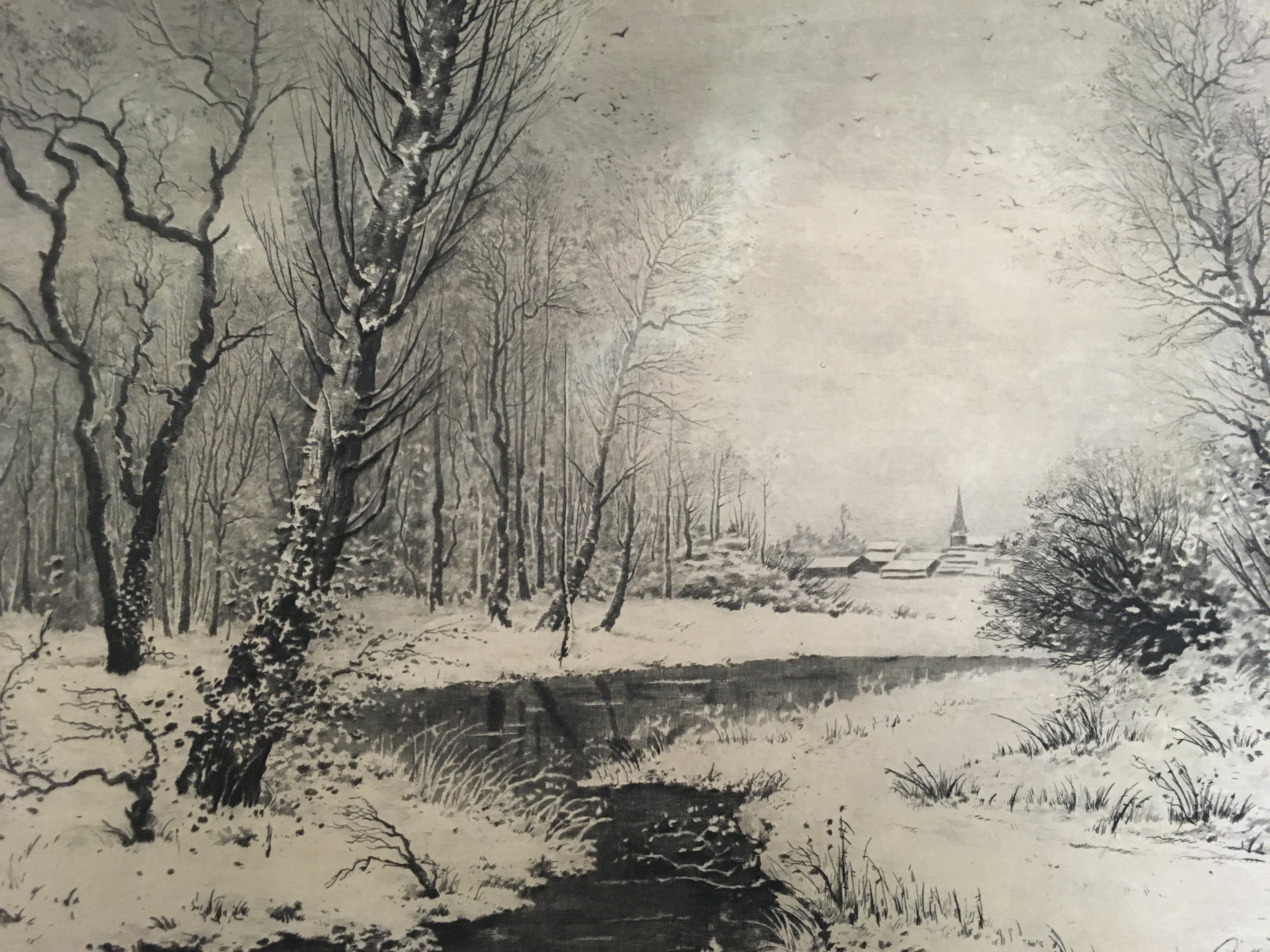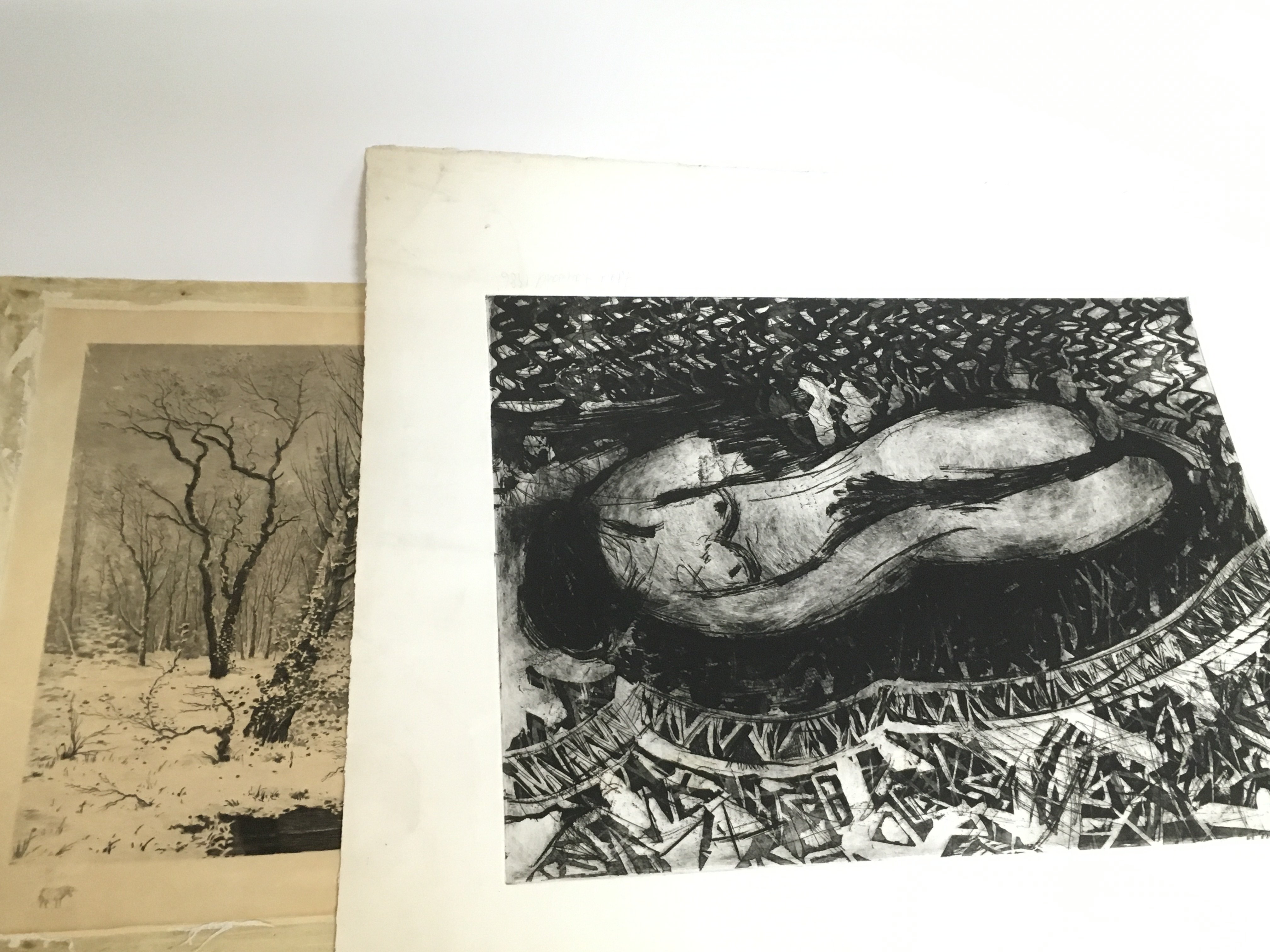 Two unframed modern dry point signed watercolours, a nude signed Angie Hayward 1986 and a winter forest view signed Cangille Fonce 75x58cm and 46x65cm. Postage category B- NO RESERVE
