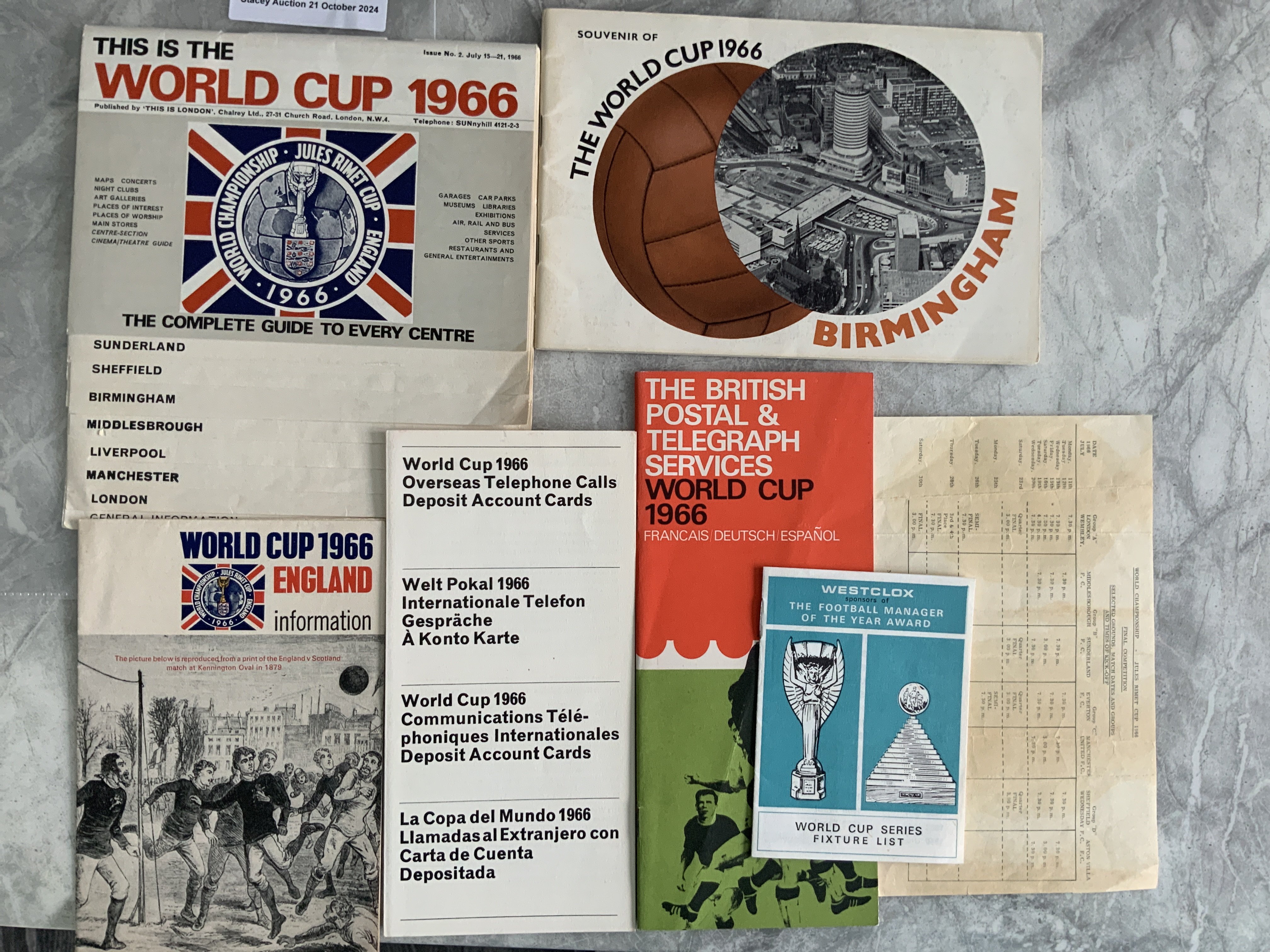 1966 World Cup Brochures + Paper Memorabilia: 74 page complete guide to all cities, guide of Birmingham, postal + telegraph service guide in French Dutch and Spanish, Westclox fixture list and information booklet. Very good. (7)