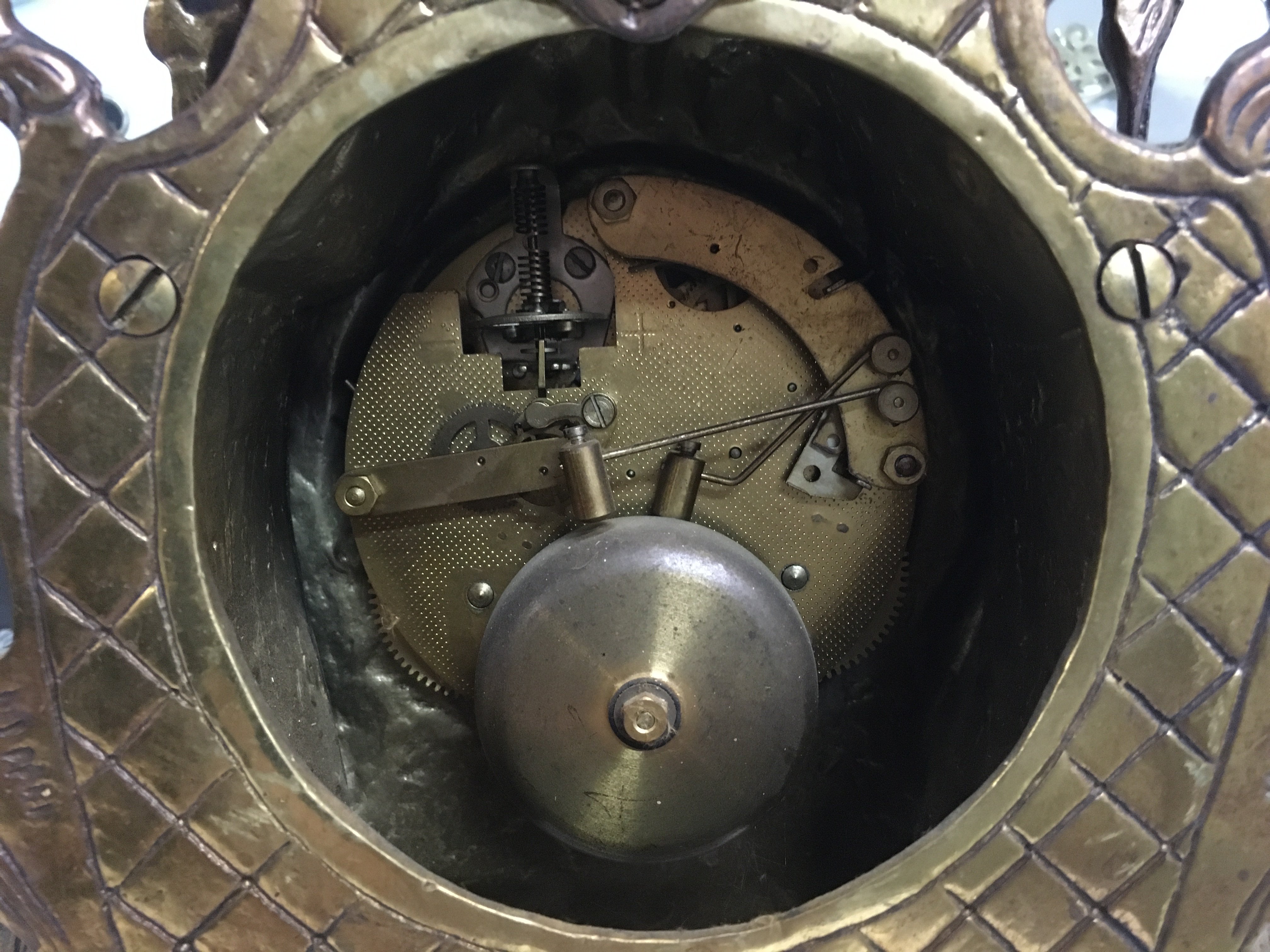 A brass ornate mantle clock (40cm tall) and two wall clocks, President and Holly. This lot cannot be posted