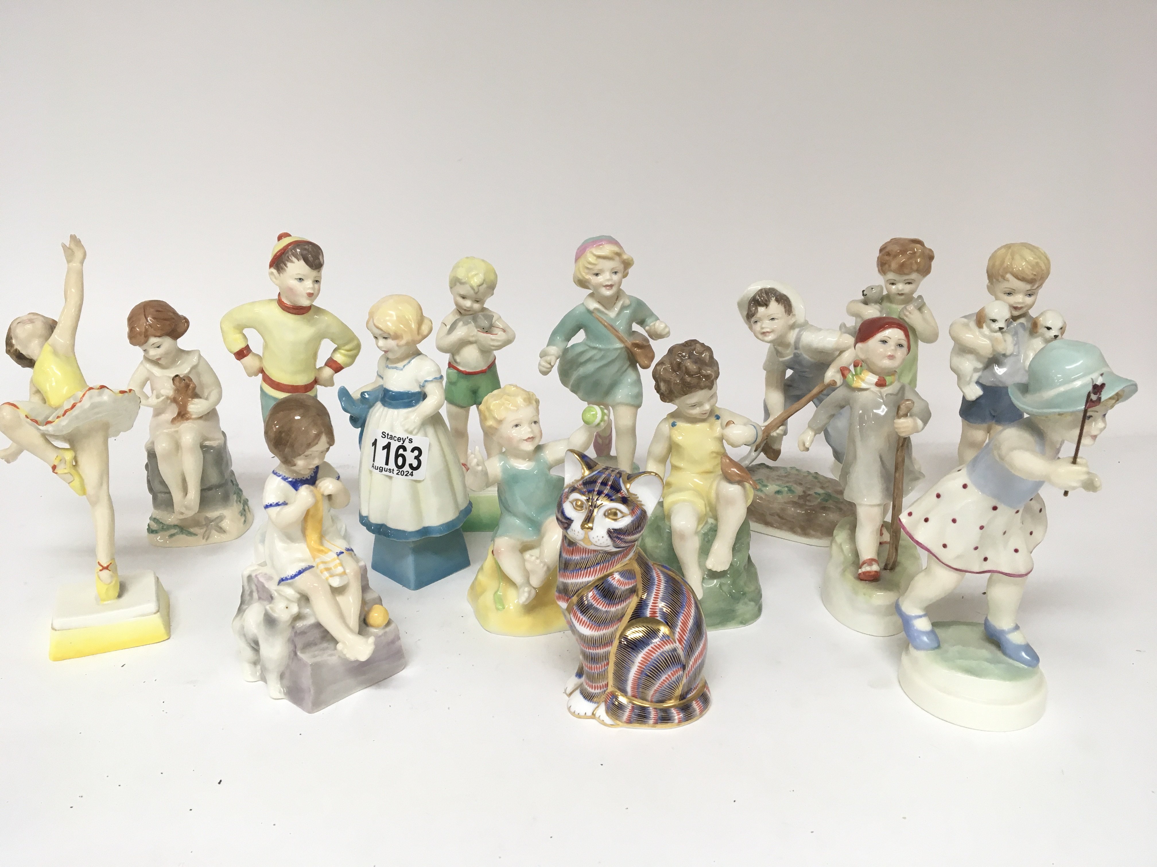 A collection of Royal Worcester Child figures fourteen figures designed by F Doughty. and Royal Crown Derby porcelain cat. No obvious damage. (15)