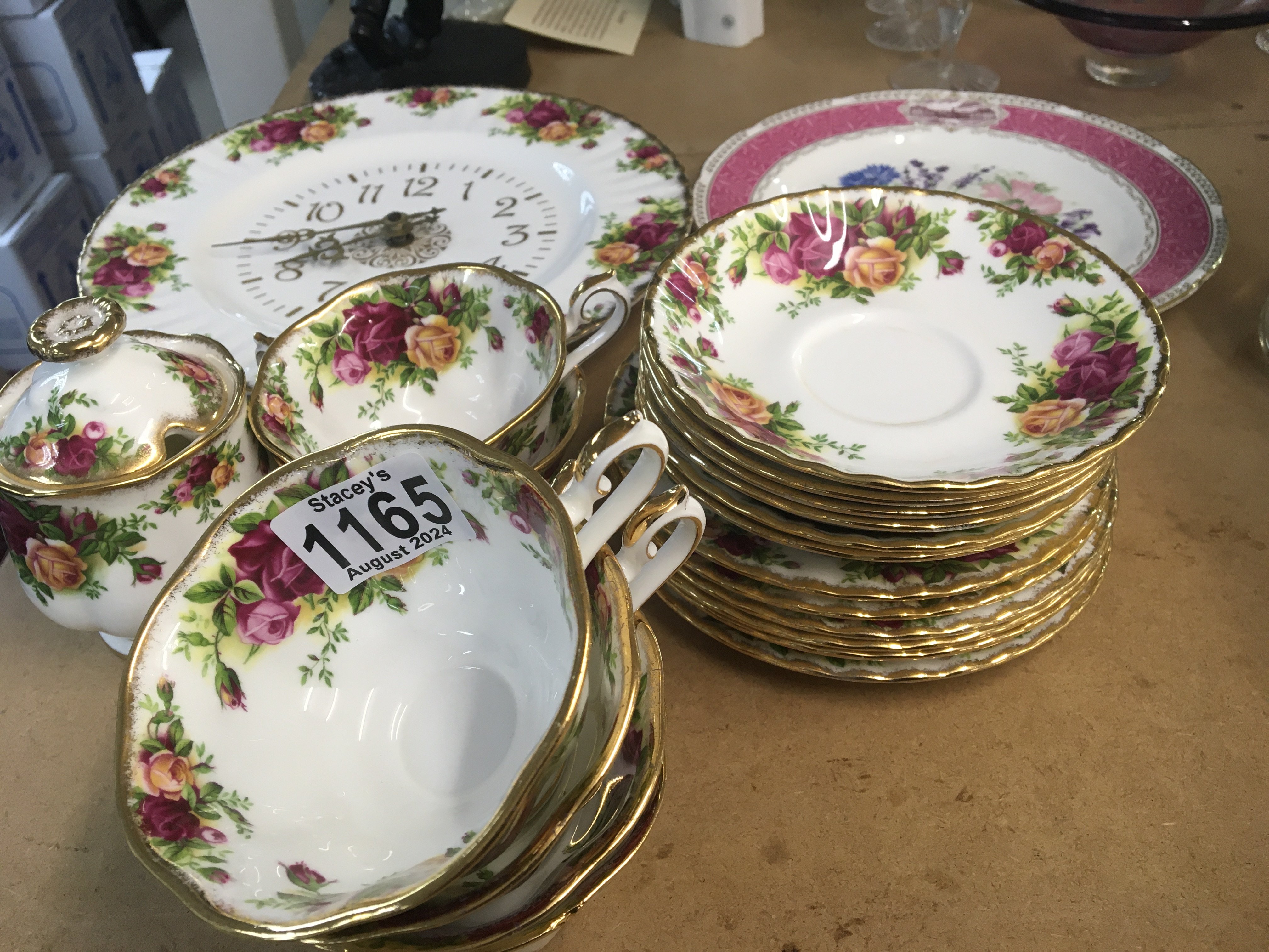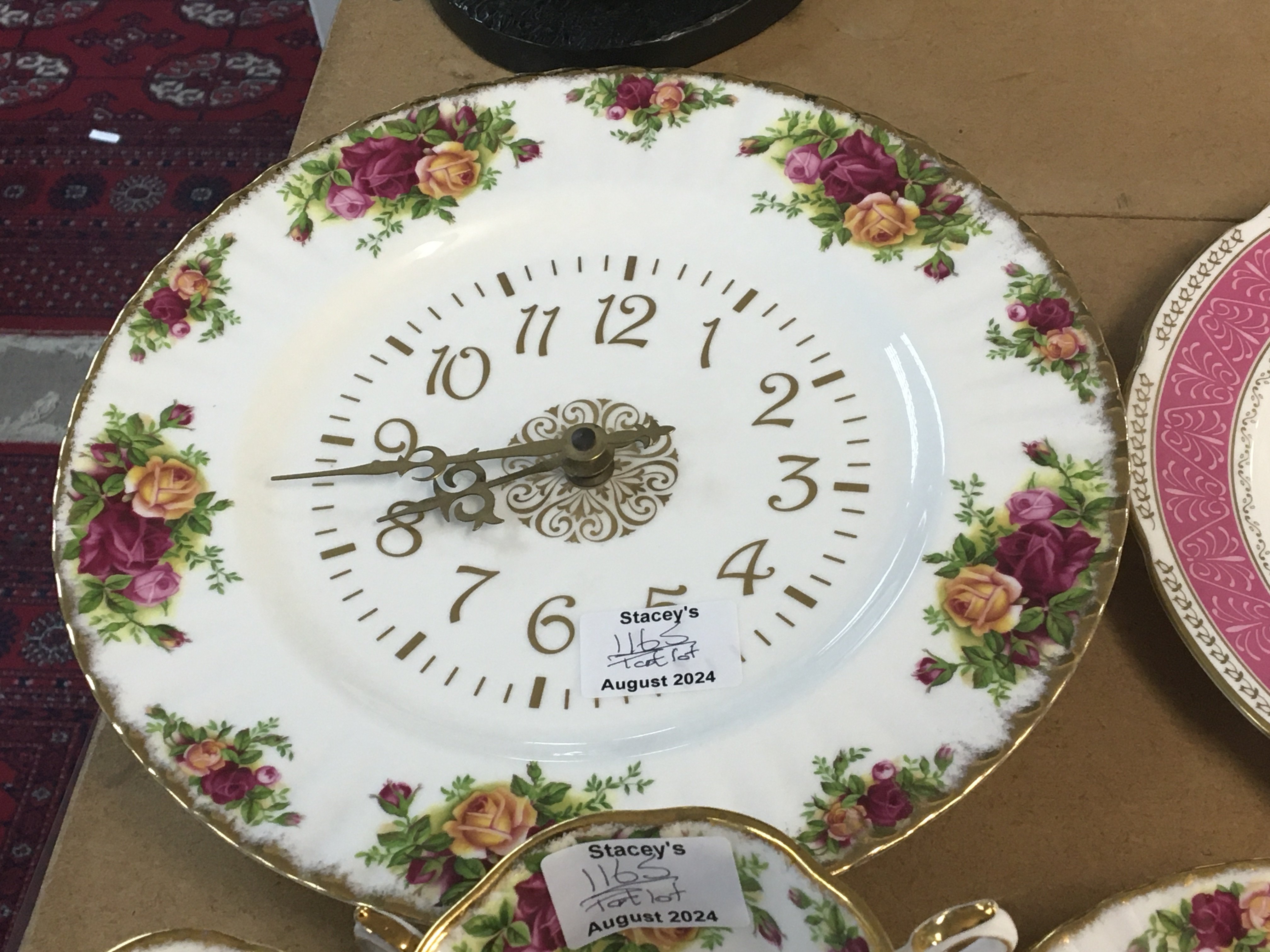 A Royal Albert Old English Country Rose porcelain tea set six place setting cups sauces side plates sugar bowl and a matching wall clock and Royal Horticulture Society plate. No obvious damage.