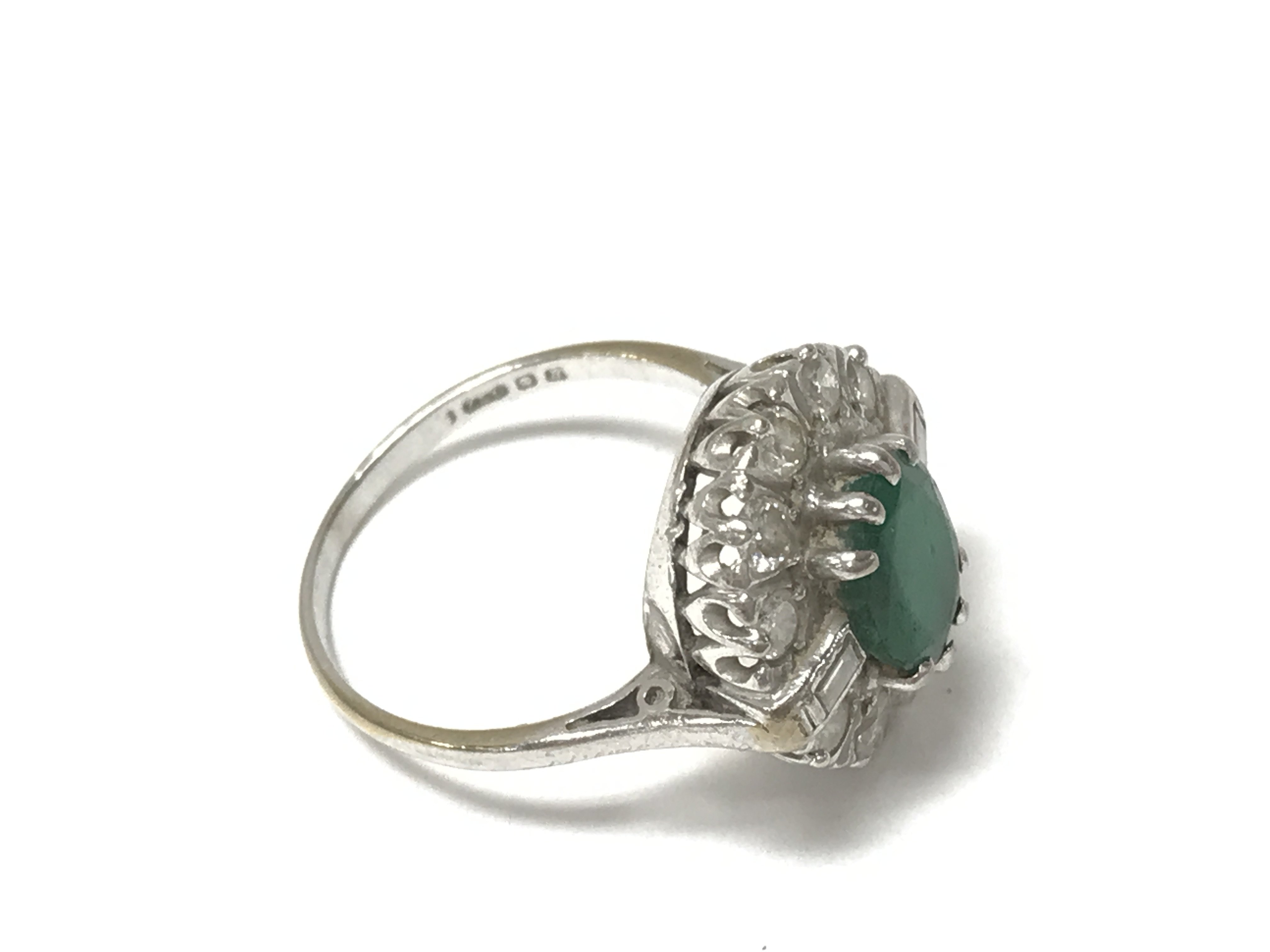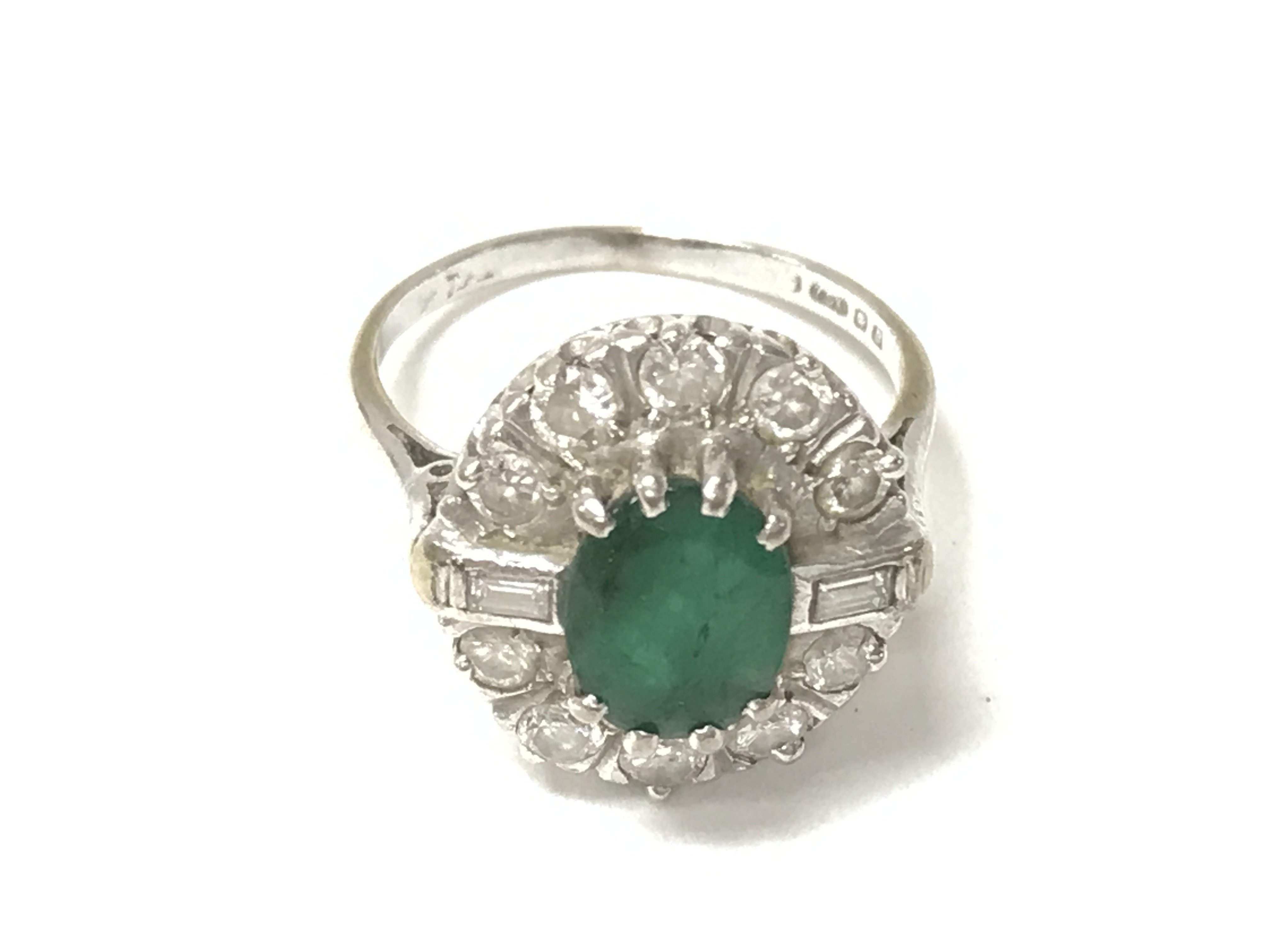 An 18ct white gold emerald and diamond ring. 5.30g and size N.