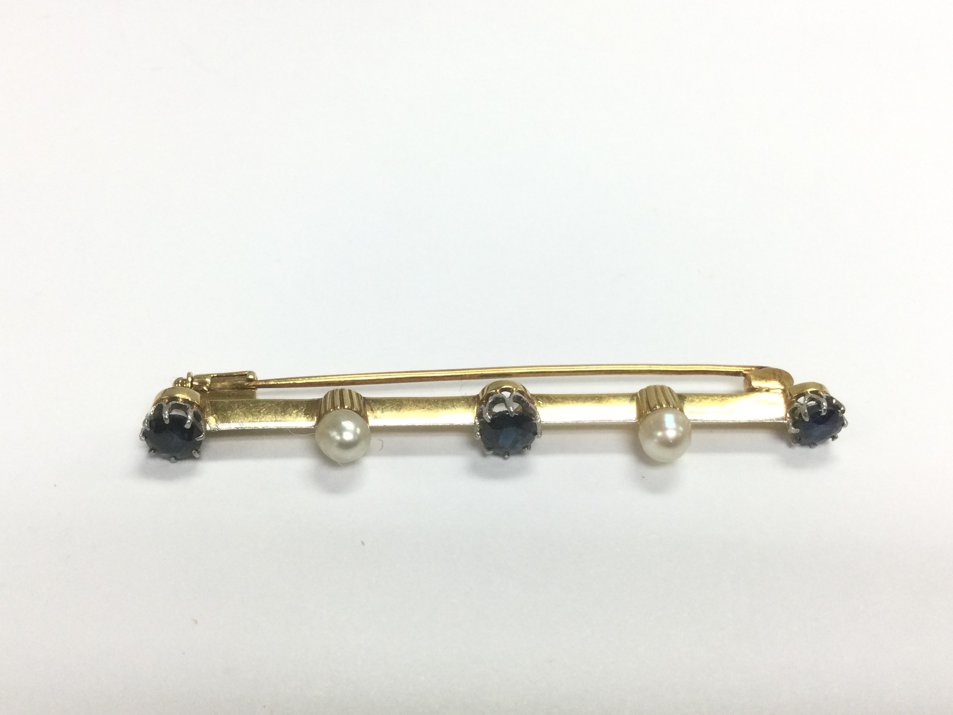 A gold bar brooch set with sapphires and pearls, approx 5.6g. Shipping category A.