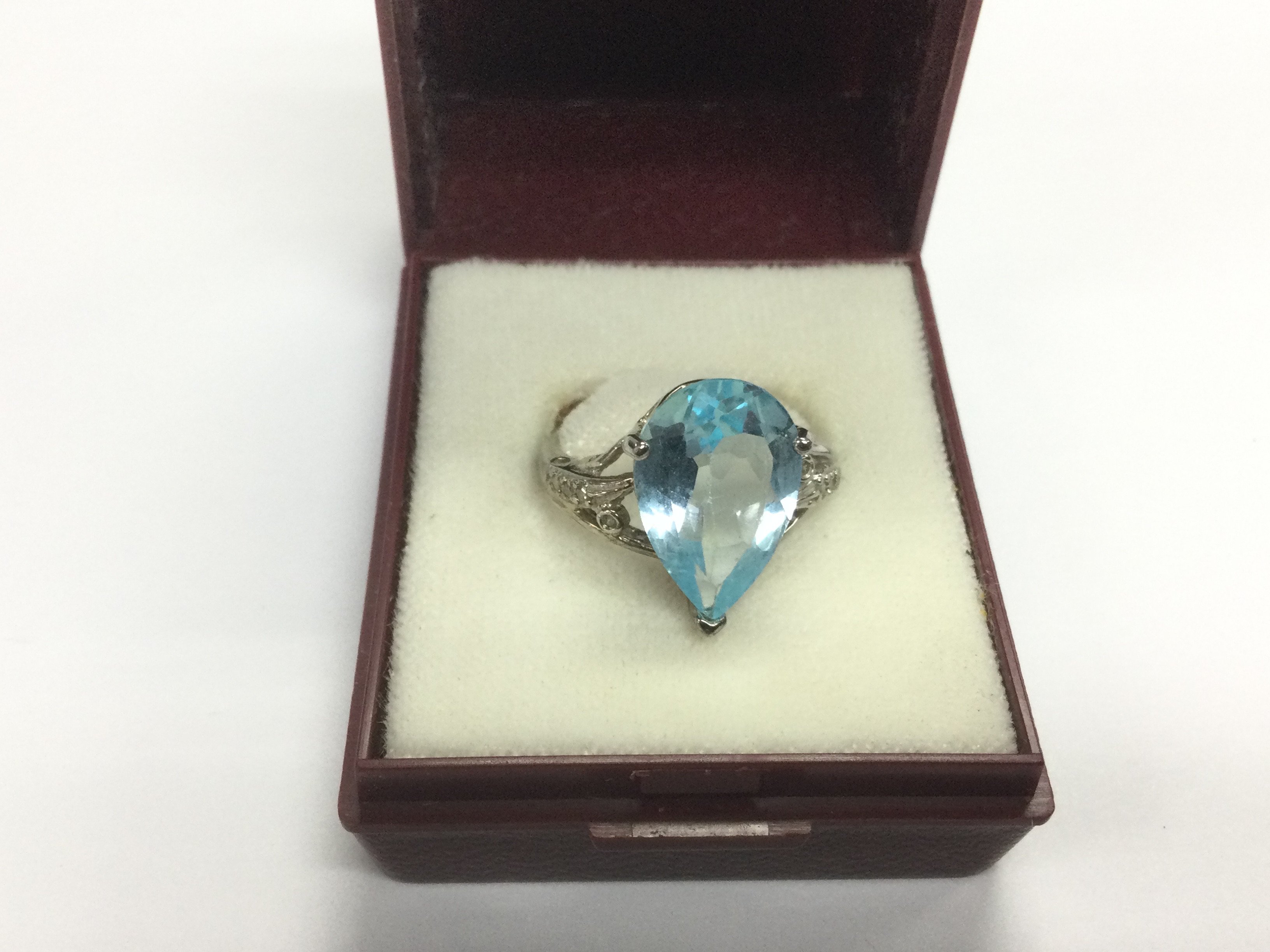 A 10k white gold ring set with a topaz, approx 4g and approx size M. Shipping category A.
