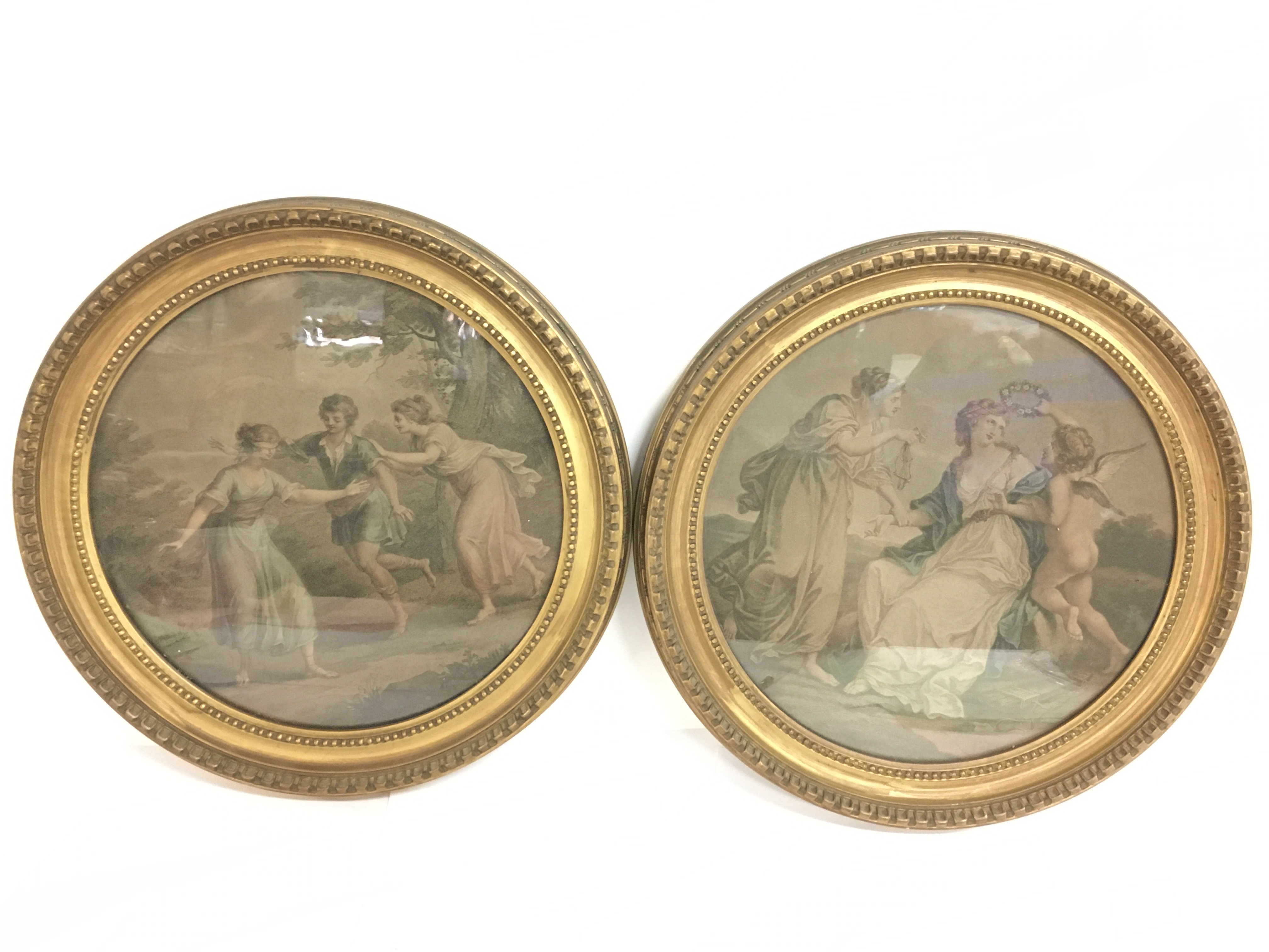 A pair of 19th century classical style circular framed engraving scenes, 35cm in diameter. This lot cannot be posted