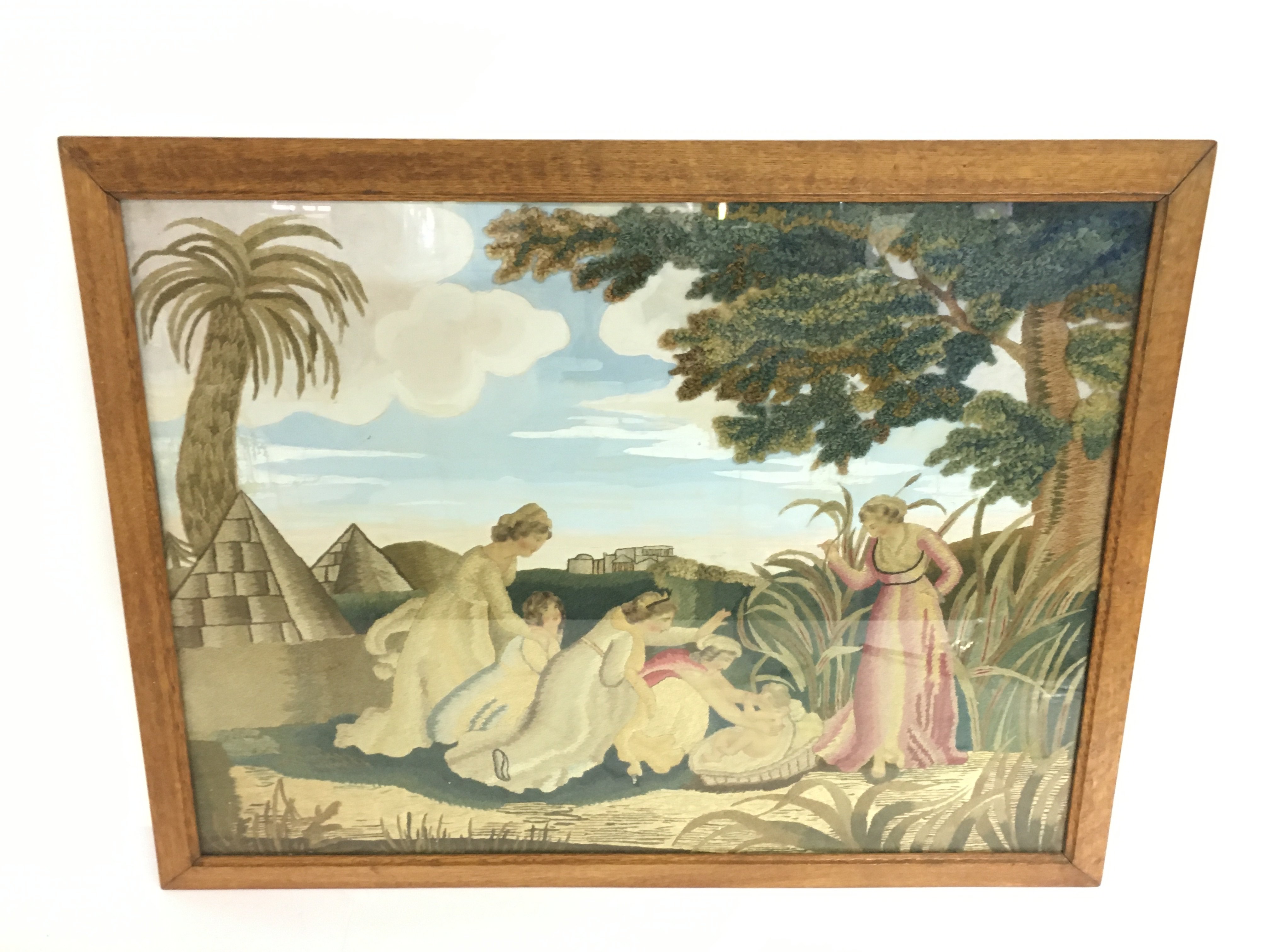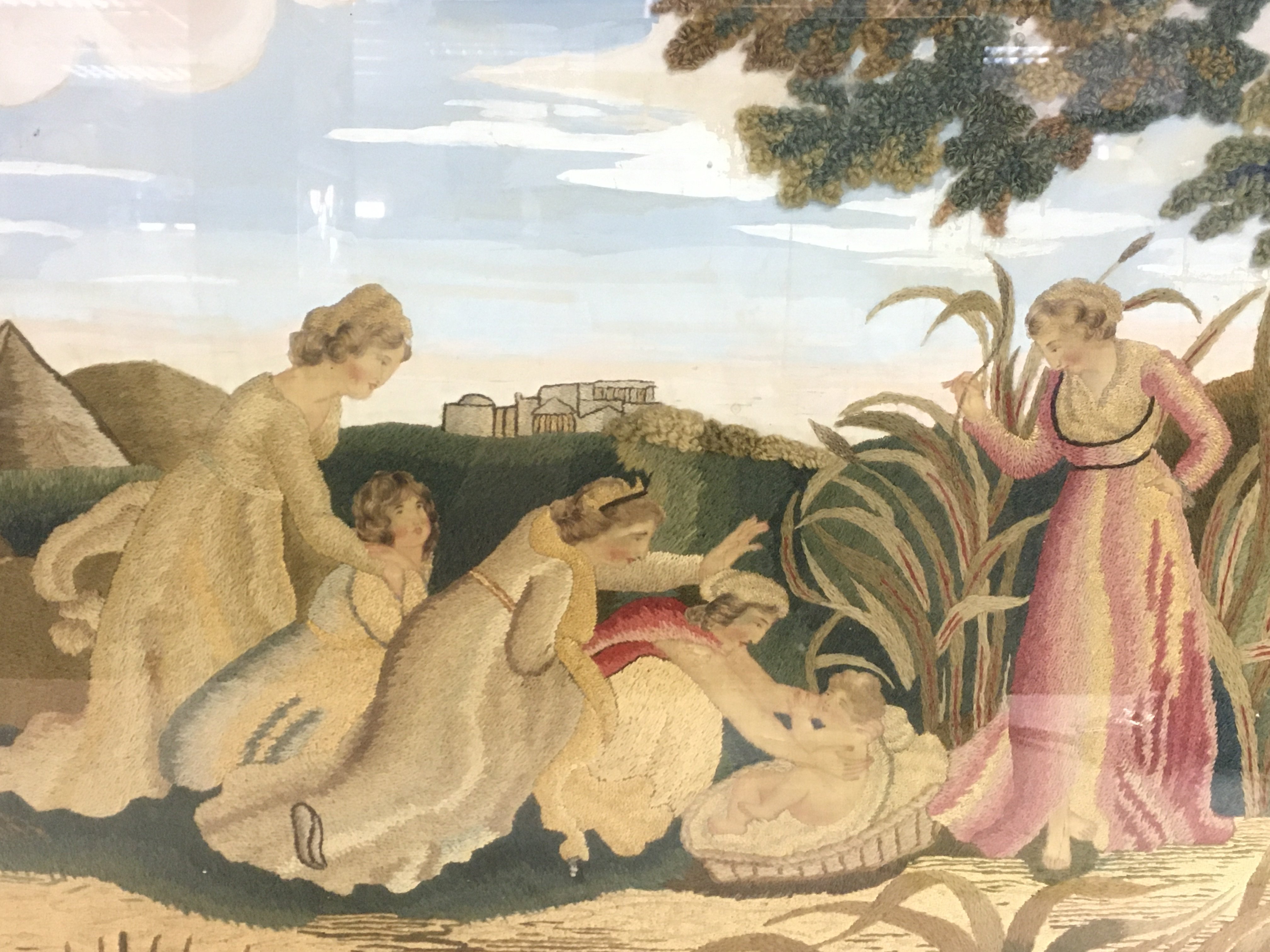 An oak framed tapestry of a middle eastern scene depicting ladies admiring a young child, with a watercolour sky background. Dimensions 60x51cm. This lot cannot be posted