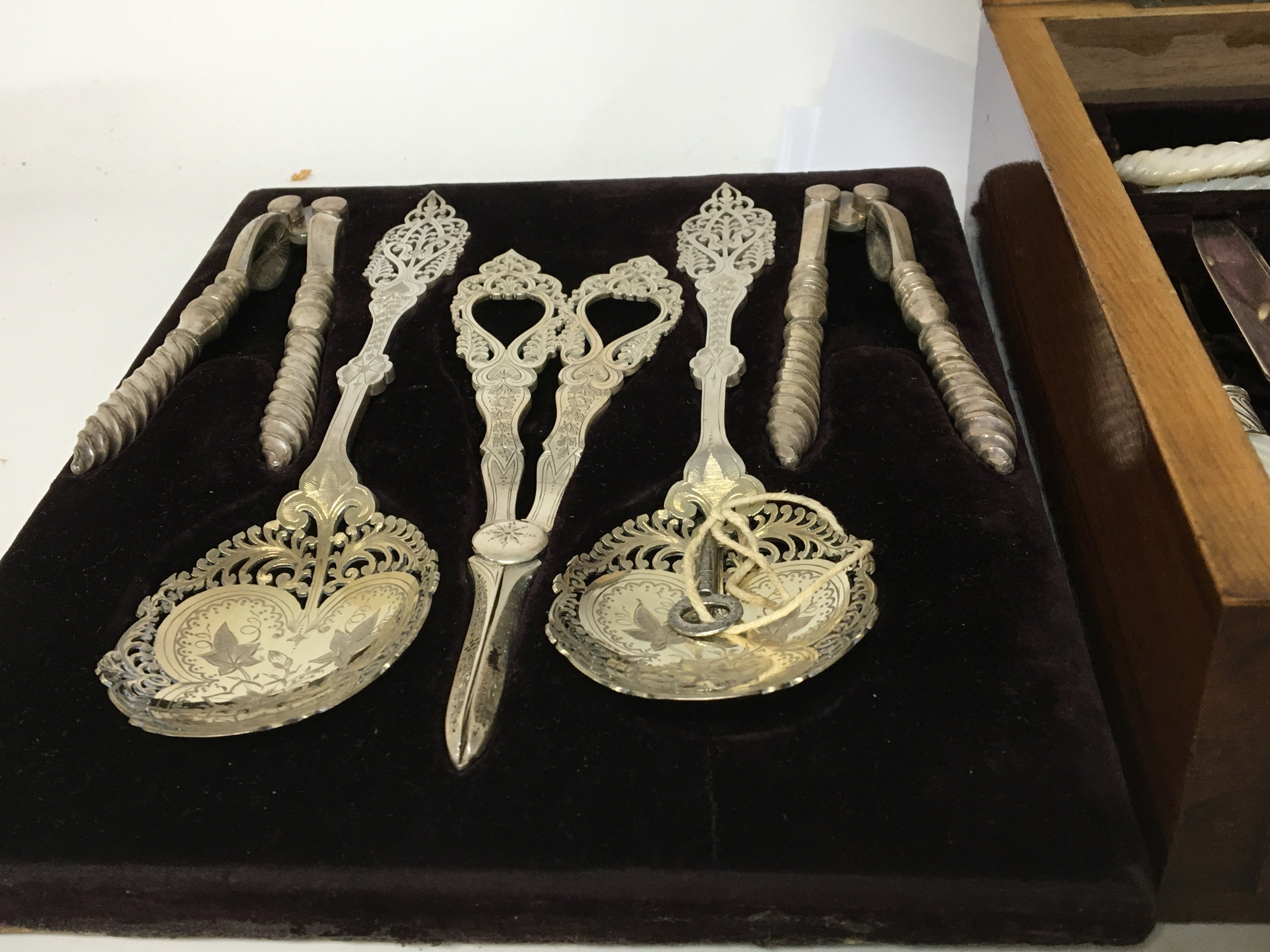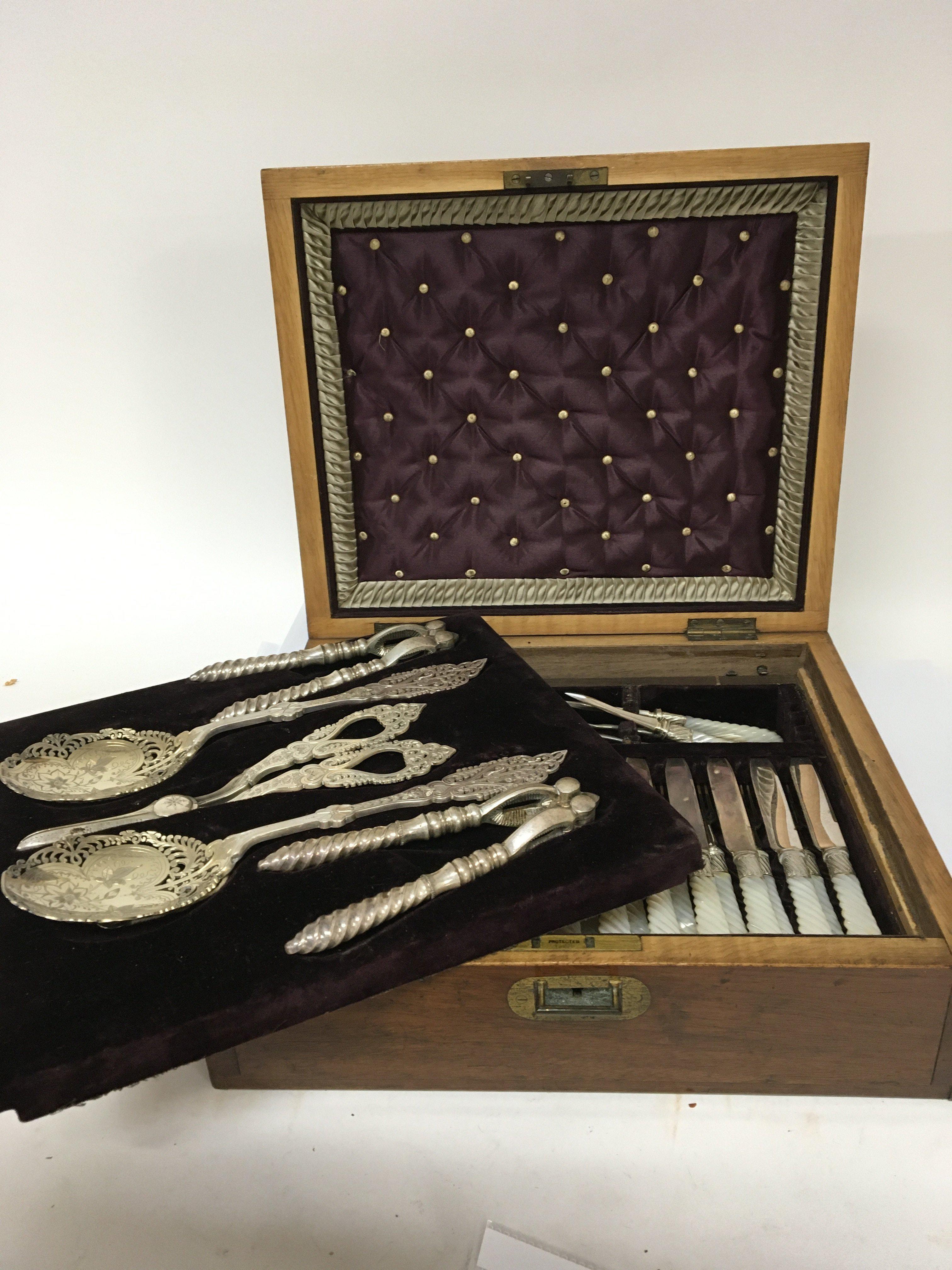 A Quality cased Edwardian silver plated and mother of pearl handled nut and fruit set twelve knifes and folks serving implements in a well fitted interior.