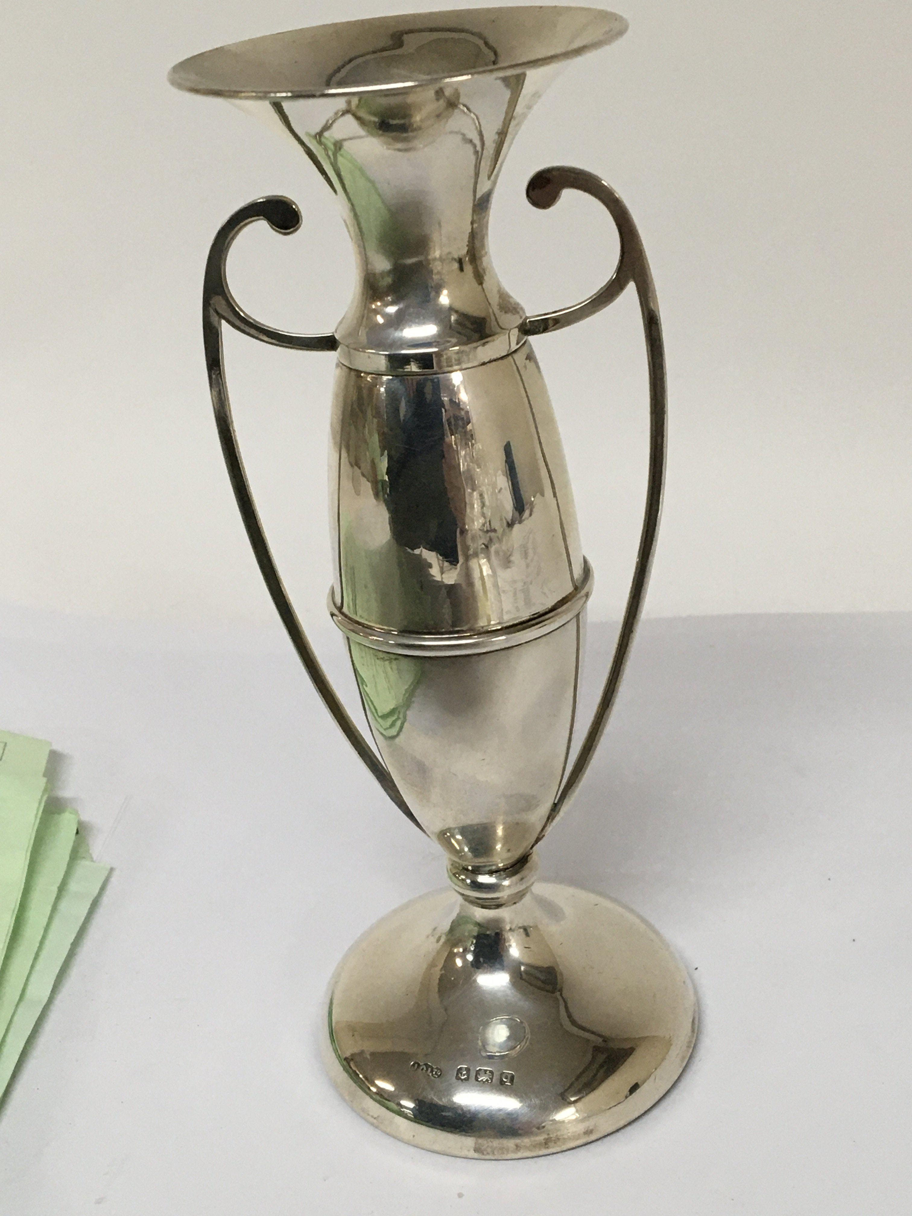 A modern design silver vase loaded base with raised handles Birmingham hallmarks. Height 18cm NO RESERVE