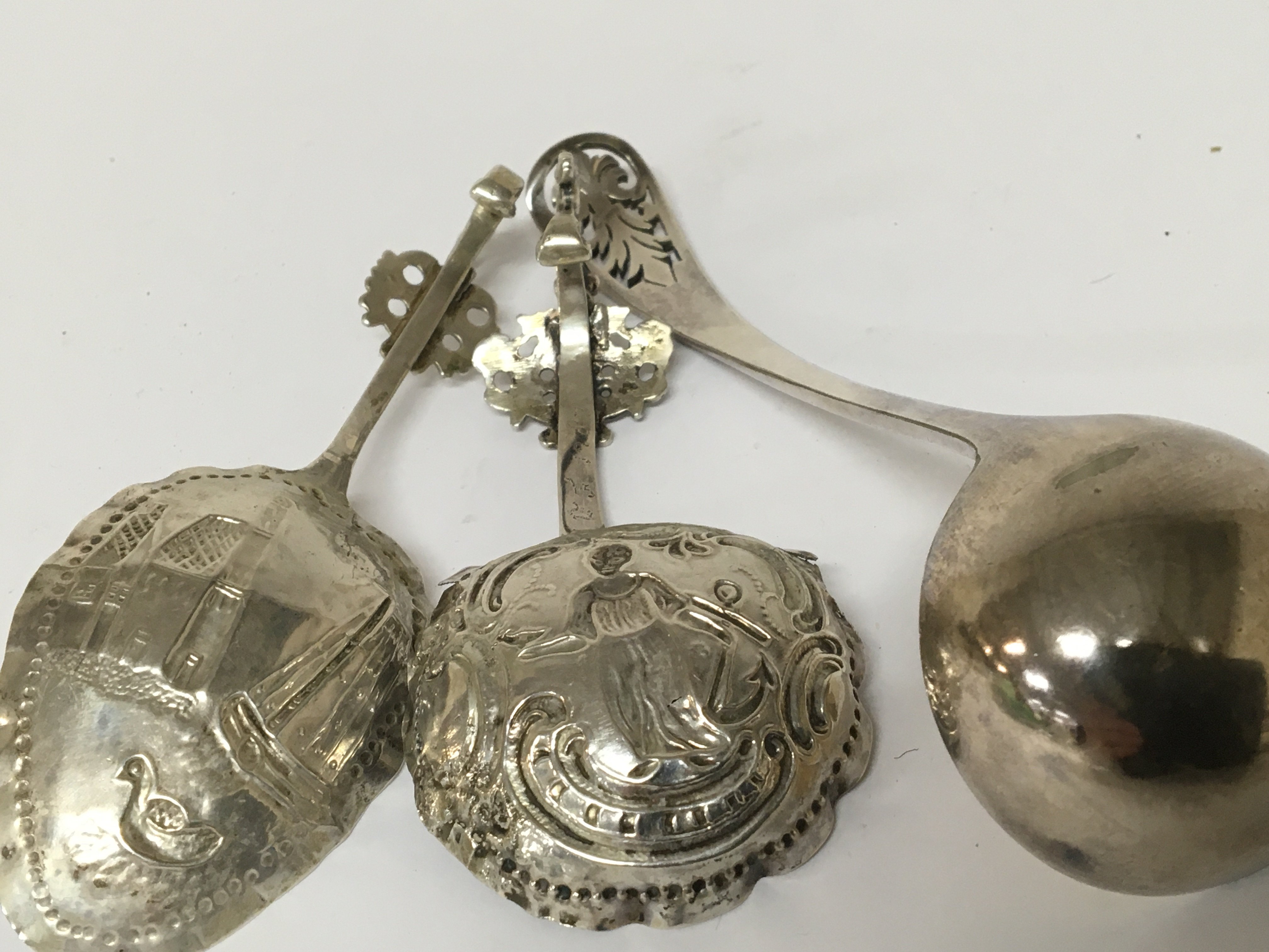Two Continental silver spoons repousse decorated with figures and buildings and an unmarked sugar spoon. (3) NO RESERVE