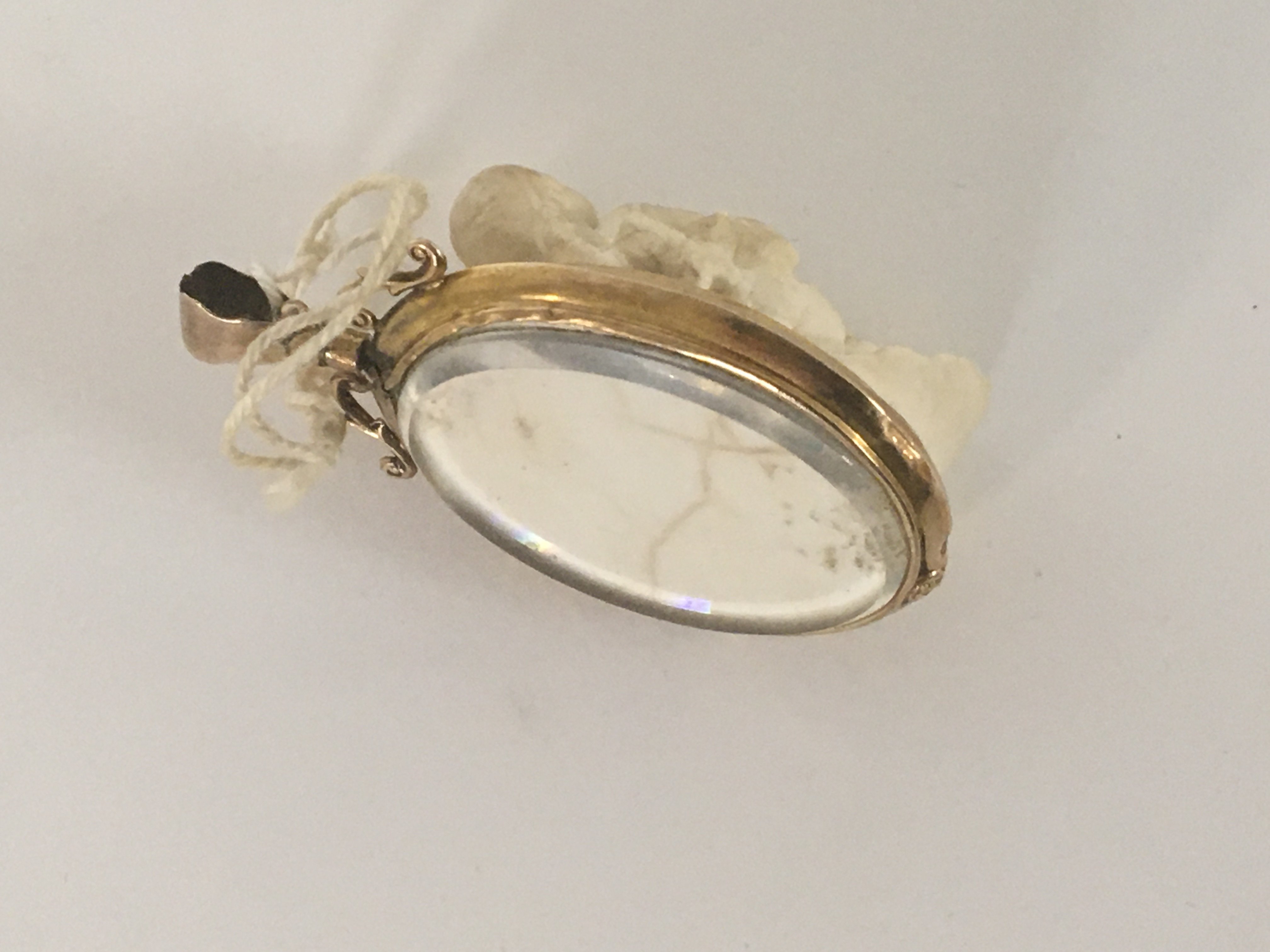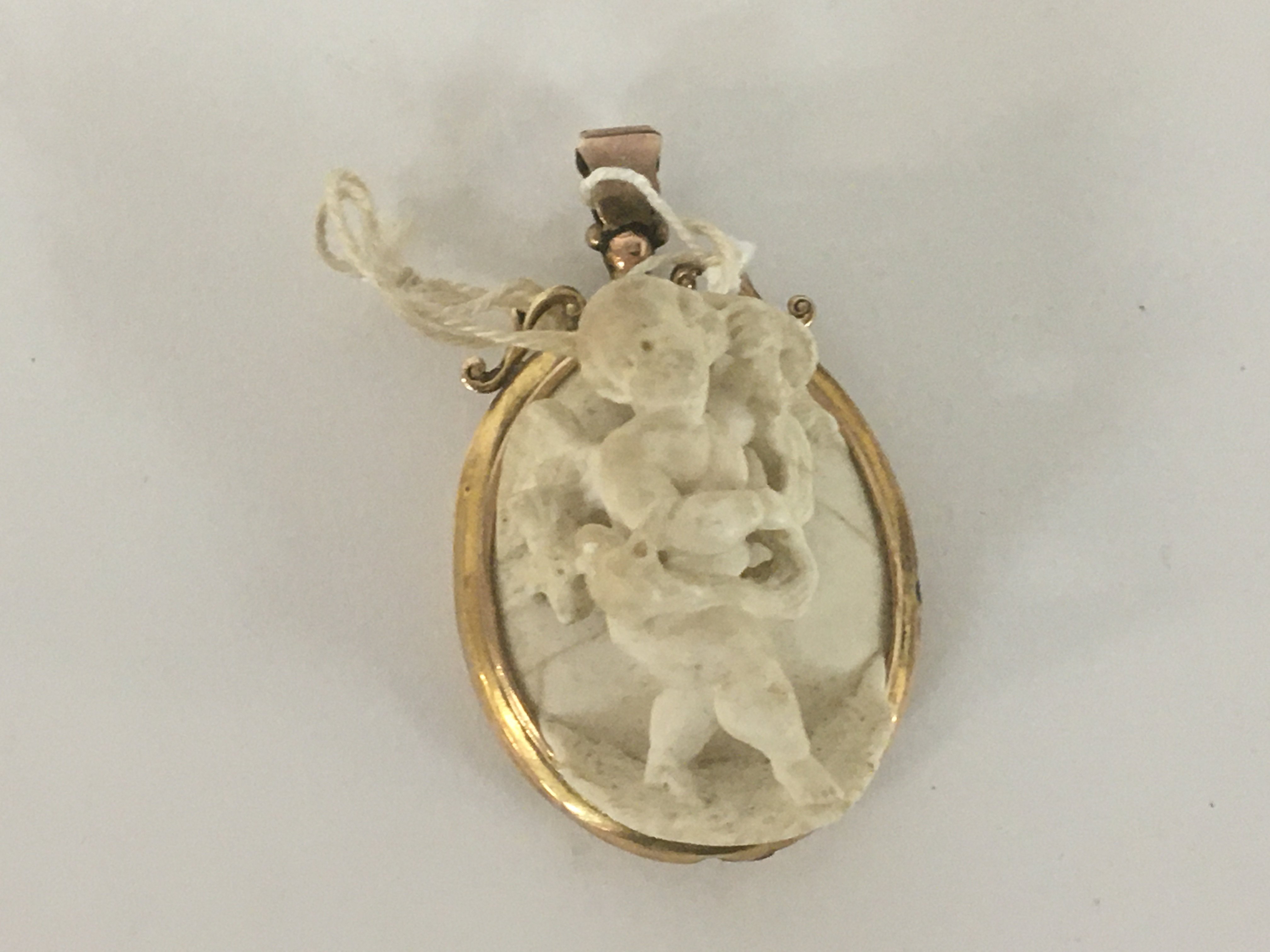 A Victorian three dimensional carved white stone pendent in the form of a winged cherub in a 9carat gold mount. 5cm in length.