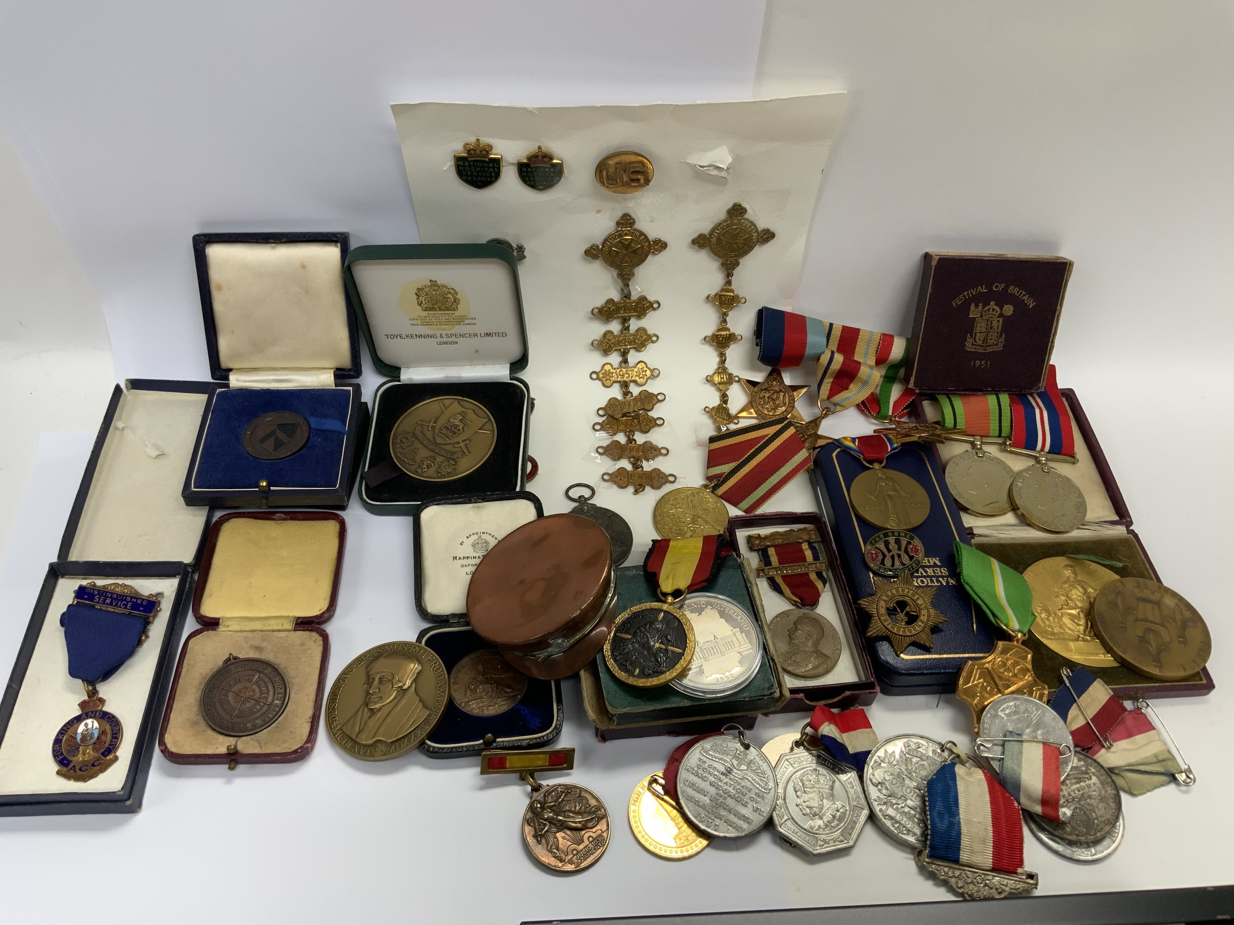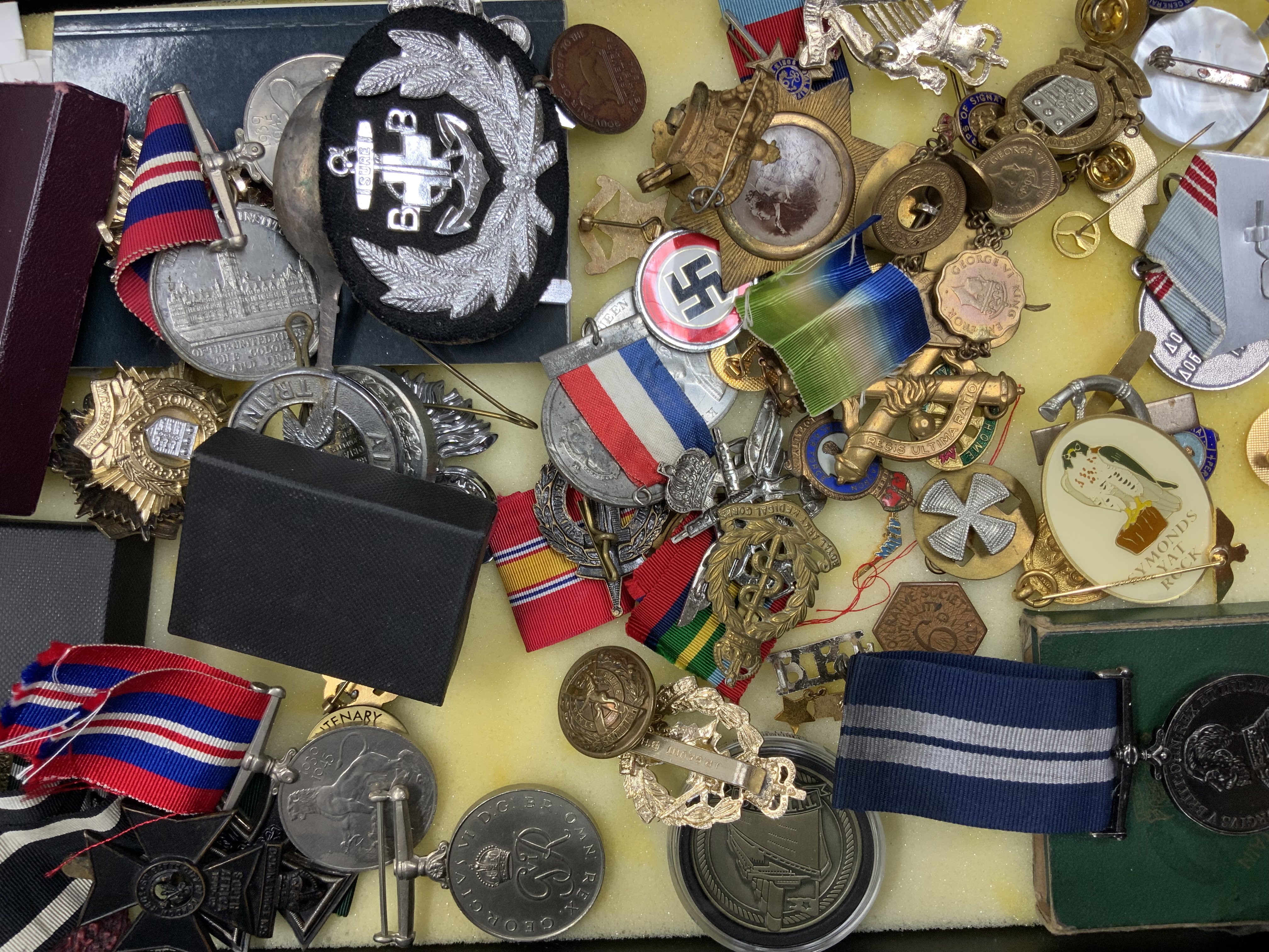 A mixed collection of militaria, badges, pins etc.. (C)