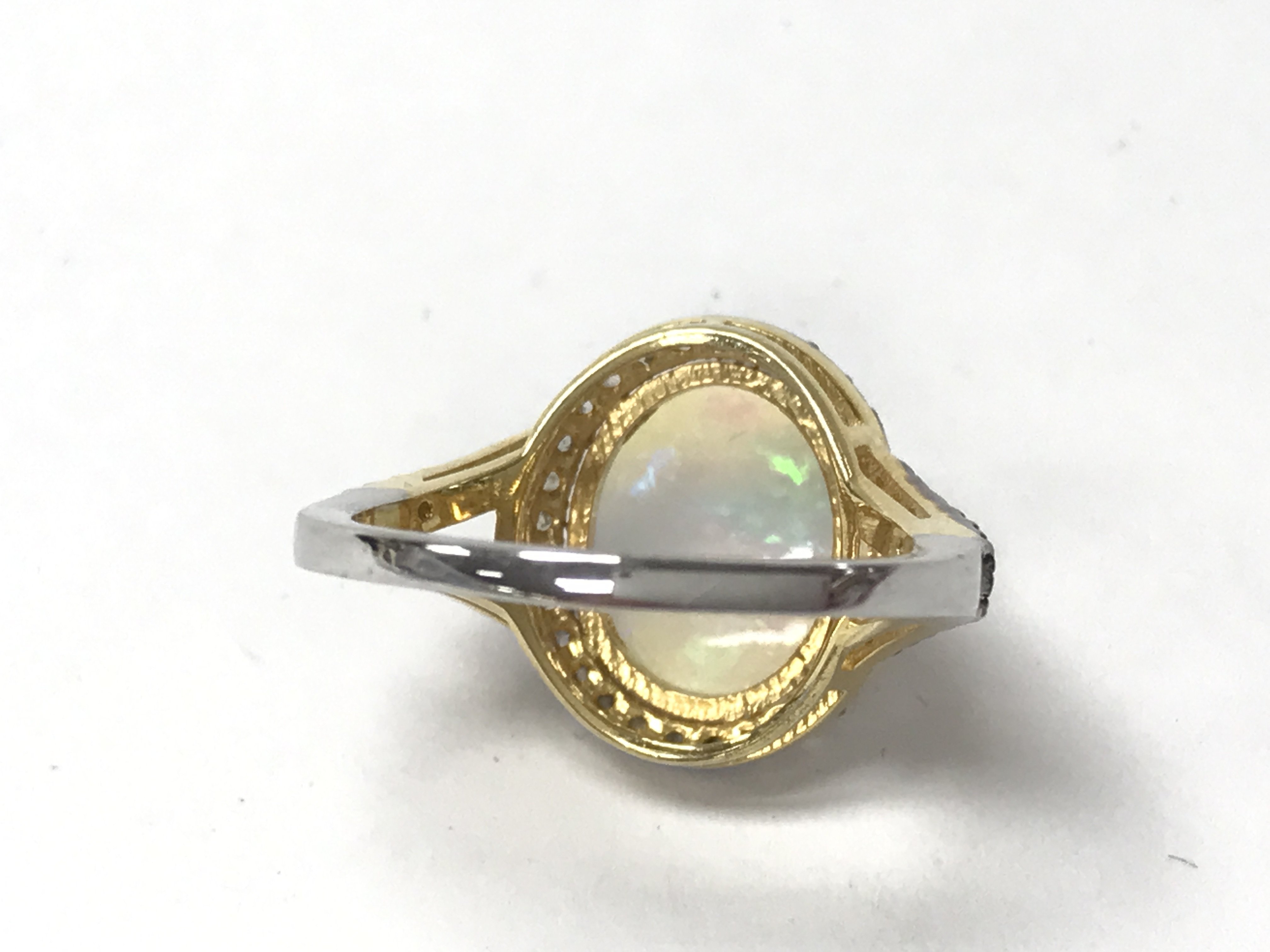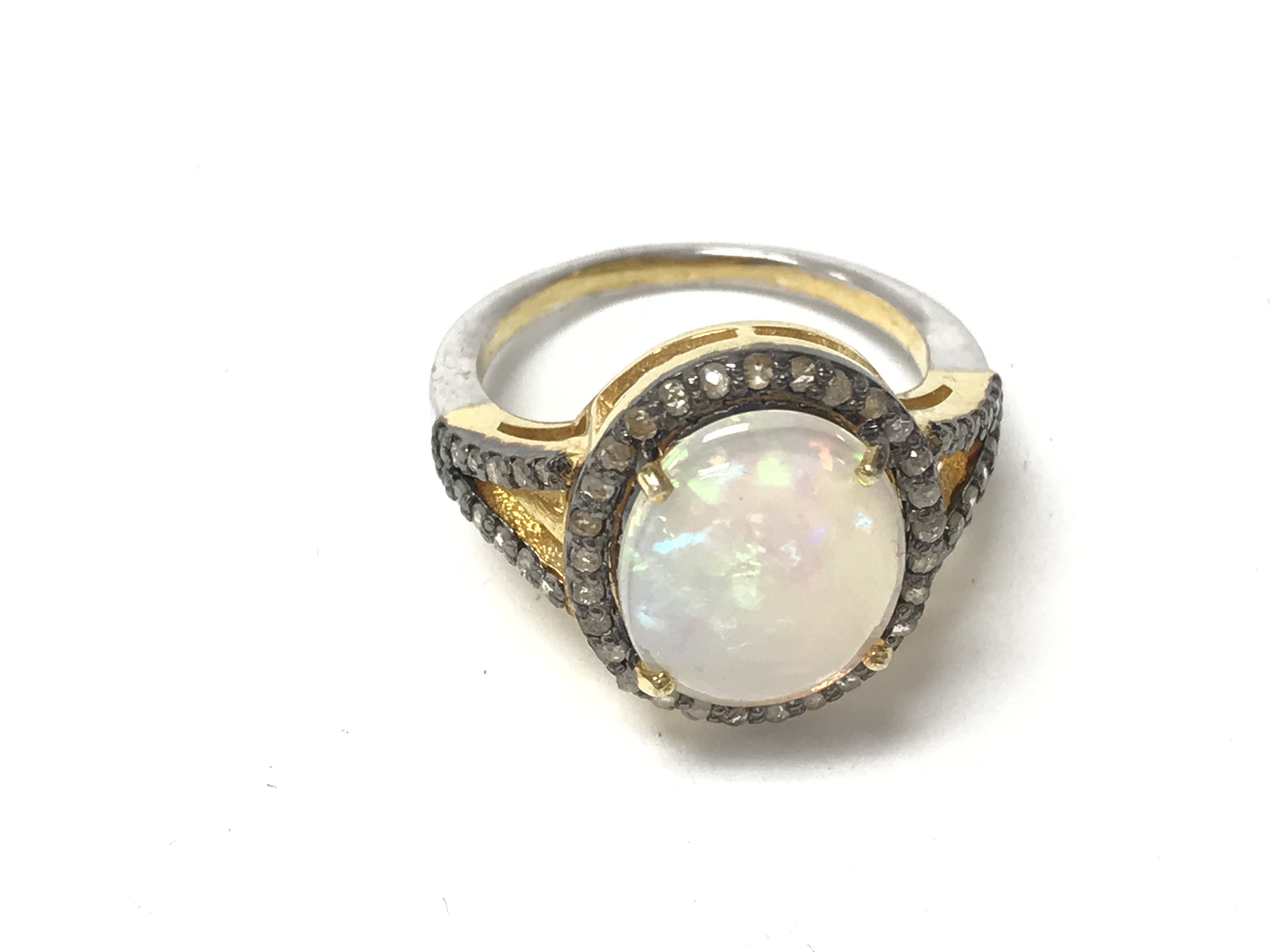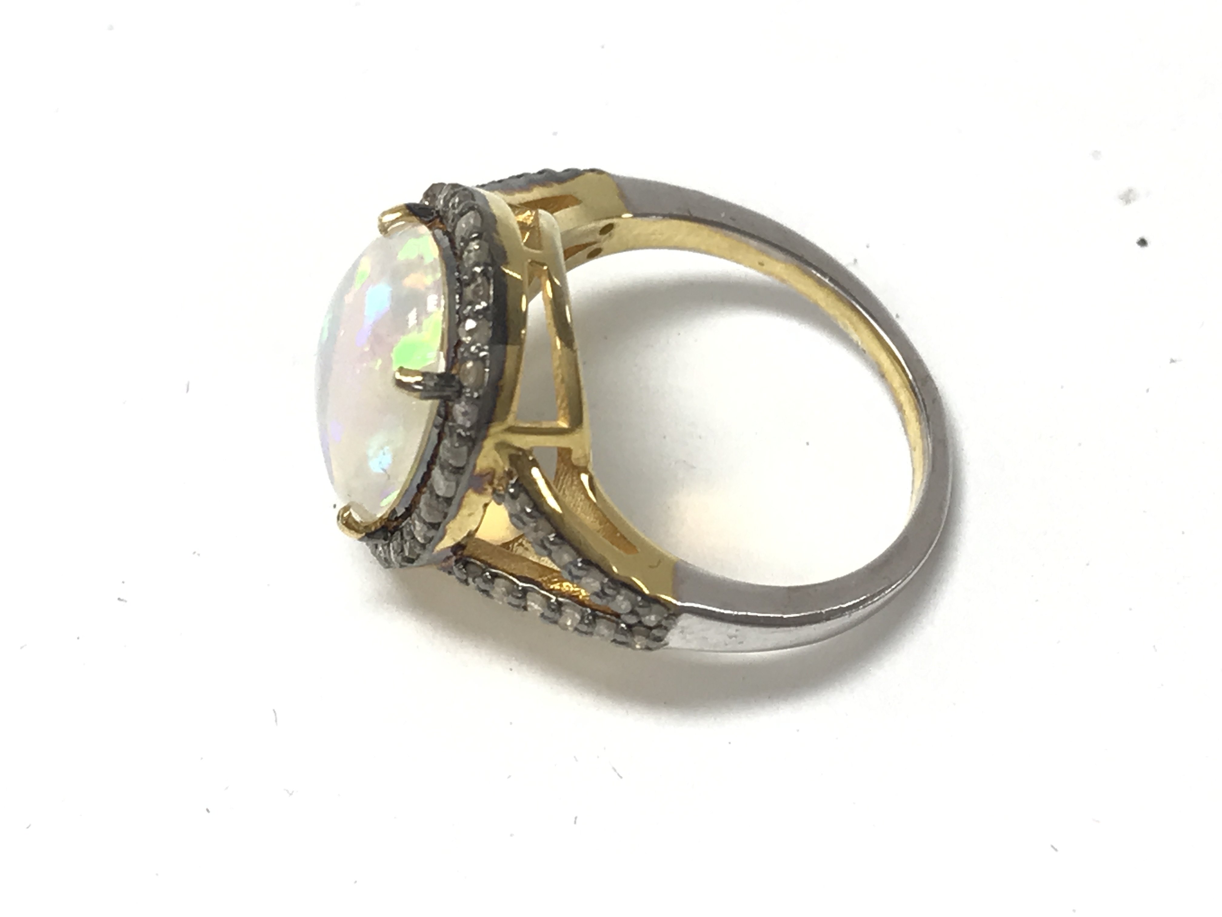A diamond and Opal oval cluster ring. Opal approx 1.9ct and diamond 0.38 total. Ring size N. Postage A