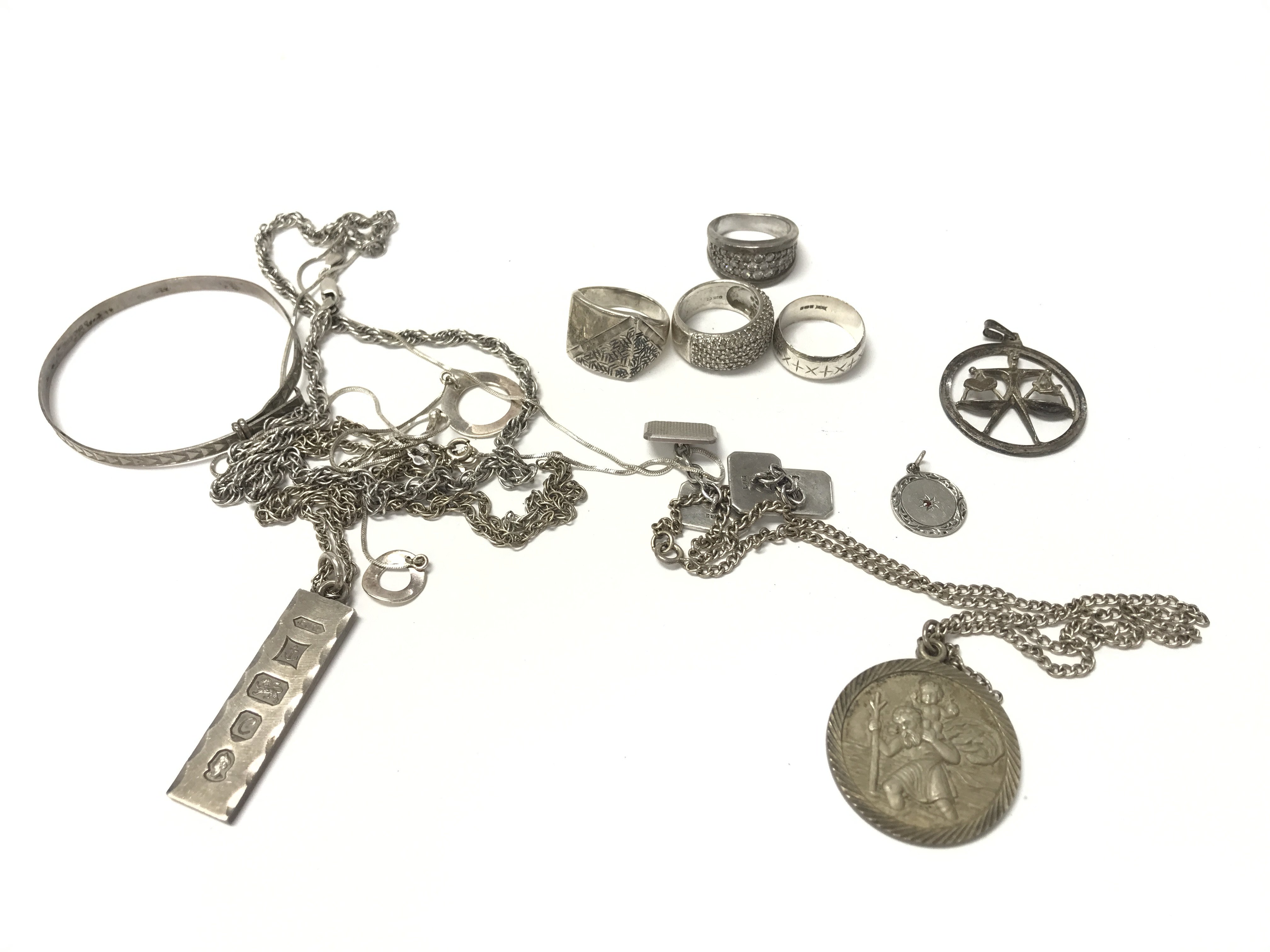 A collection of assorted silver items including rings cufflinks and a silver ingot etc.116.90g total. Postage B