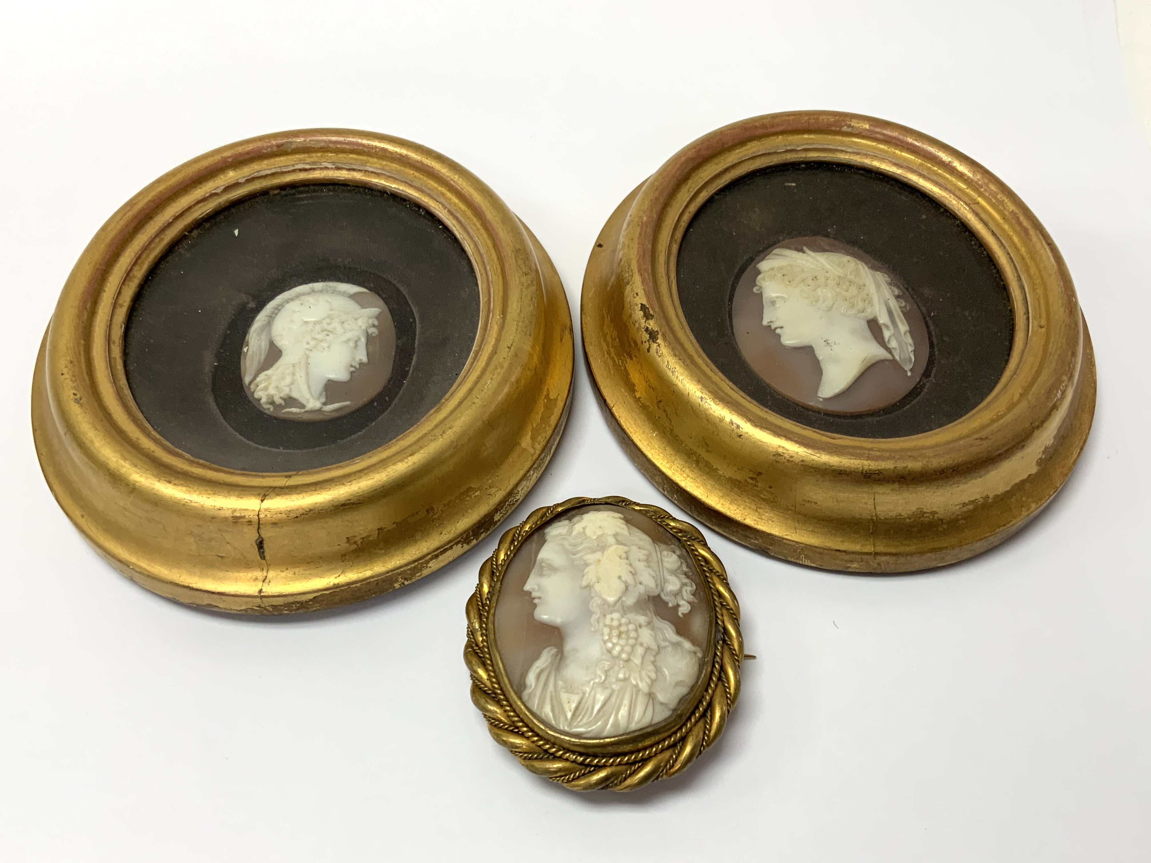 2 Victorian Gilt framed carved shell cameos, gilt mounted shell cameo brooch. (B) NO RESERVE