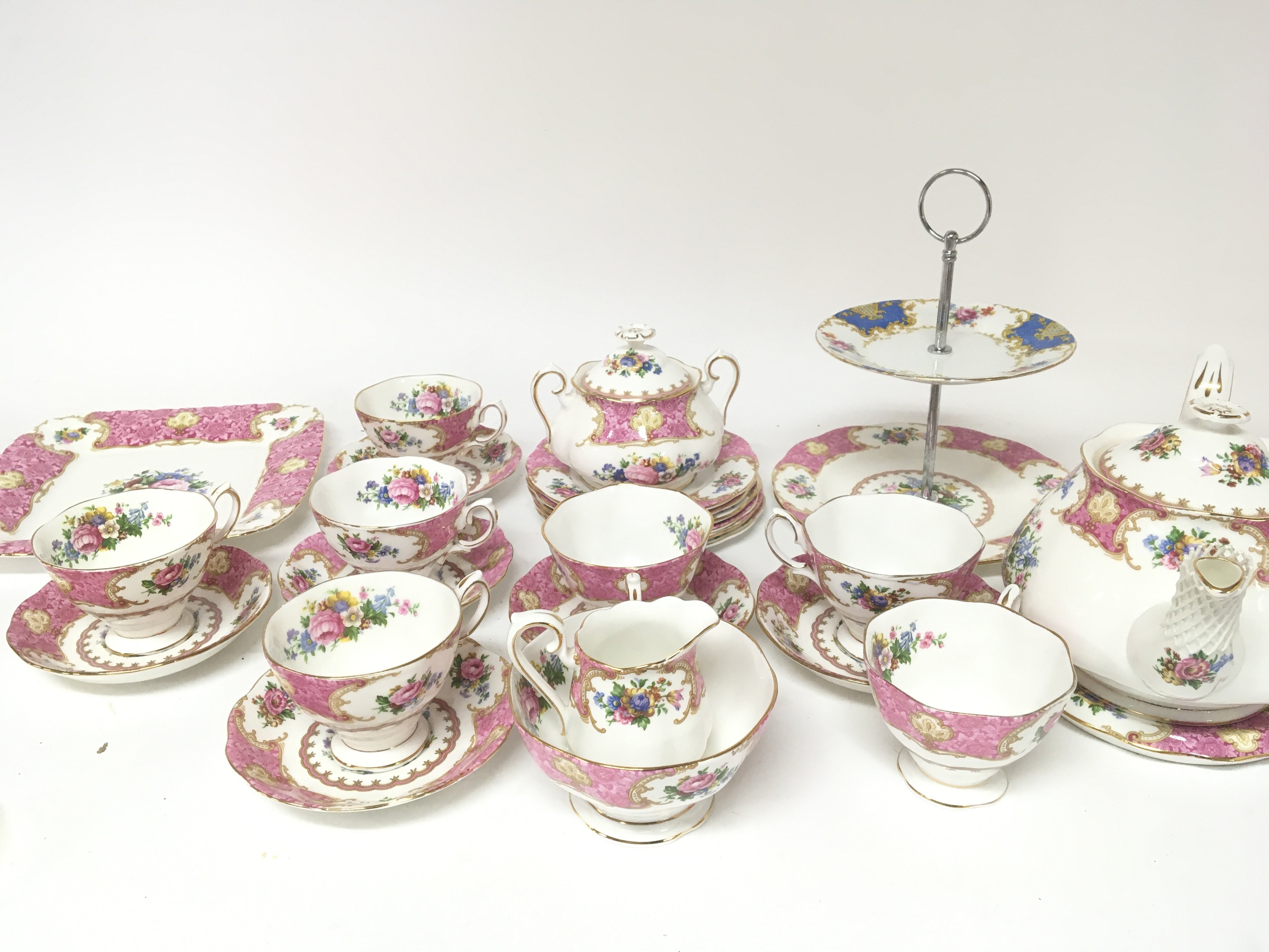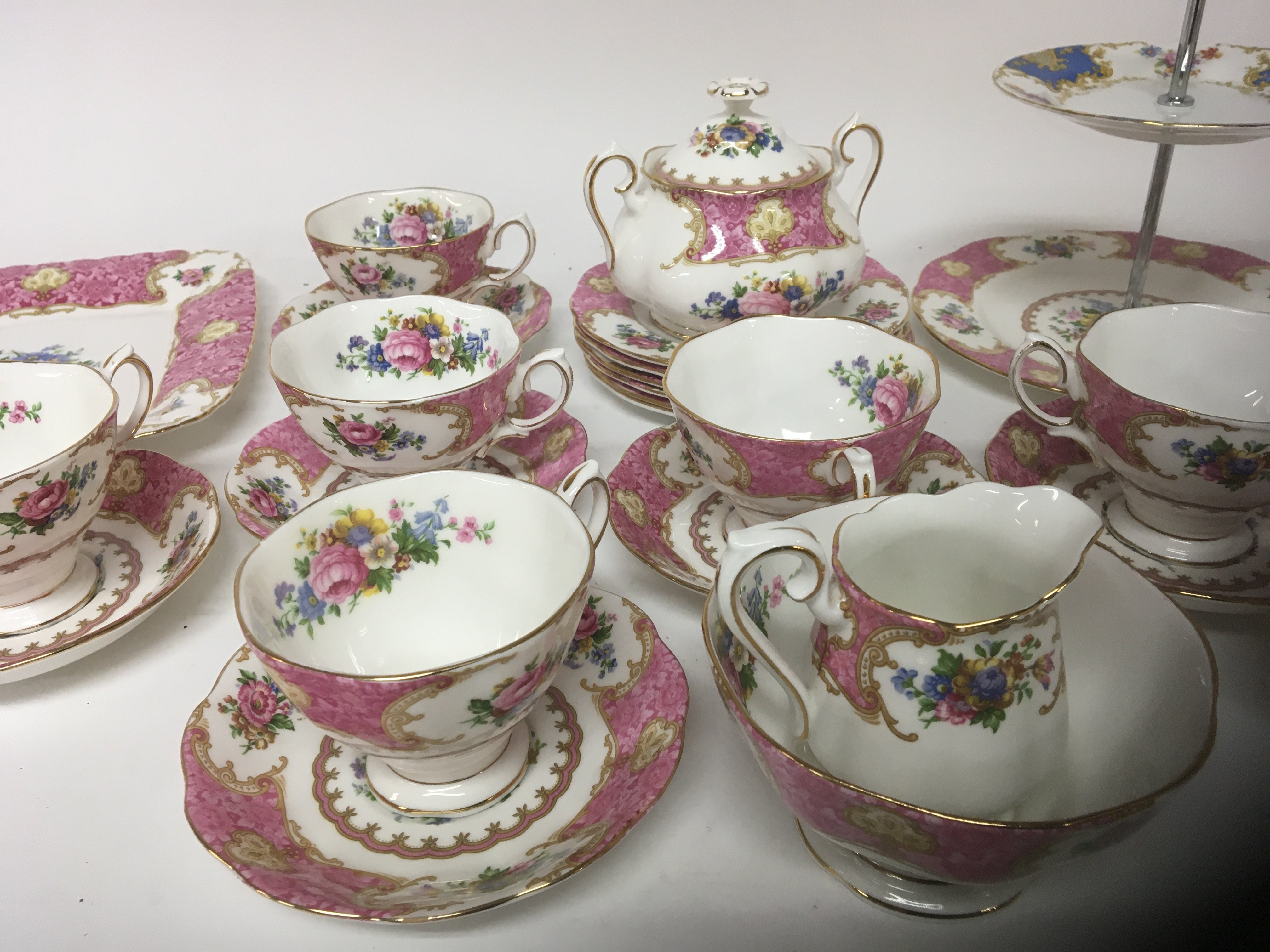 A Royal Albert Lady Carlyle pattern porcelain tea set with pink and patterns of flowers no obvious damage cake stand with a conforming dish.