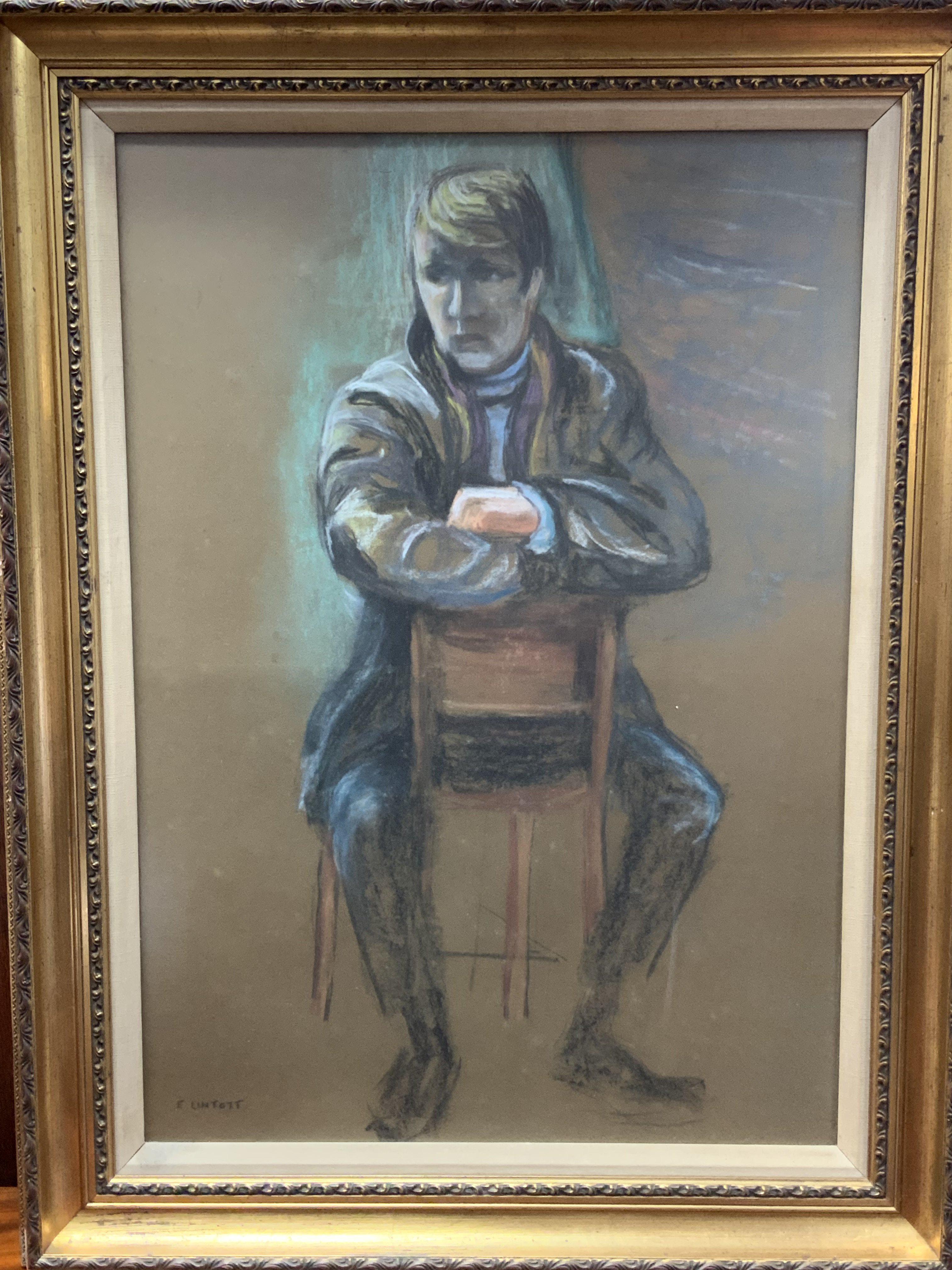 A large pastel drawing of a seated man signed E.Lintott. 90cm x 69cm. NO RESERVE
