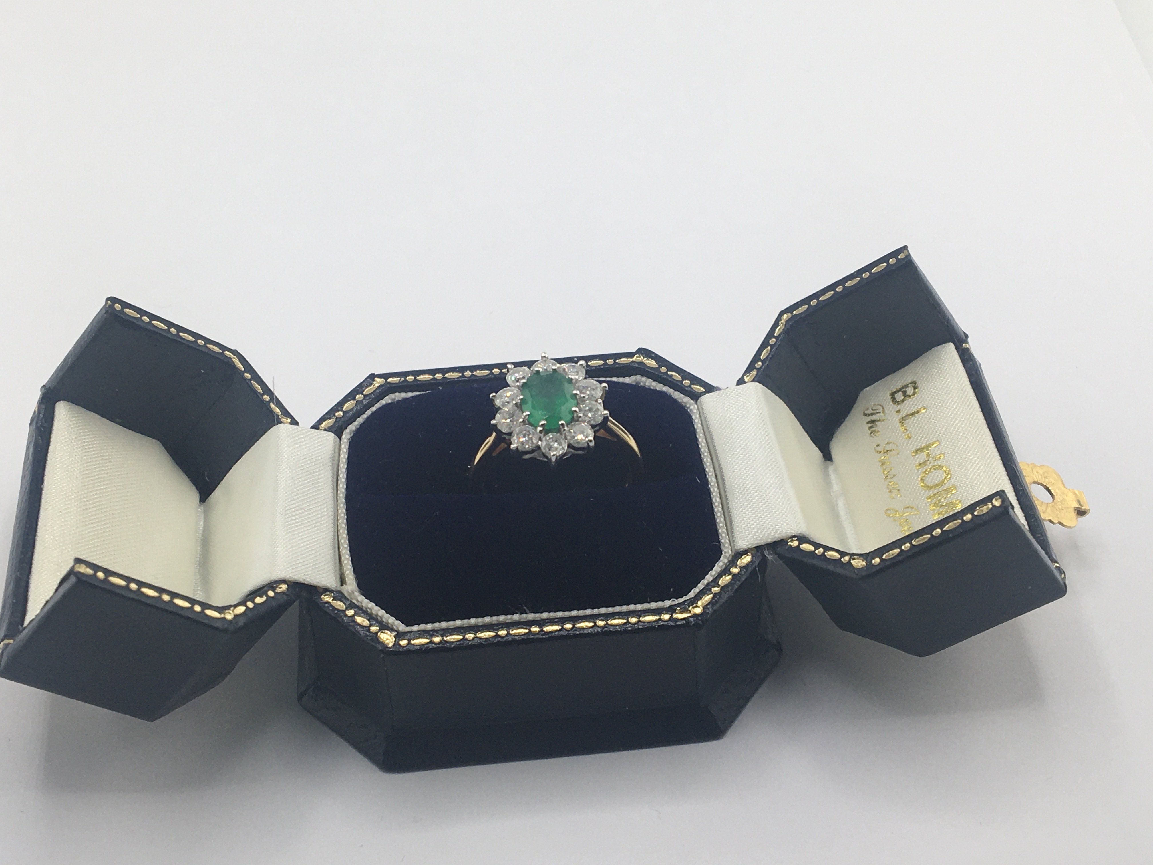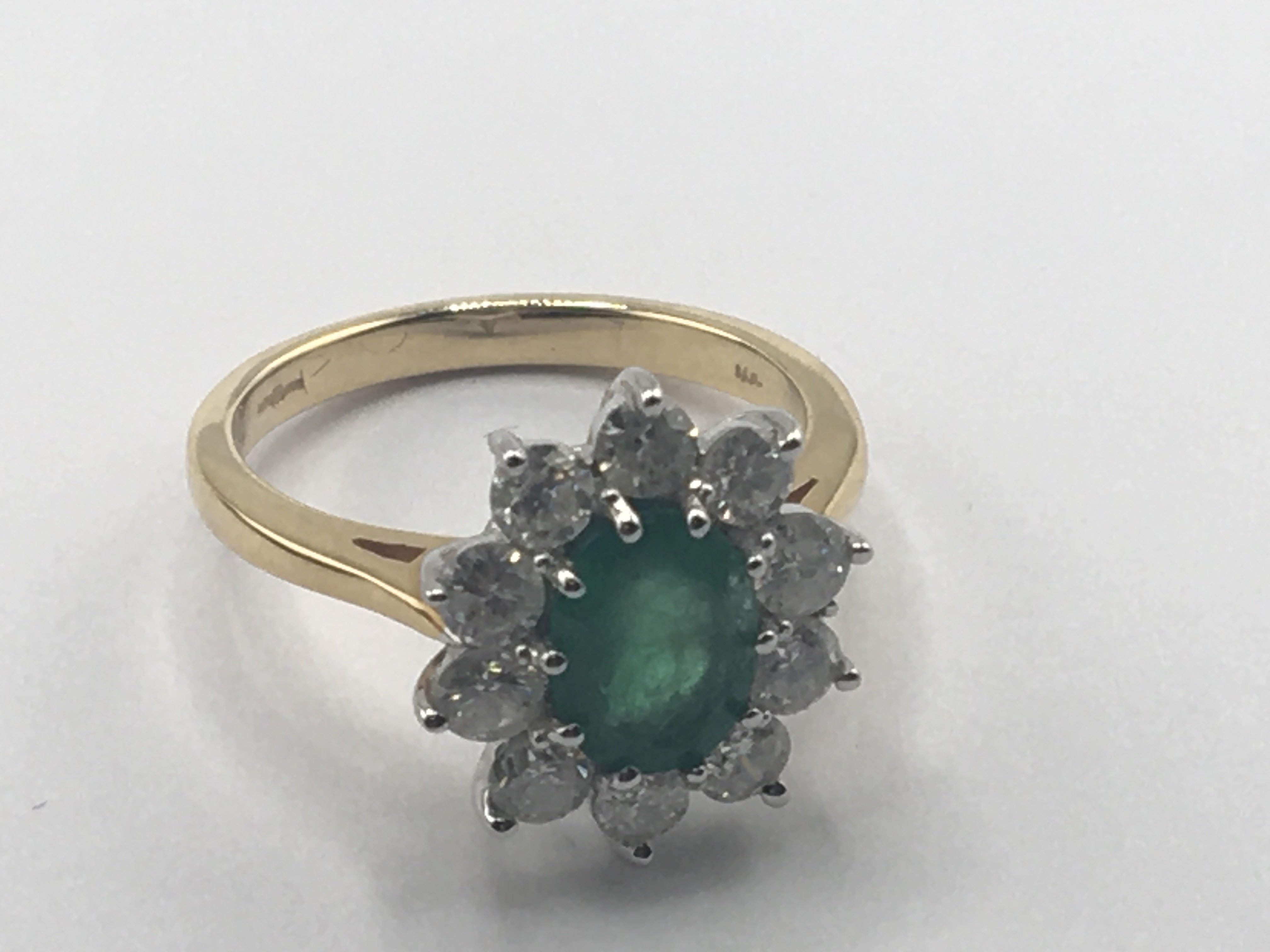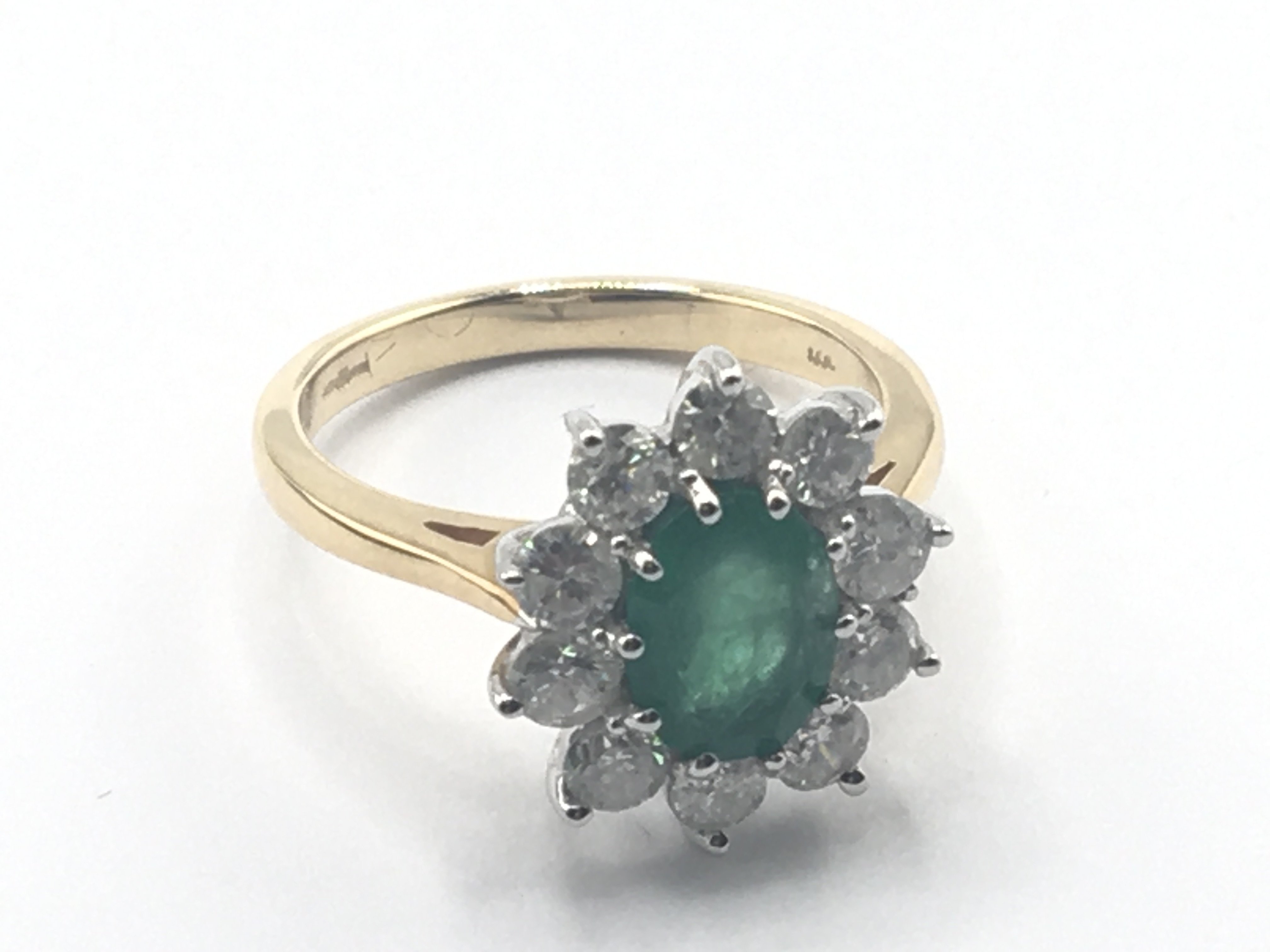 A quality 18carat gold ring set with an emerald flanked by a pattern of brilliant cut diamonds.the emerald approximately 10x7mm each diamond approximately 0.12. Total weight 5g ring size N-O