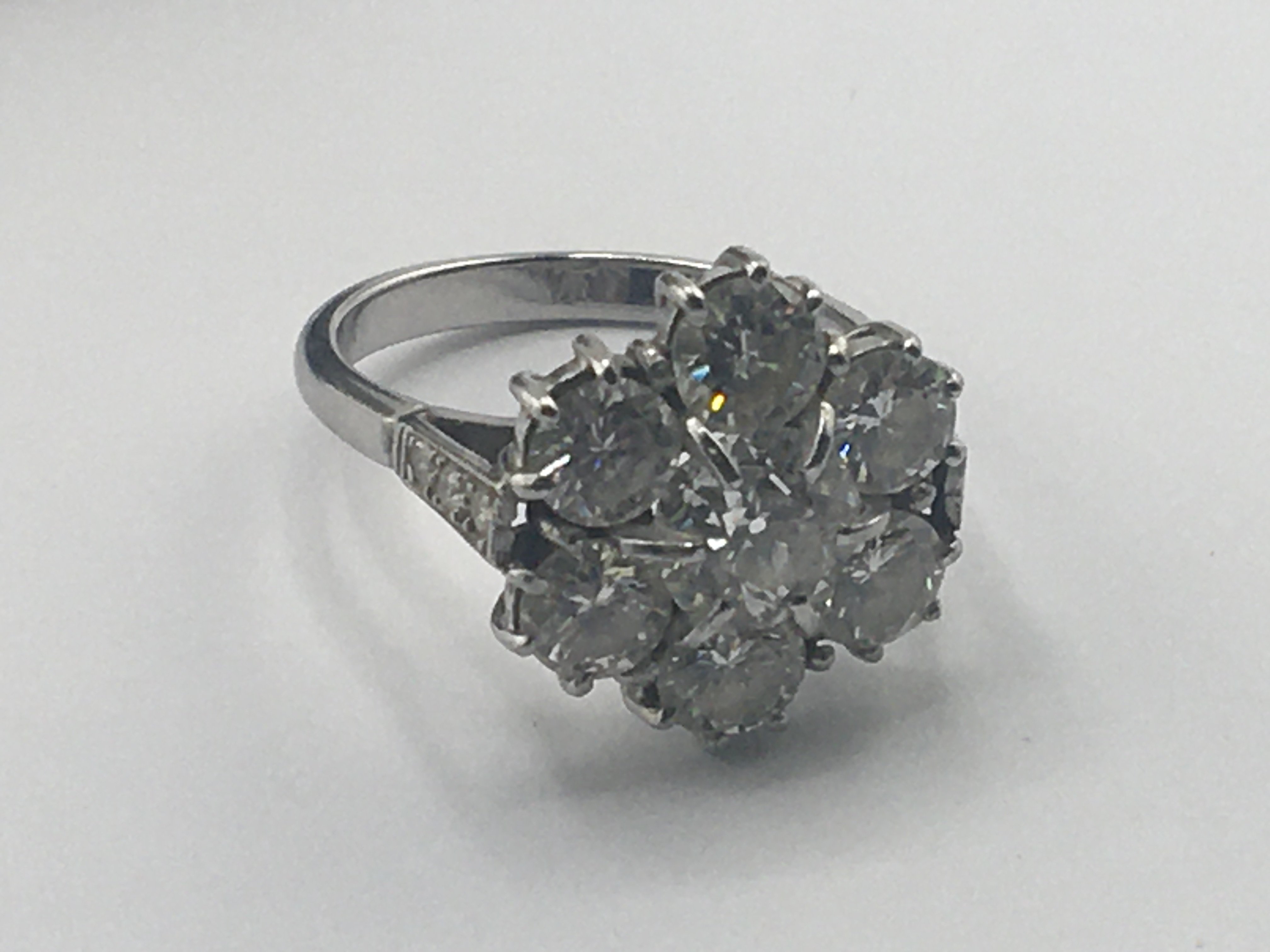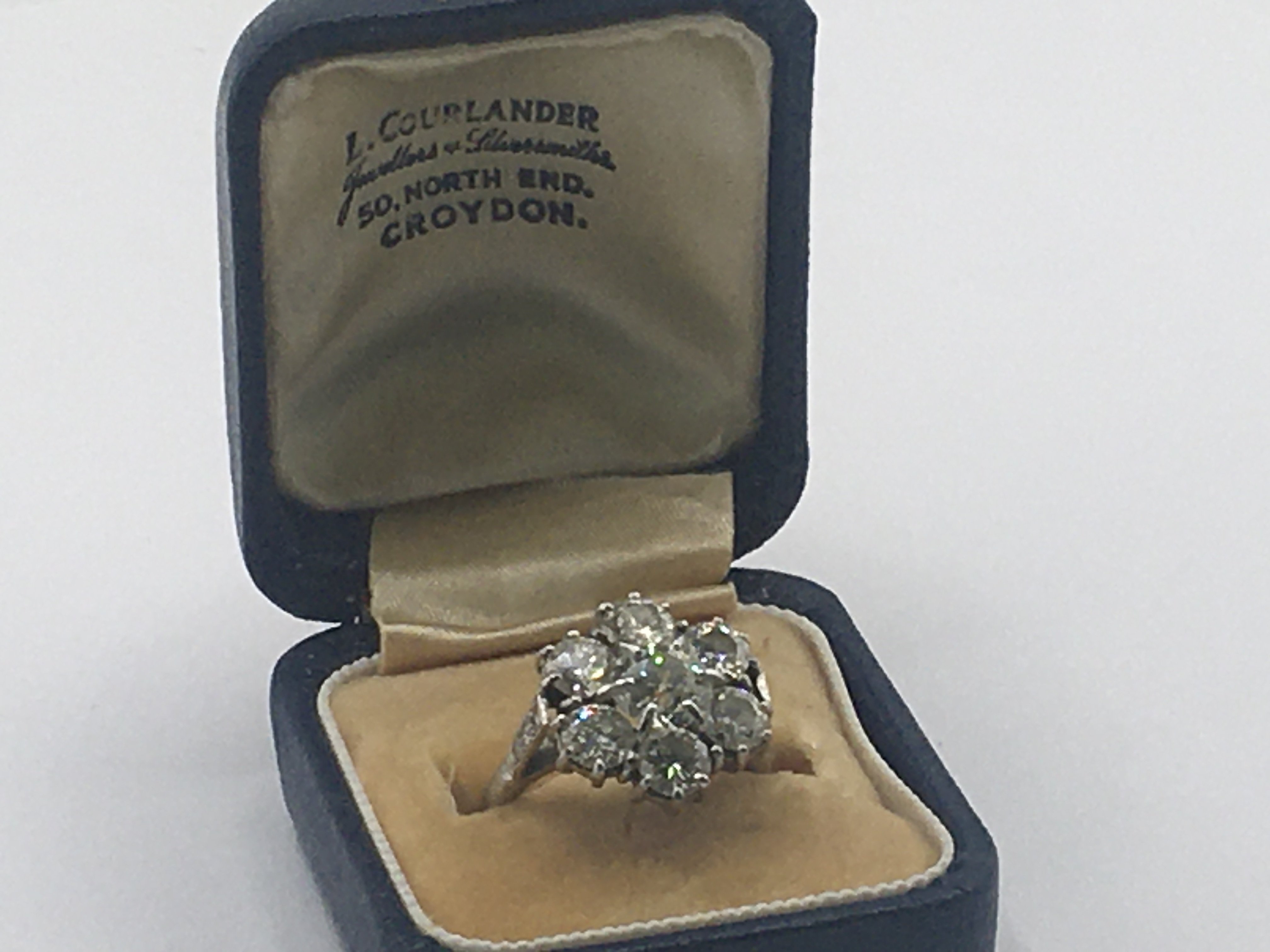 A Quality diamond cluster and platinum ring set with six round old cut diamonds in a floral pattern the shank set with smaller diamonds. each diamond approximately 0.25 -0.35 of a carat total carat weight approximately 1.5carat colour grade I/J clarity SI2. Total weight 4.5g ring size M. Sold with independent Gemologists Report.