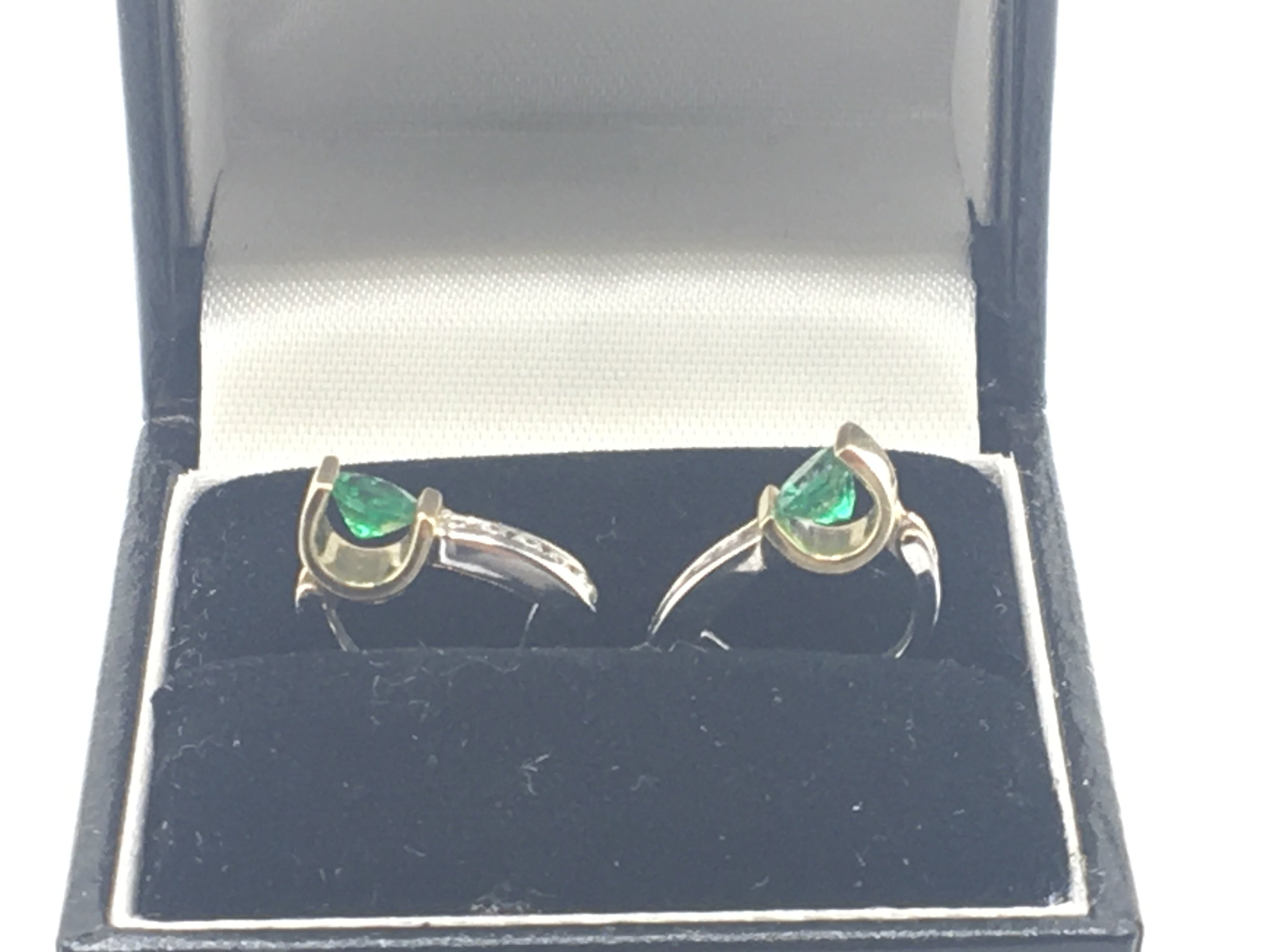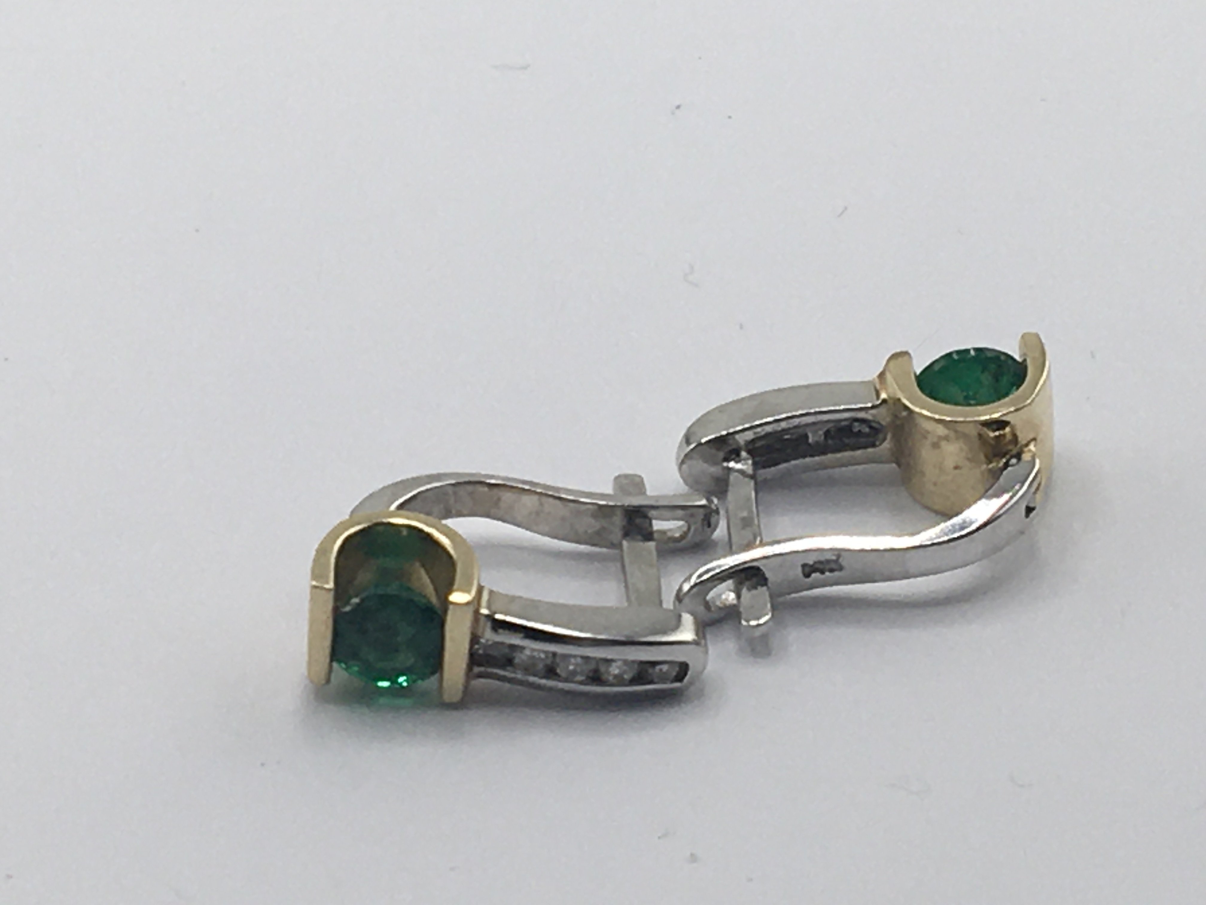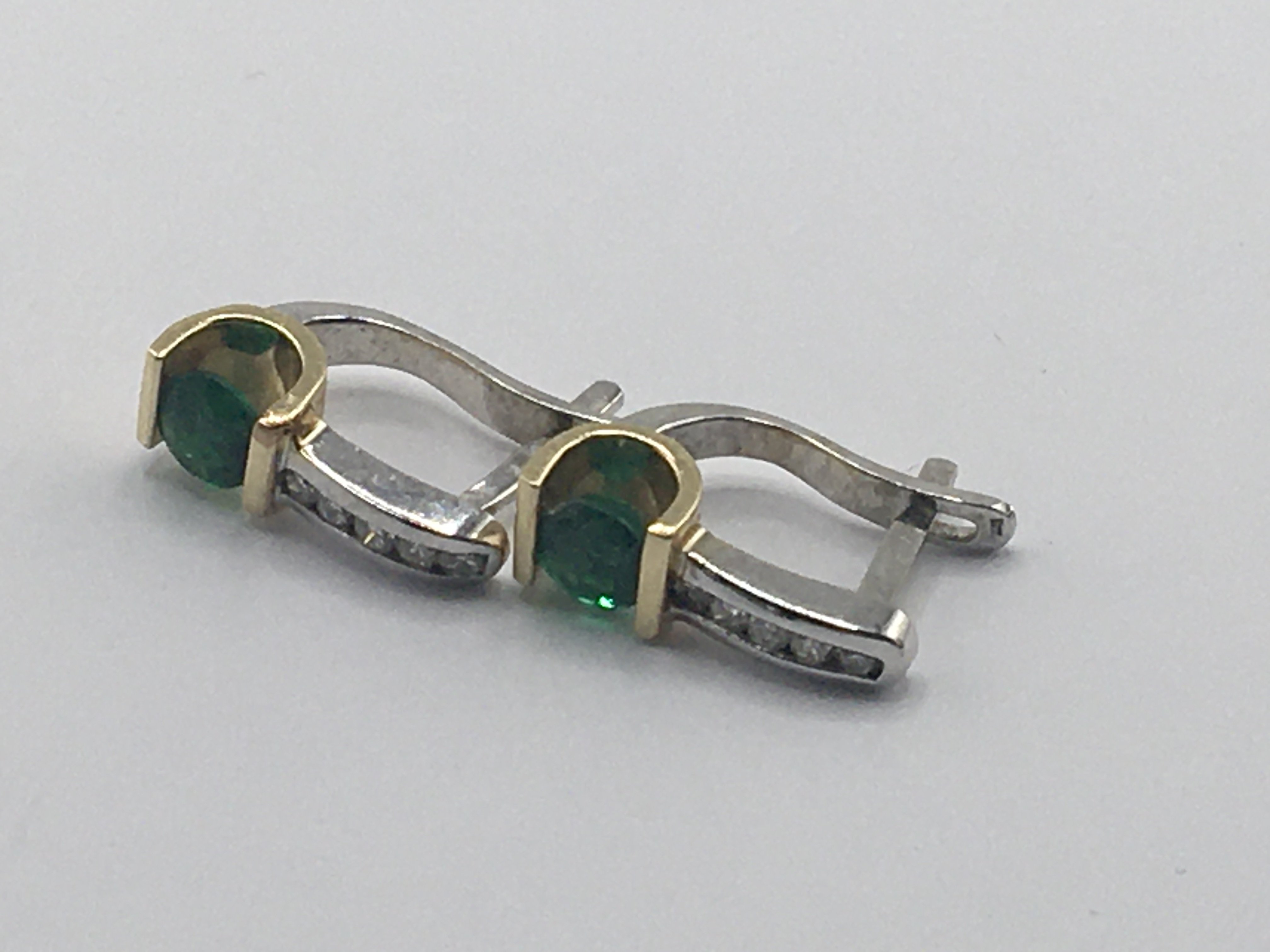 A pair of quality 14carat gold earrings of modern design white and yellow gold set with an emerald with diamonds. Weight 3g approximately.