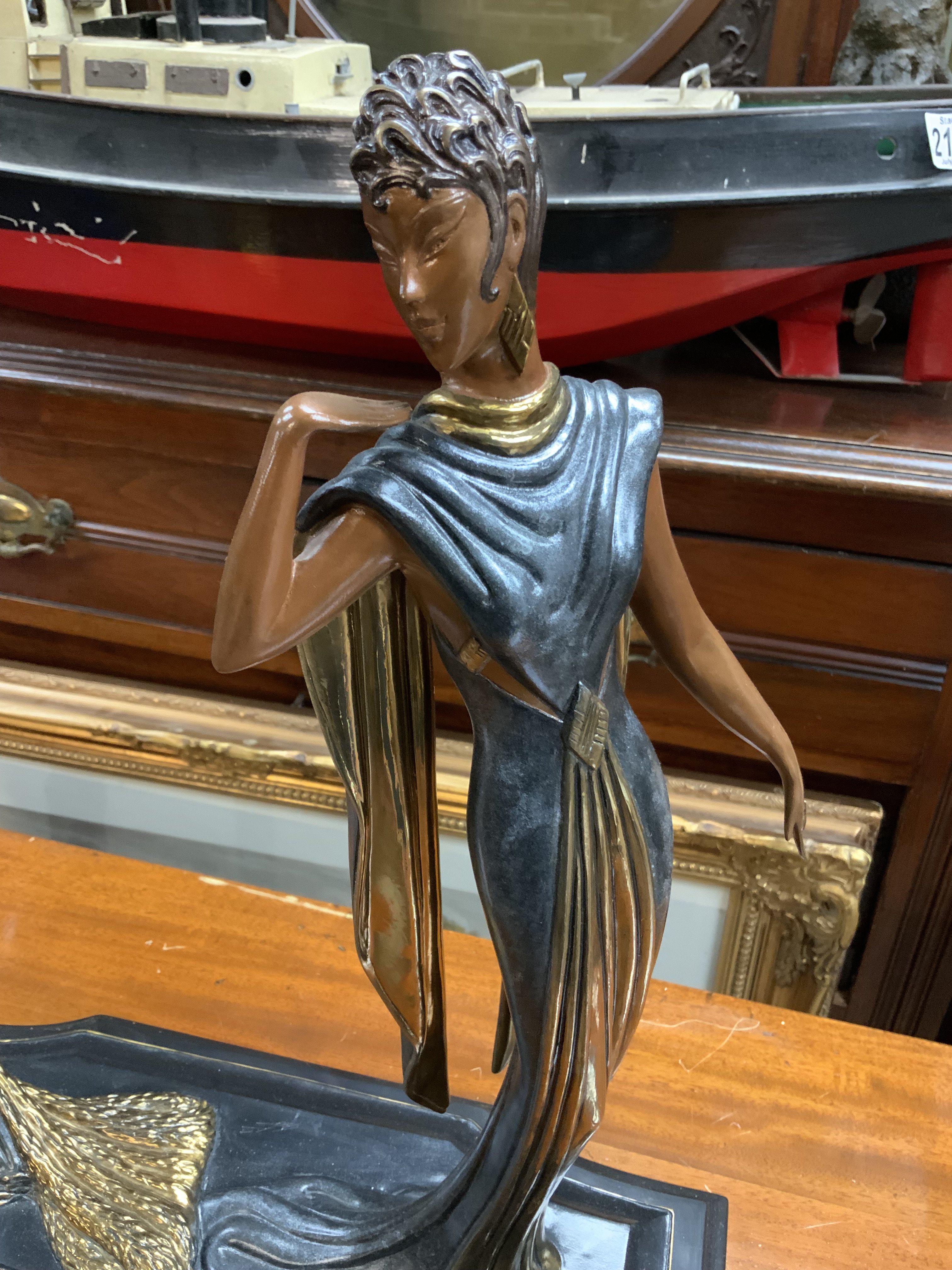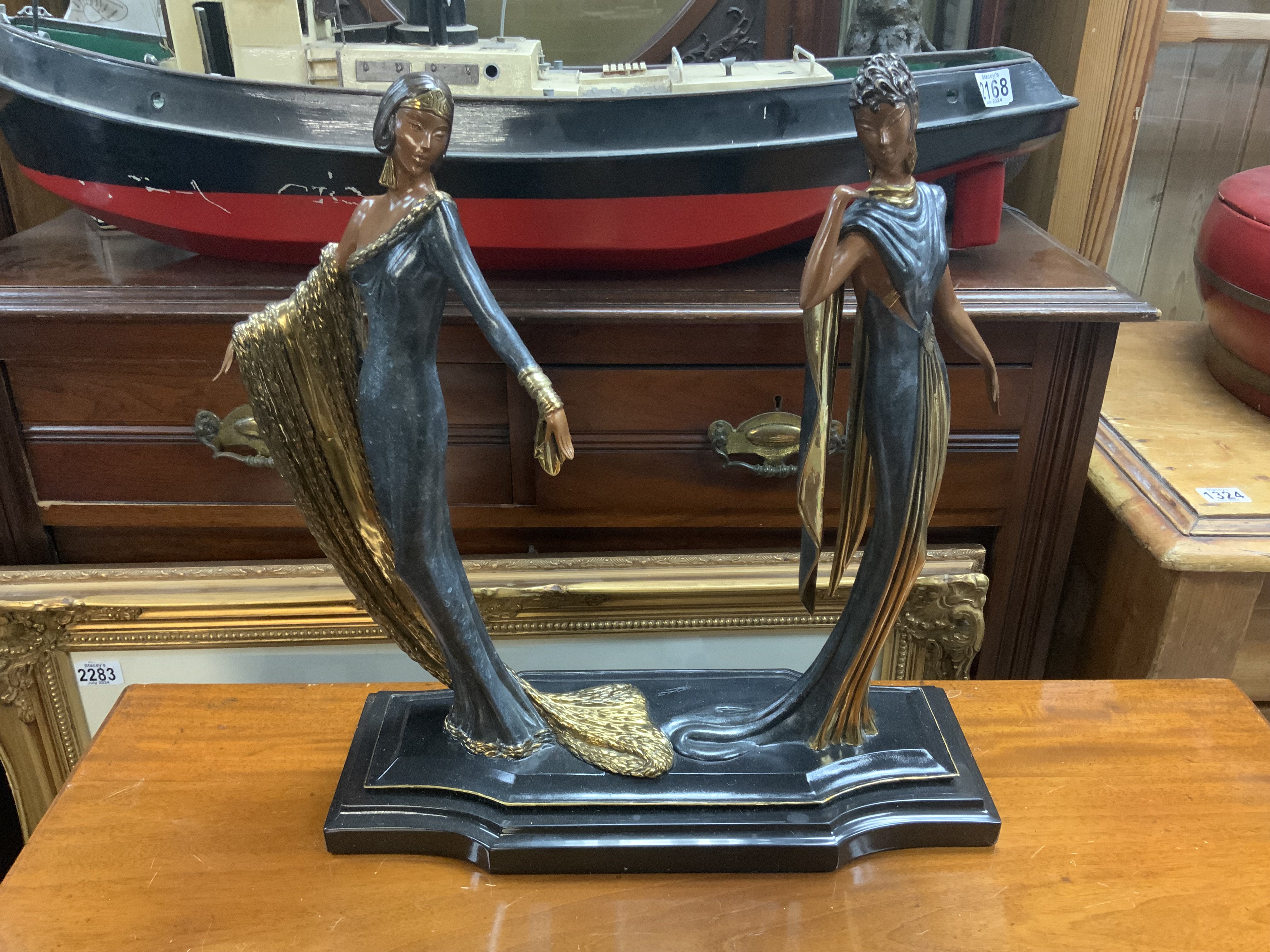 A cold painted bronze sculpture from Erte (Romain De Tirtoff 1892-1990): Duetto design, Stamped on reverse. AP (Artist Proof) 11/12 copyright 1989, Sevenarts Ltd London. 43cm x 48cm x 18.5cm.