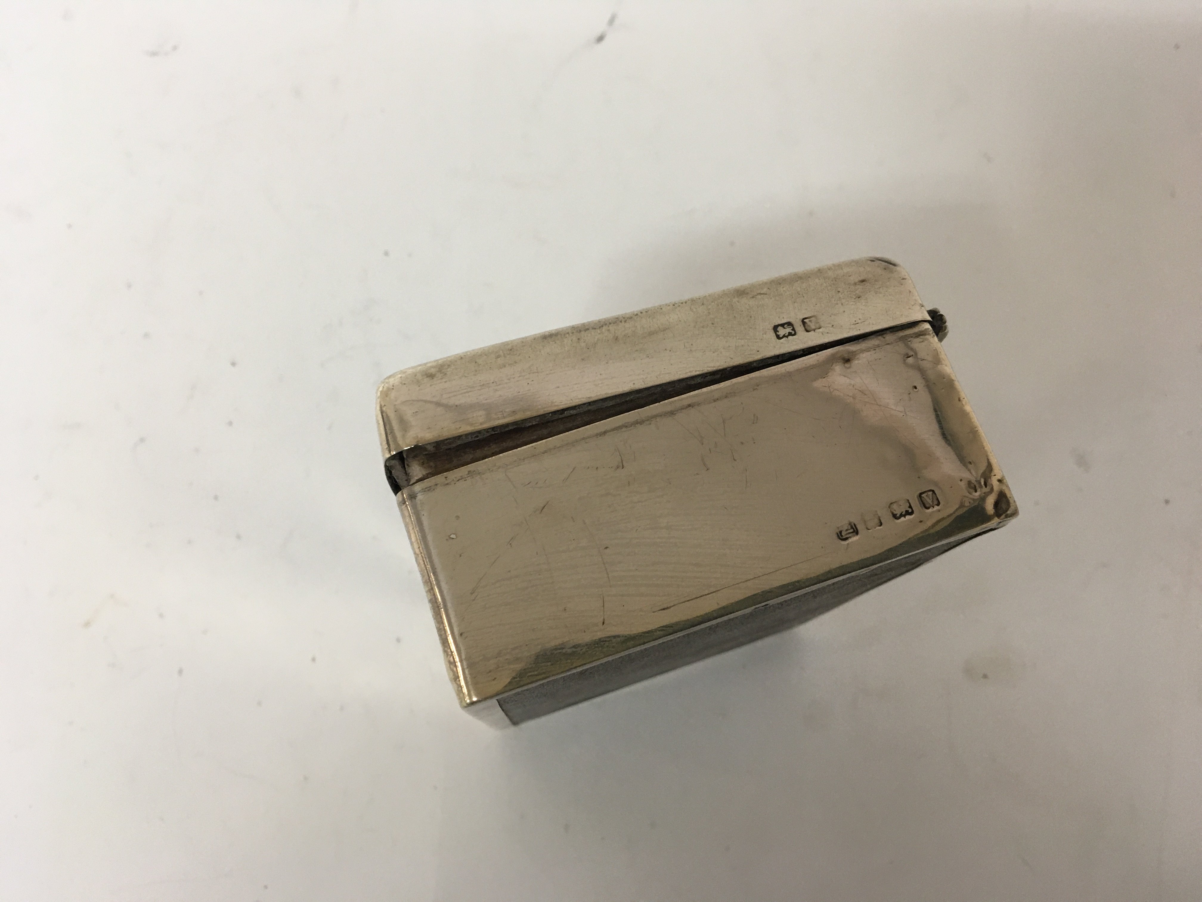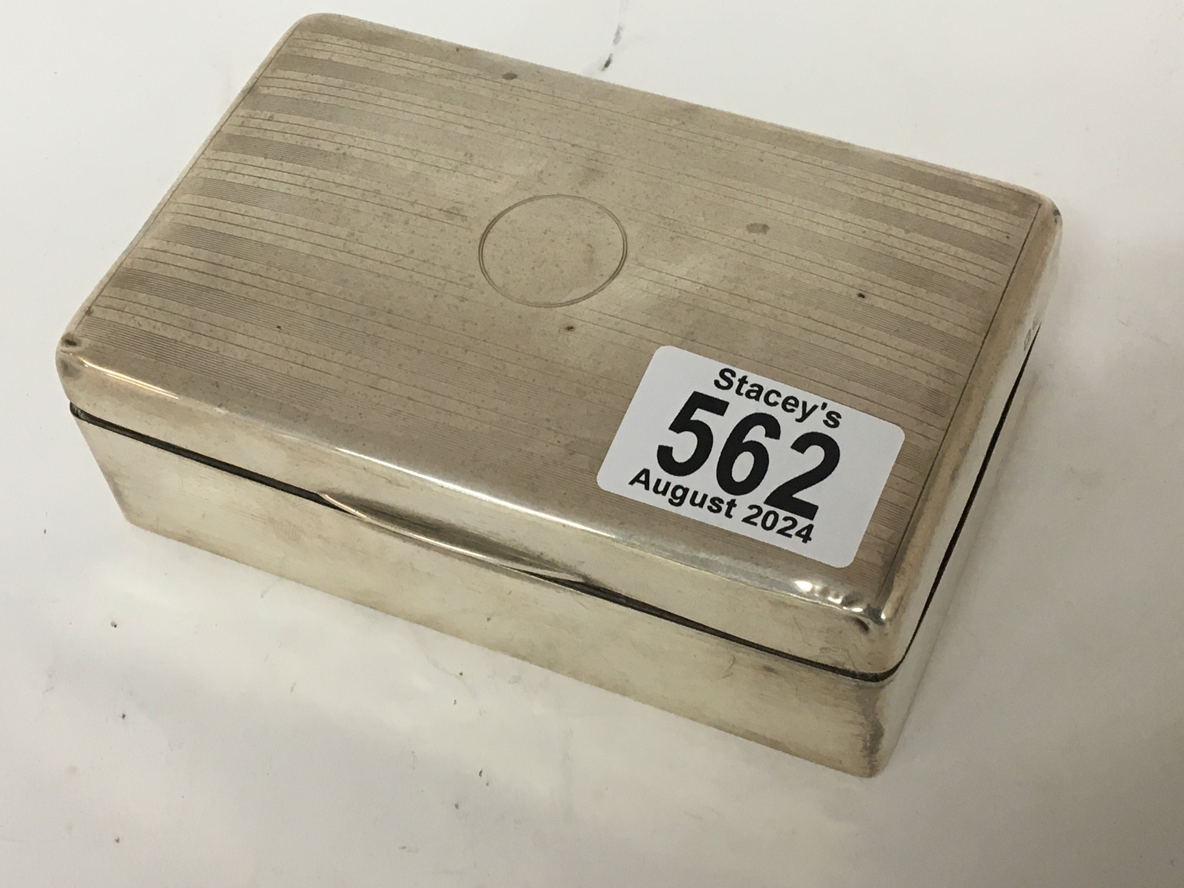 A silver desk top cigarette box. of rectangular shape.