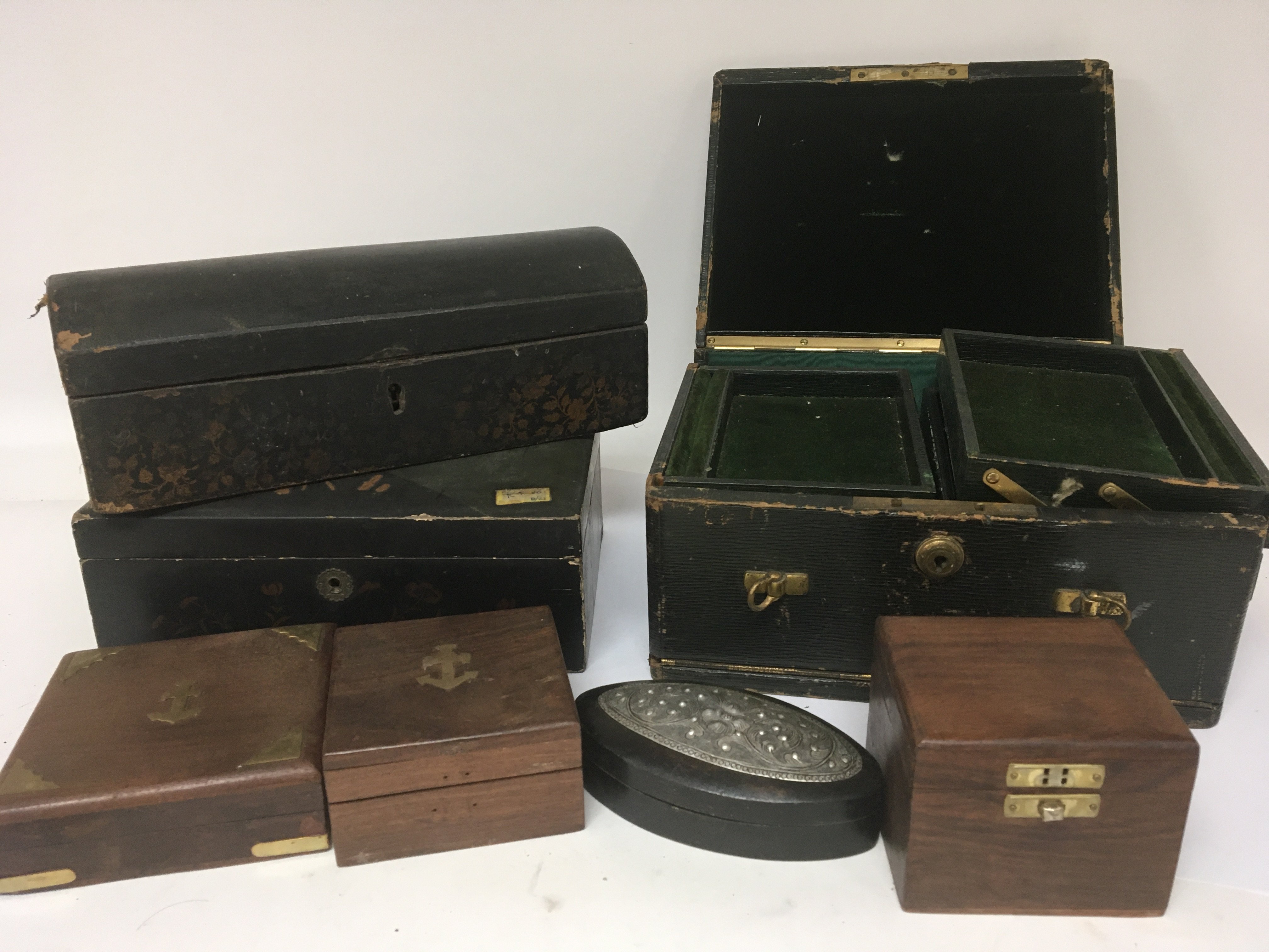 A leather bound Vintage jewellery box antique lacquered boxes and other treen boxes. NO RESERVE