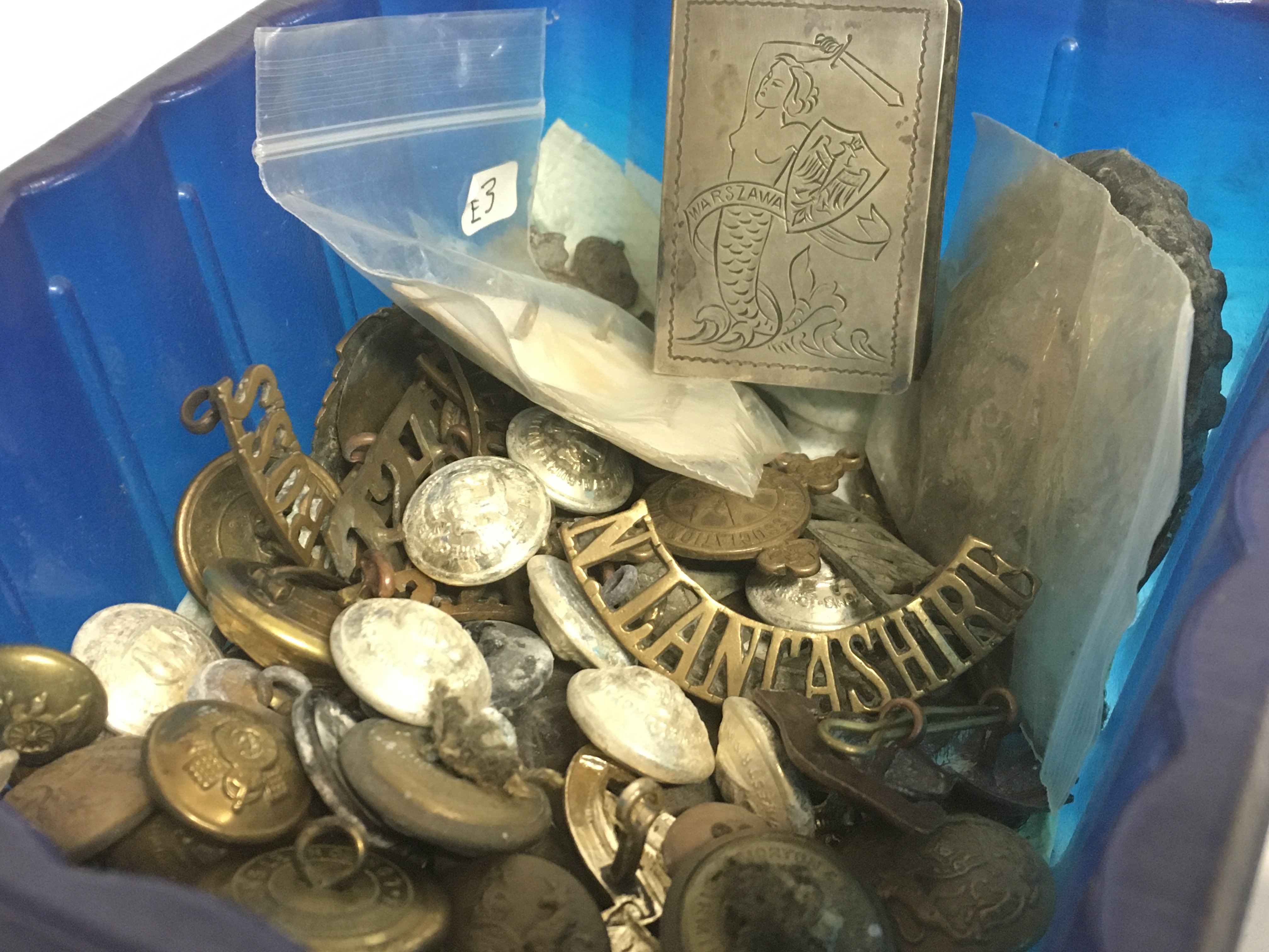 A collection of metal detector finds, a vintage enamel Burma Sauce advertisement, leather buttons and military cap badges. NO RESERVE