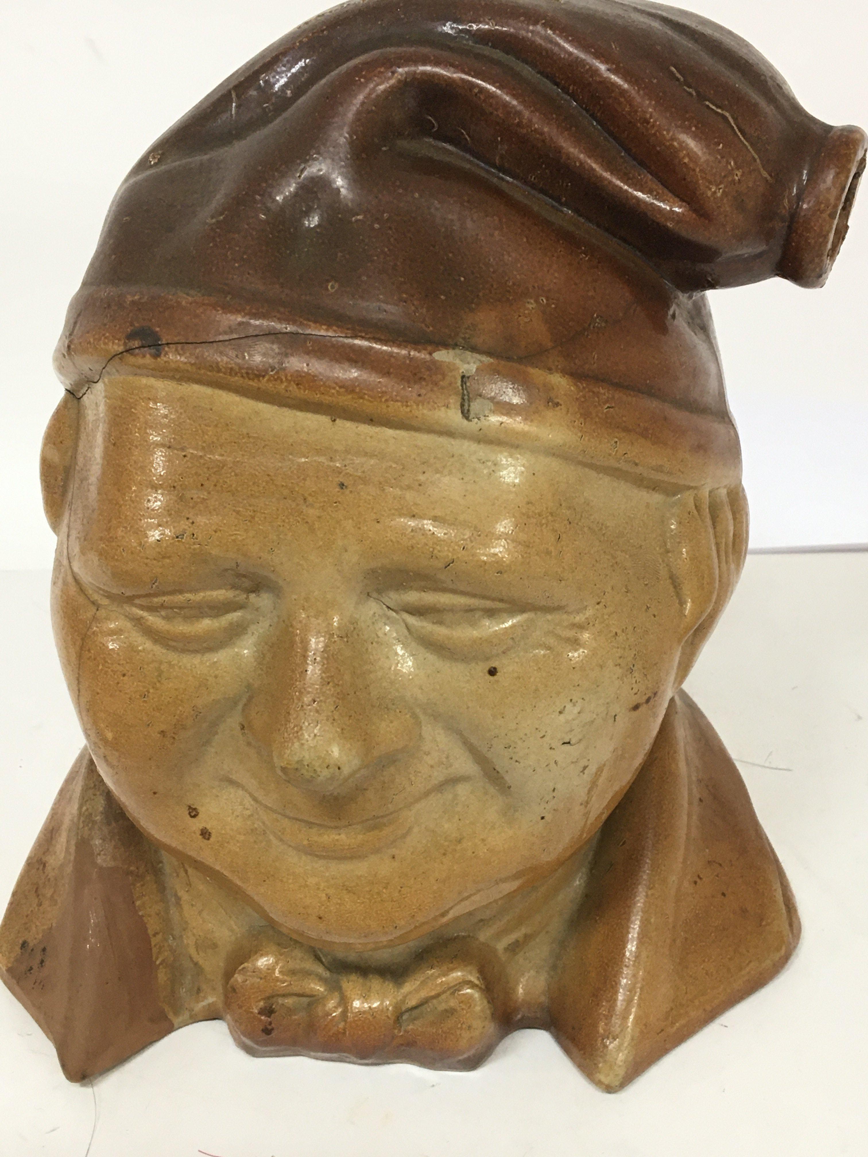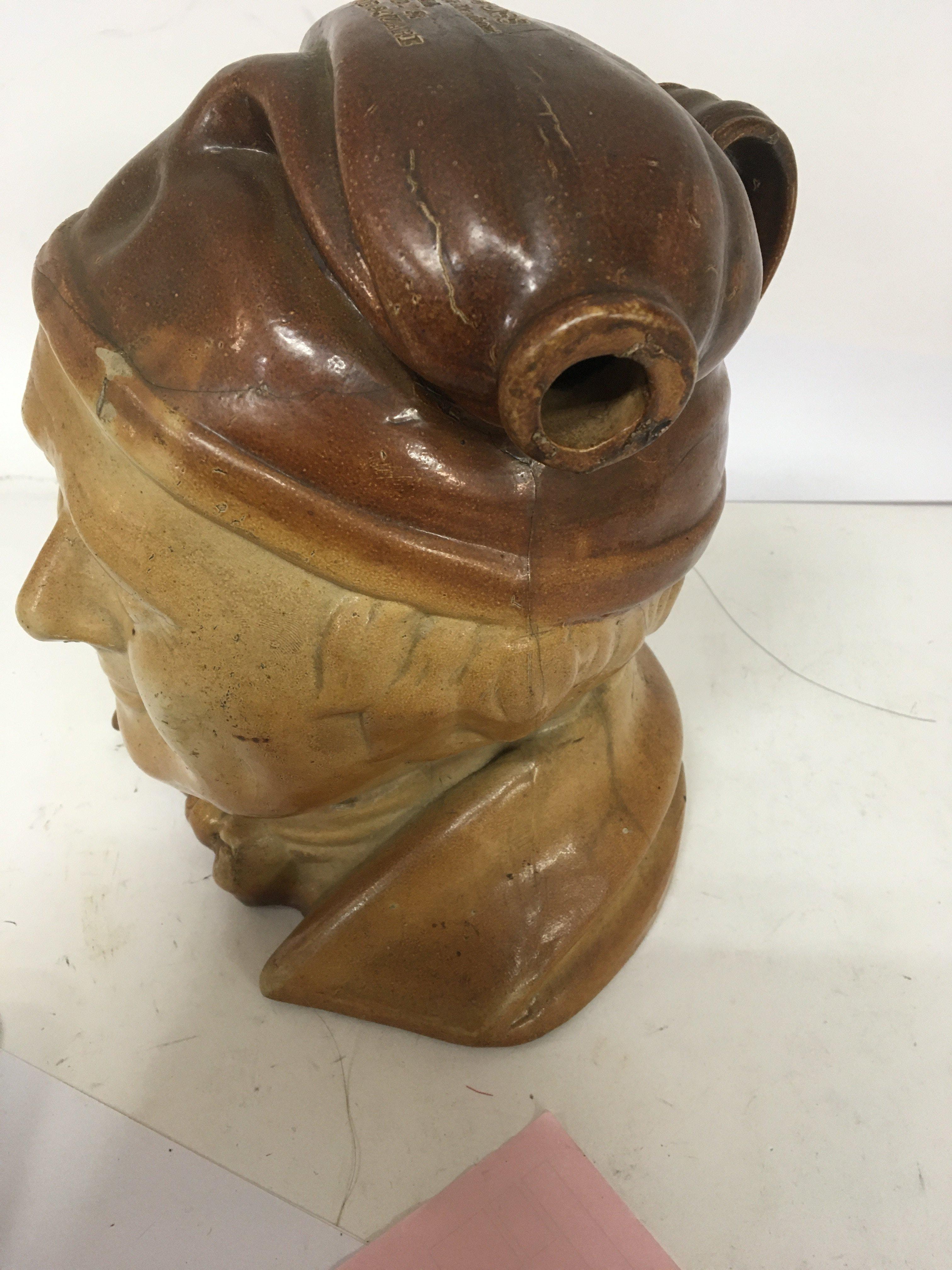 A rare stoneware 19th Century bottle decanter in the form of a large head Souter Johnnie. The top with impressed marks TA Amoss wine and spirit Merchant Bell Mount St Grosvenor Square. Height 26cm hairline cracks.