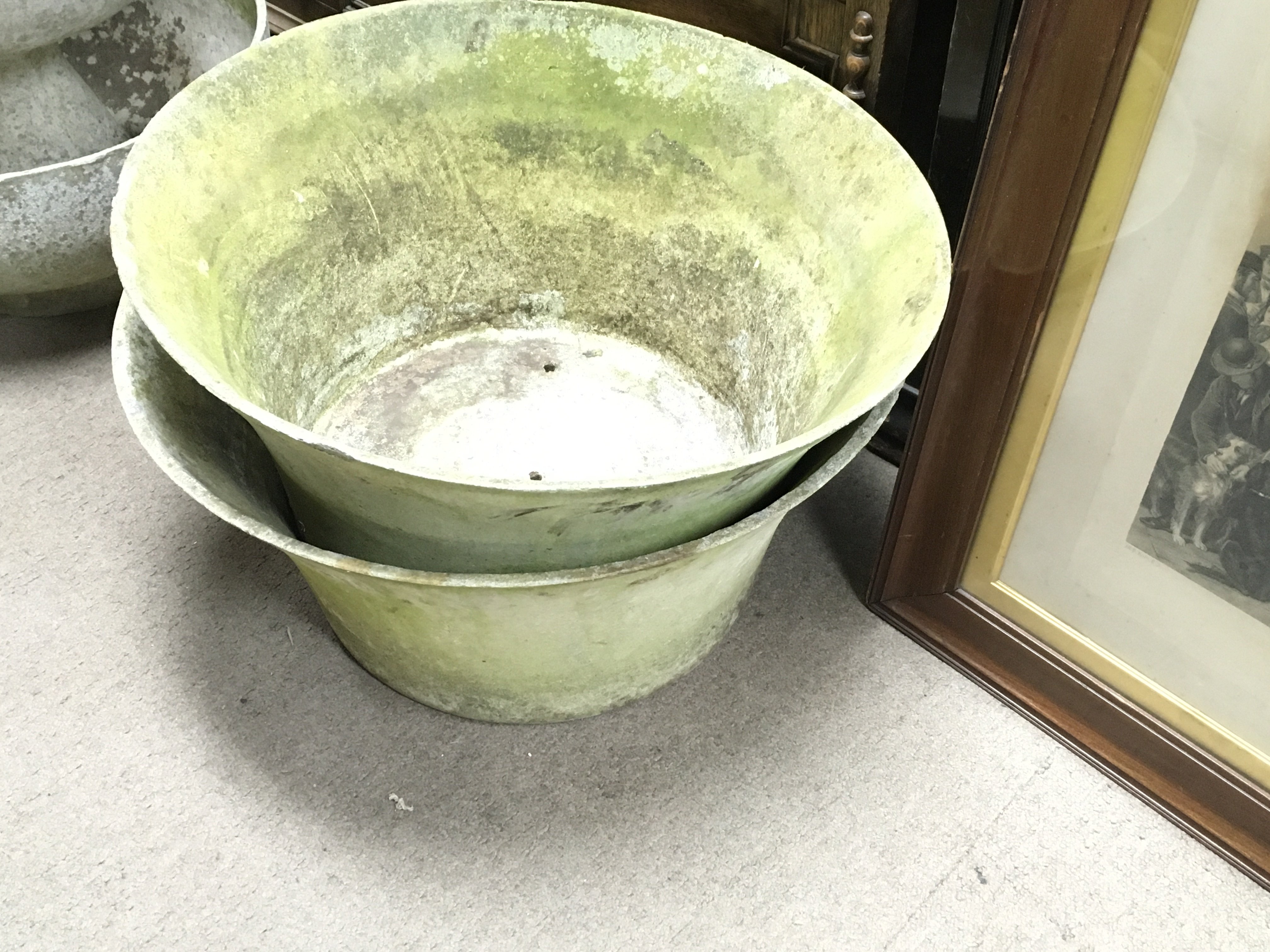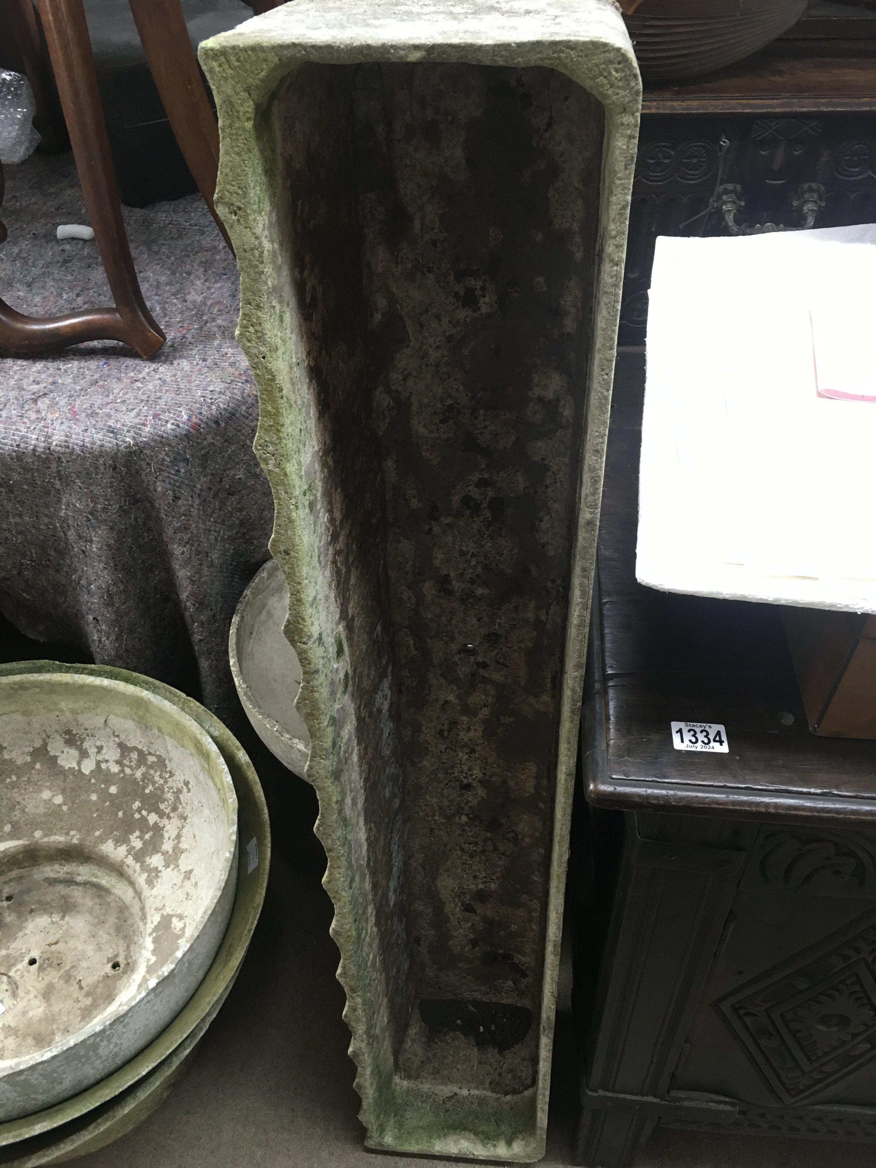 A florastone pair of large planters 60cm diameter and 30cm high. Long planter 124cm long. Postage D