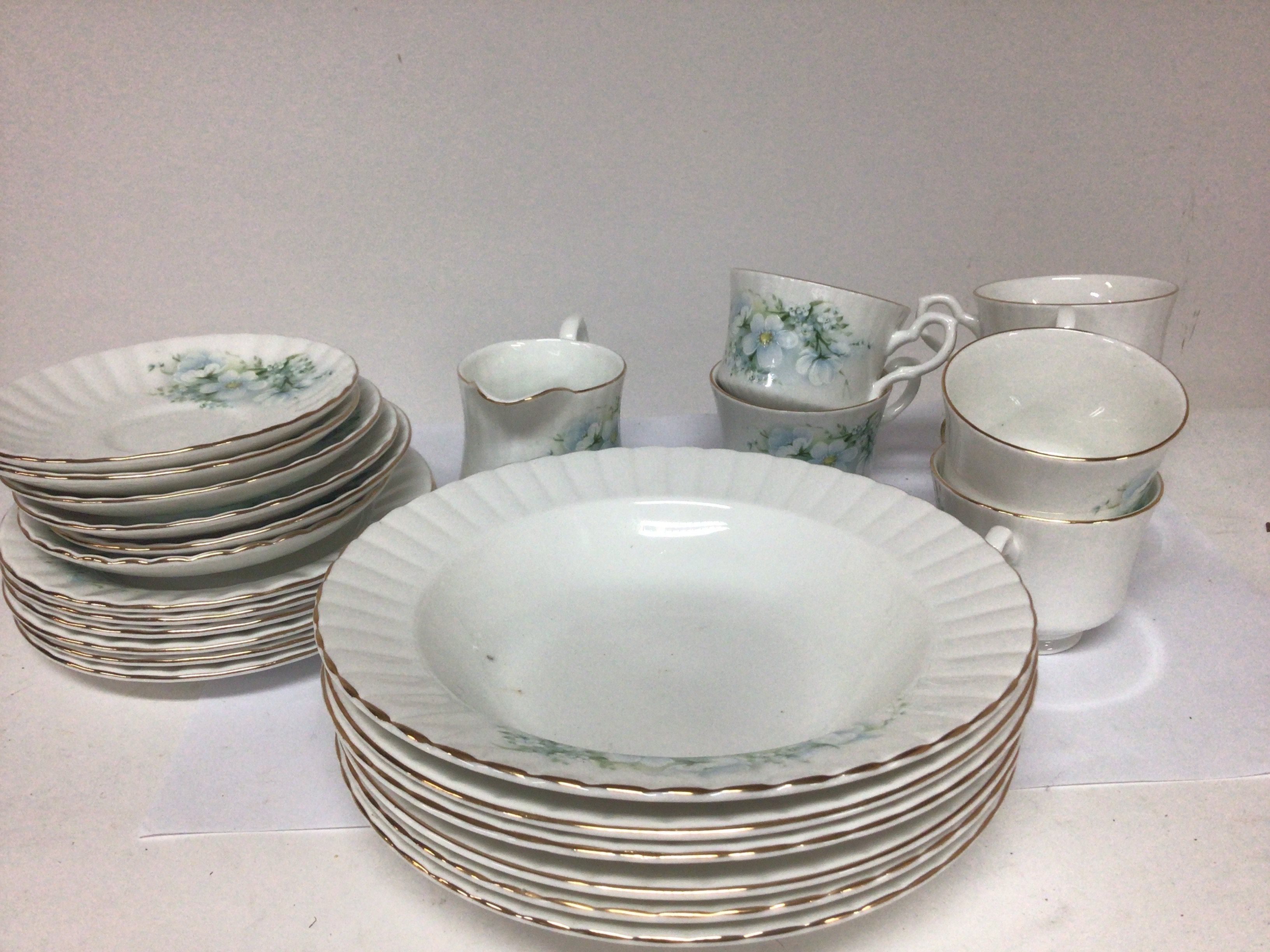 A royal Stafford bone china tea set decorated with flowers on a white glazed ground six place setting with a set of soup bowls no obvious damage. NO RESERVE