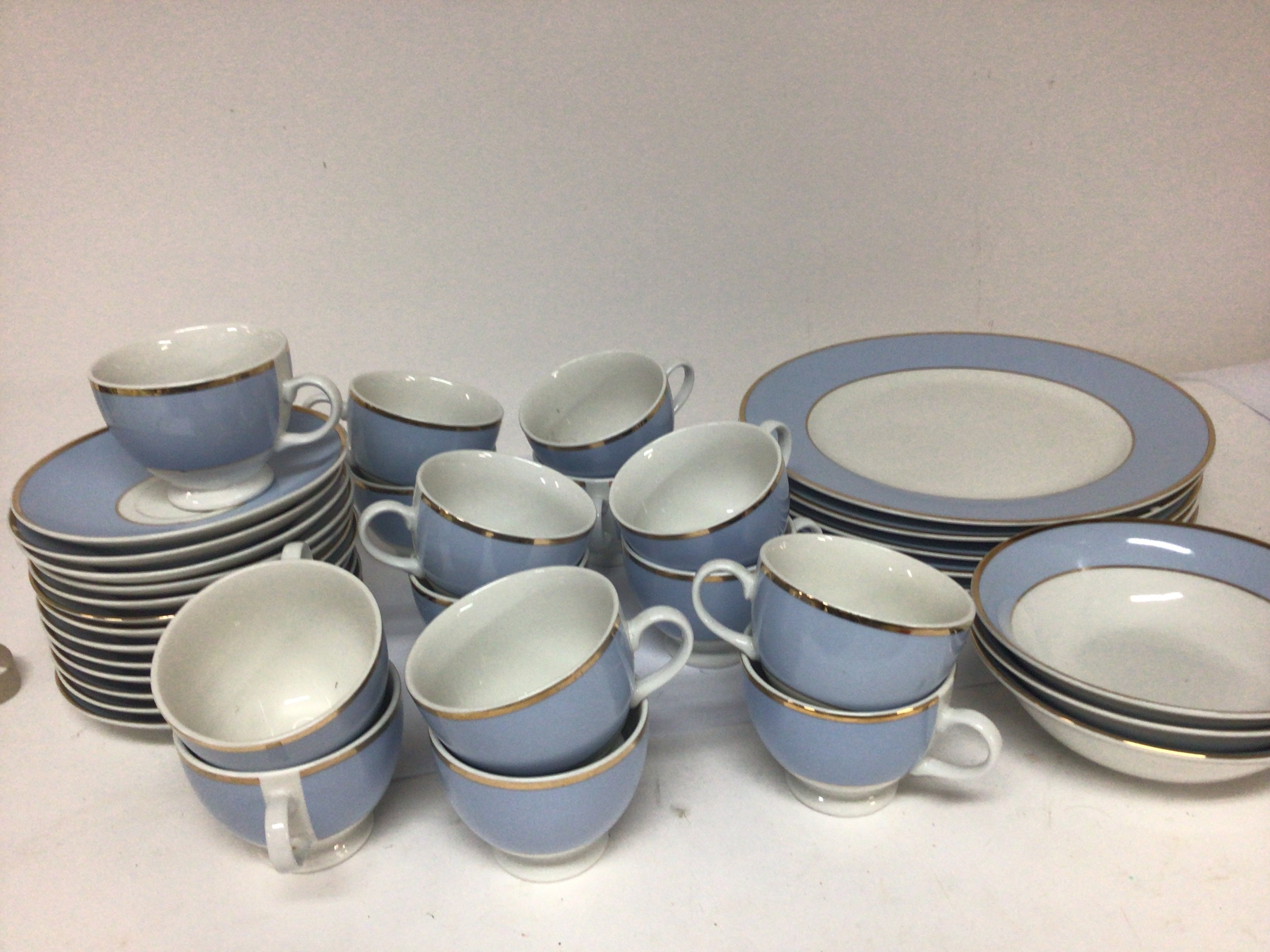 A Royal Doulton tea and part dinner set decorated in pale blue with applied gilt and a Doulton crystal bowl boxed. NO RESERVE