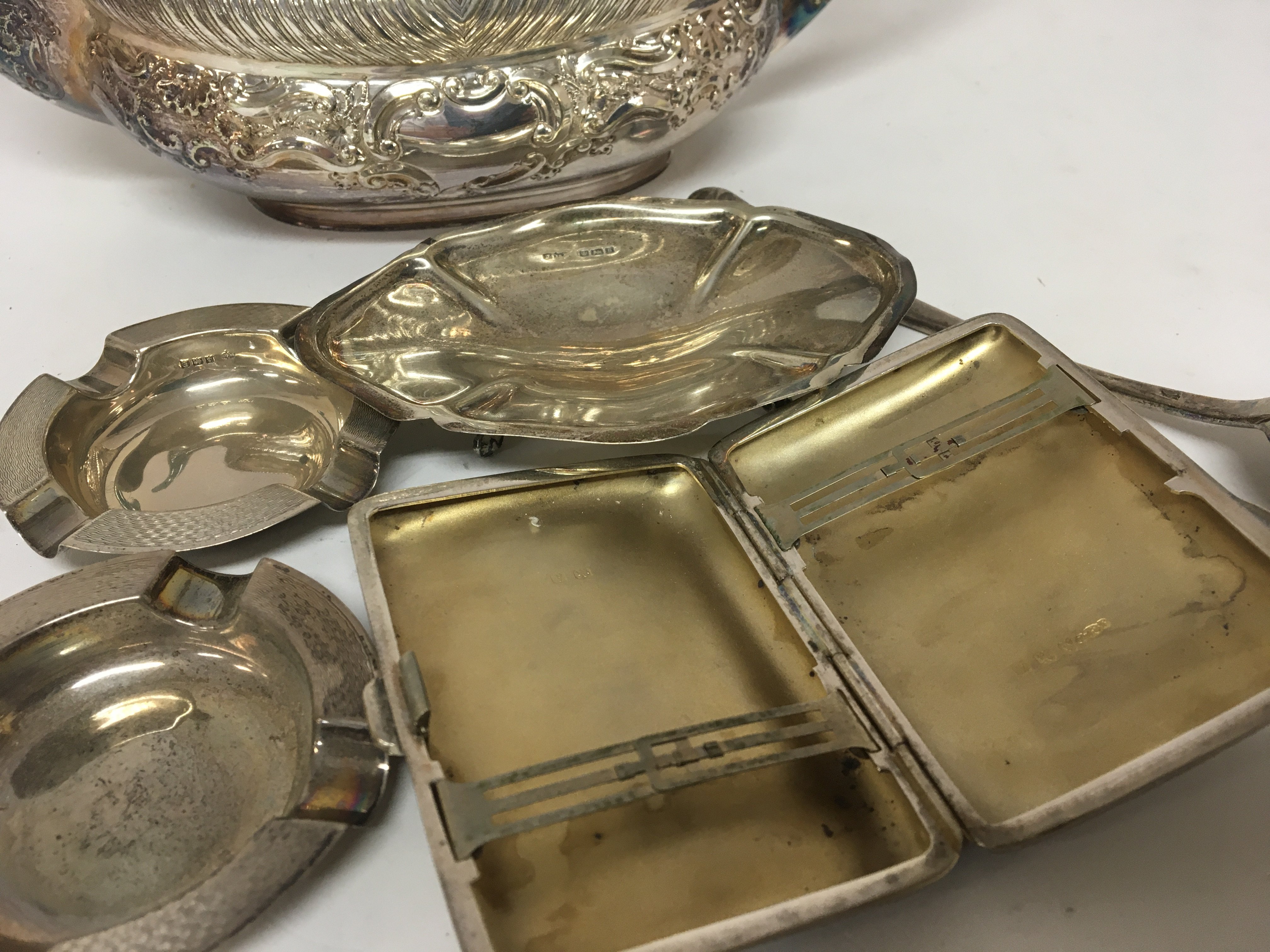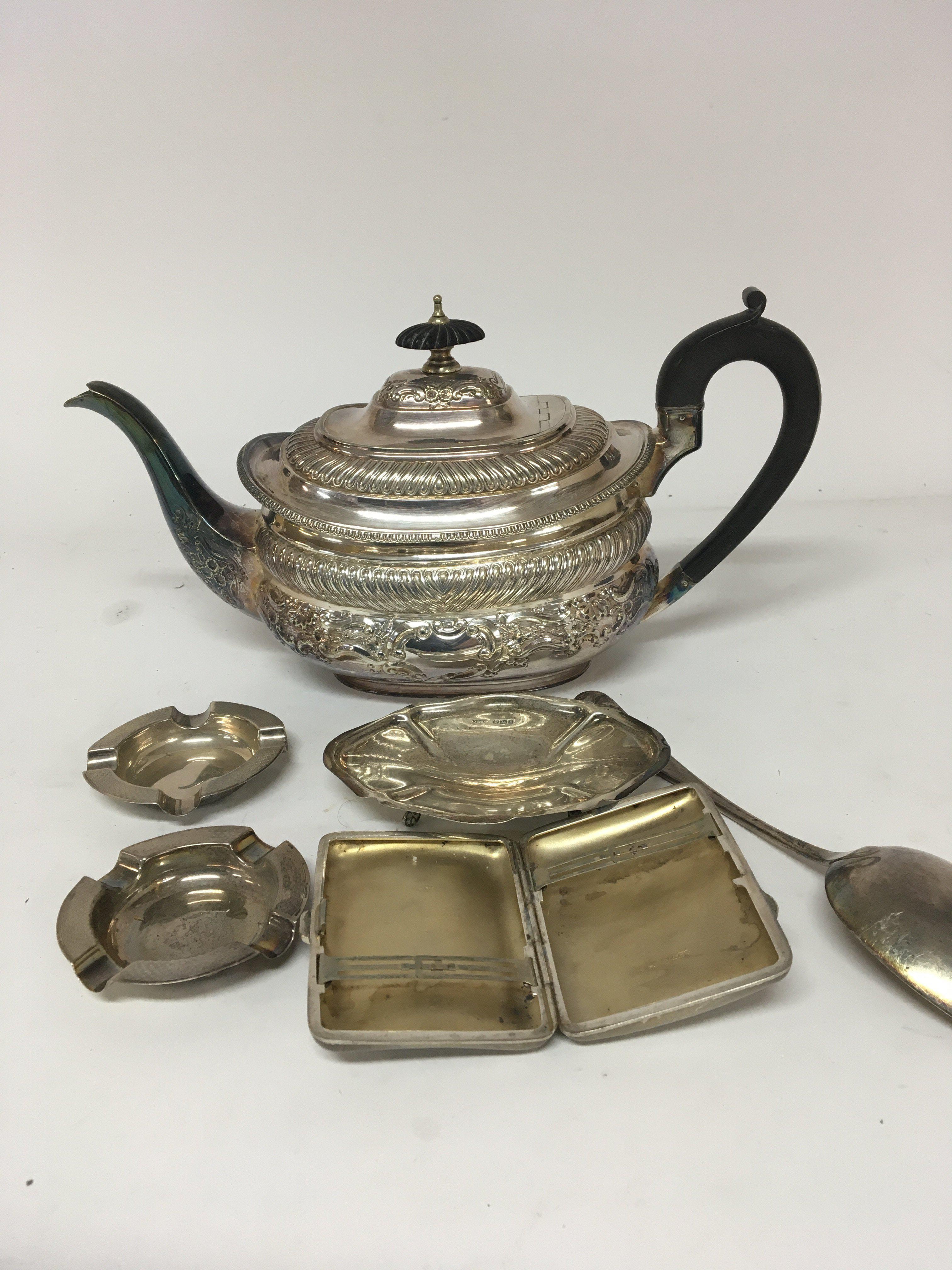 Two silver ash trays a silver dish George III silver table spoon a cigarette case and a silver plated tea pot.