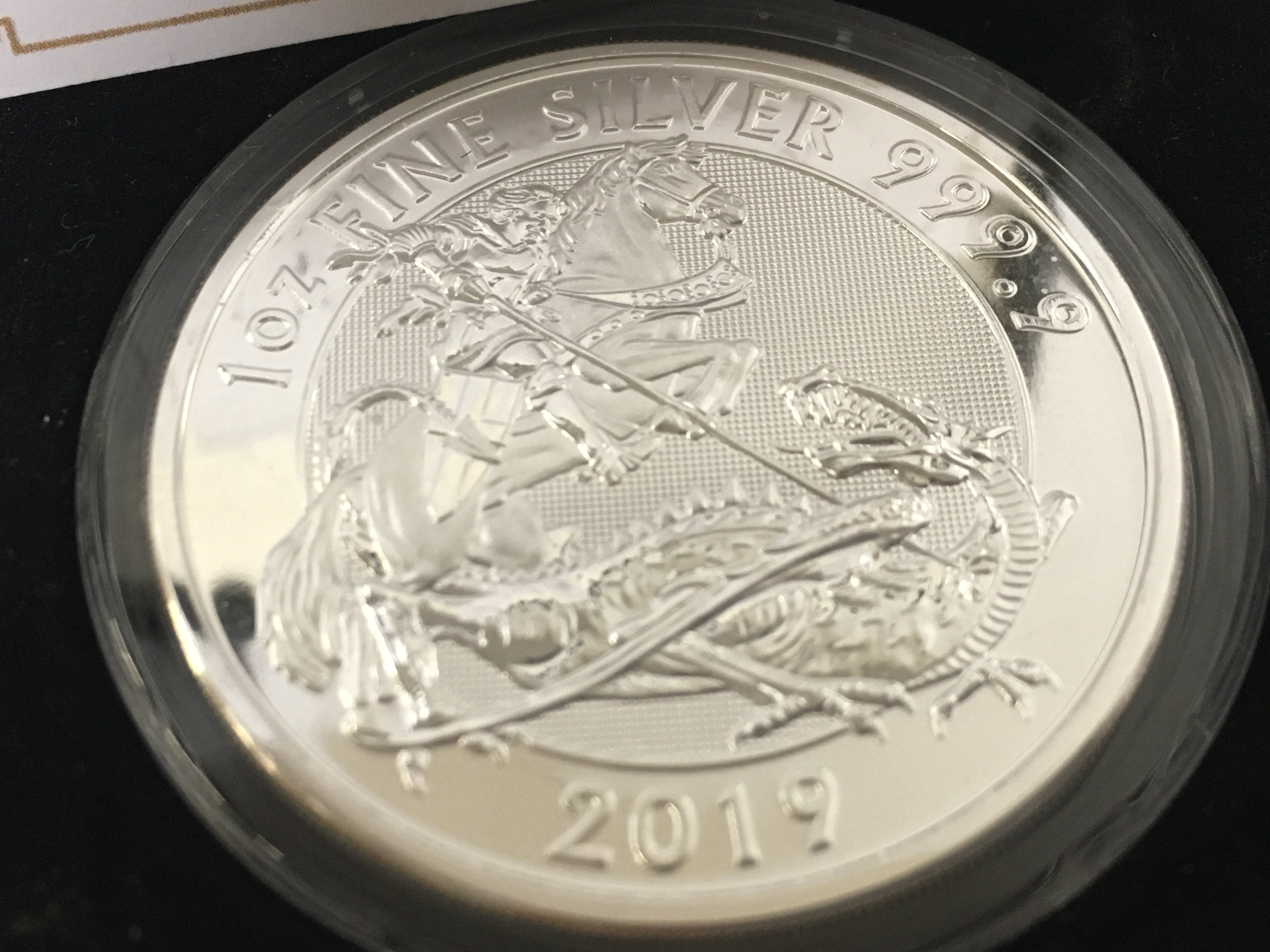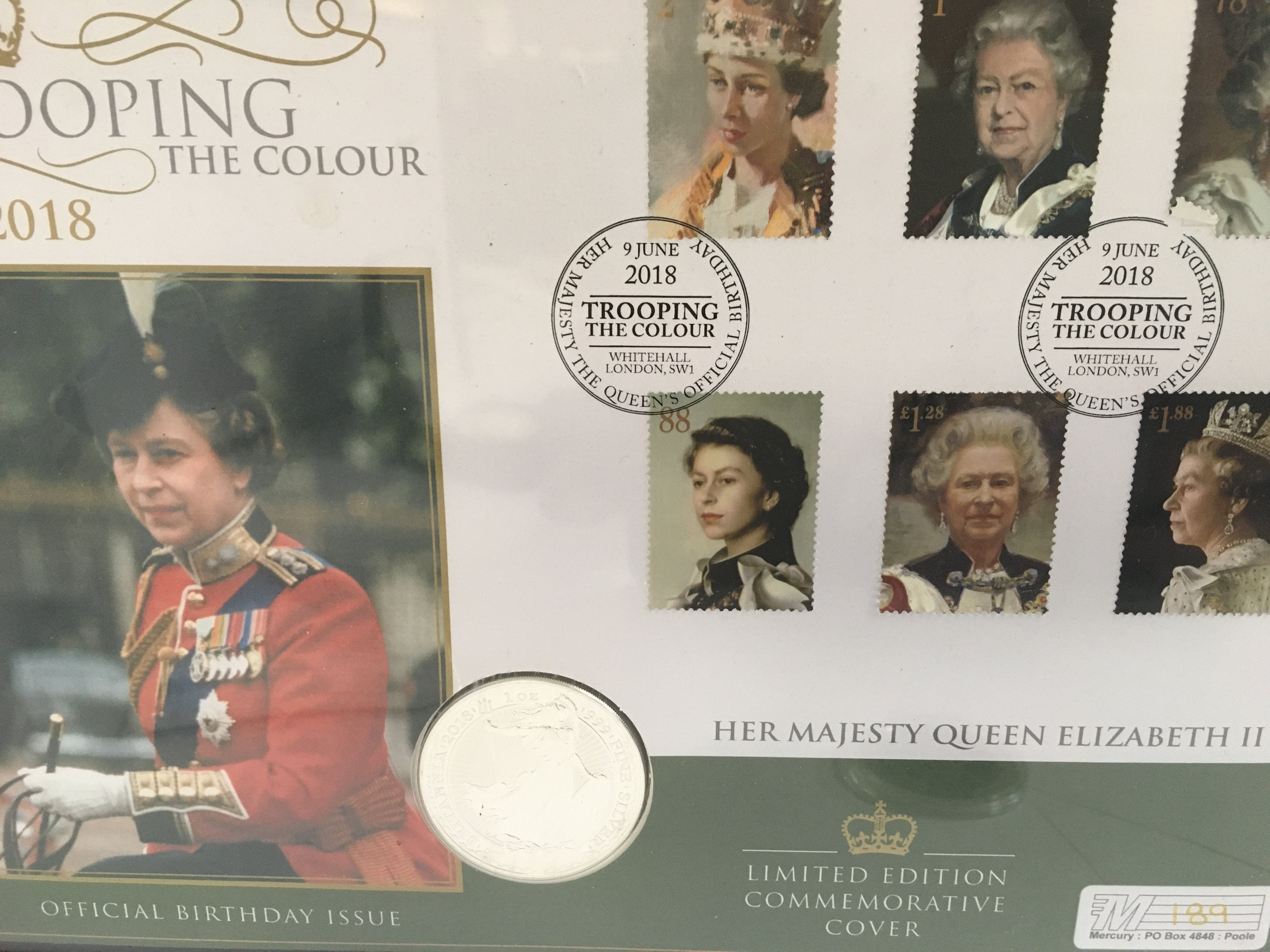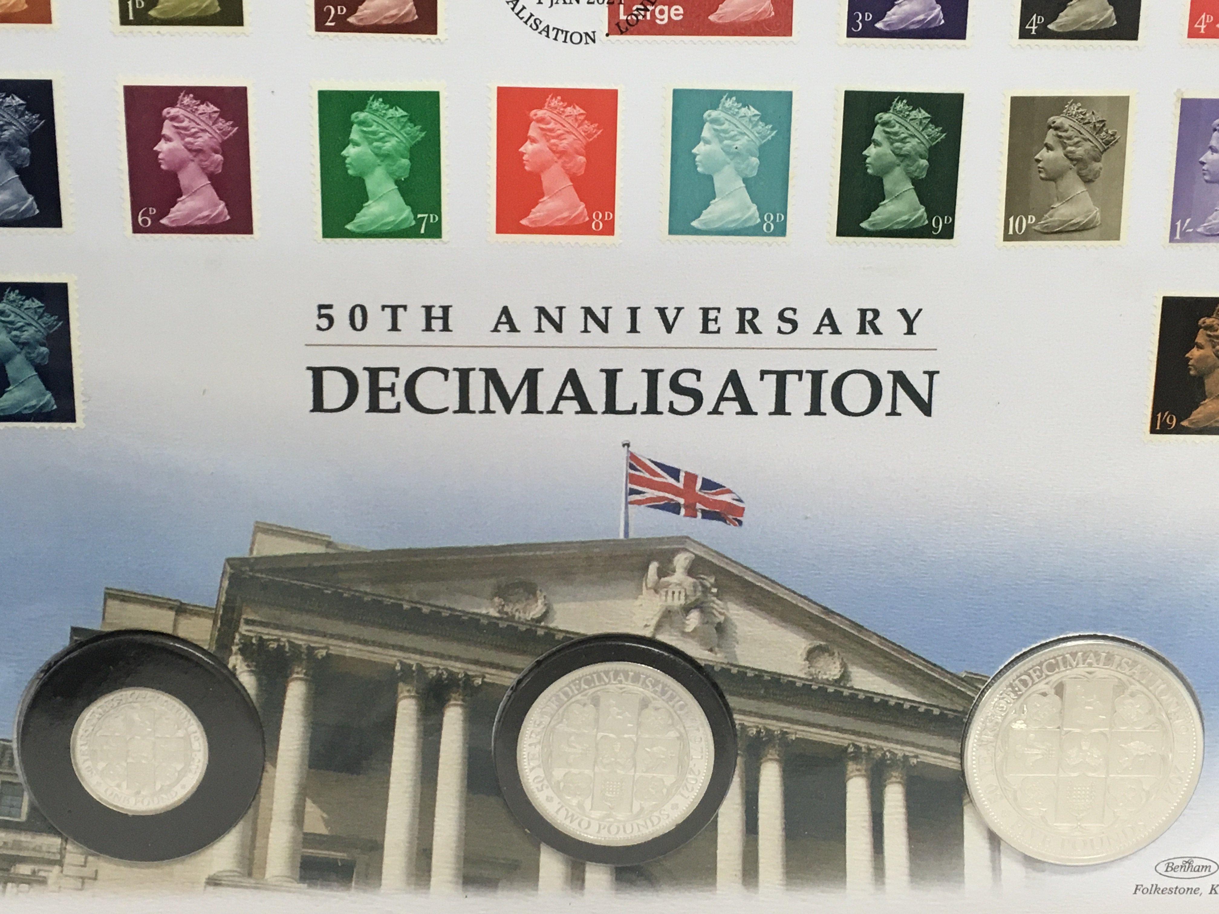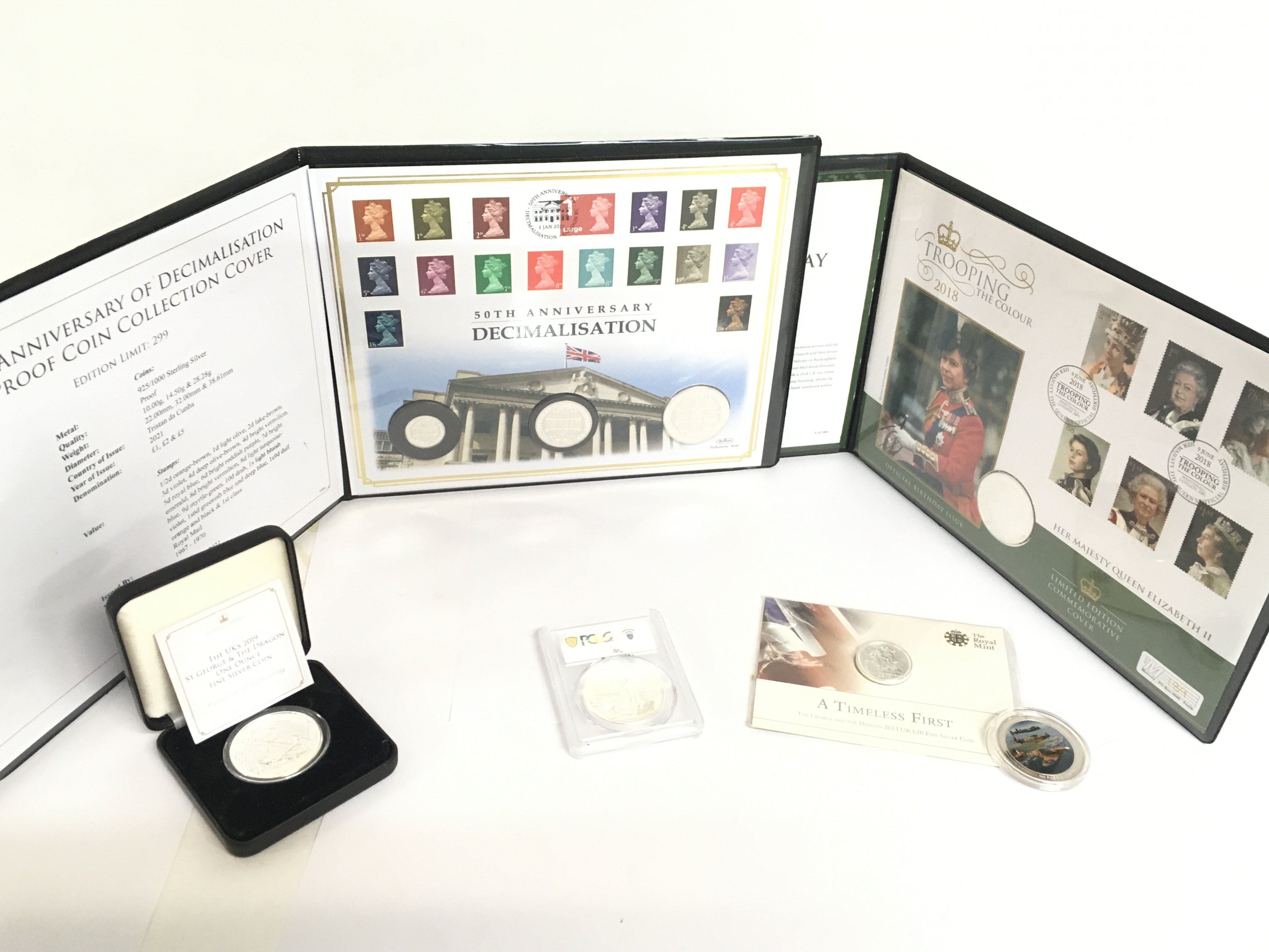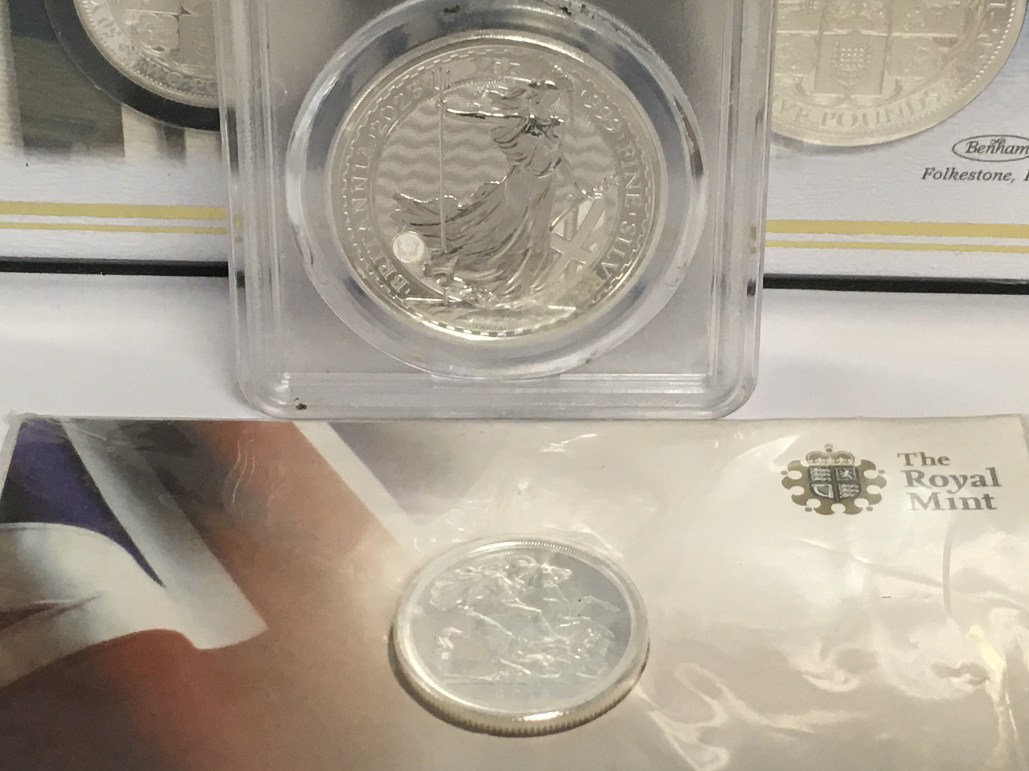 A collection of silver coins including the 50th anniversary of Decimalisation silver proof coin collection cover, The Queens Official Birthday Silver Coin Cover, Timeless First George and the Dragon 2013 20 pound fine silver coin, Britannia Elizabeth II Effigy etc. Postage category C