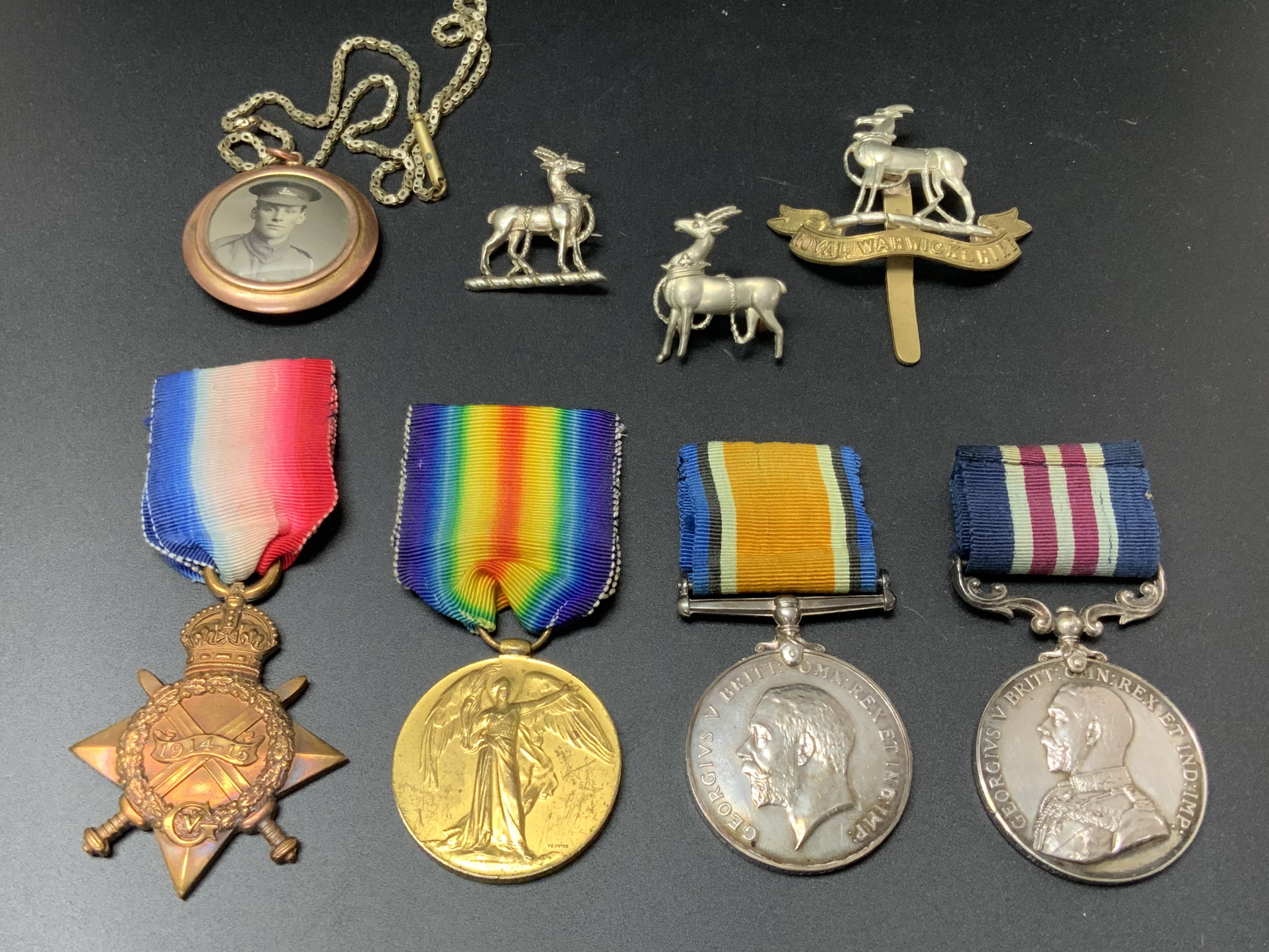 A Bravery in the Field & Great War medal group of 4, awarded to Sgt C.H Sylvester 1/7 Royal Warwickshire regiment. T.F. - Military Medal. GV 1st type (265162 Sgt. C.H Sylvester. 1/7 Royal Warwickshire regiment. T.F.) - 1914-15 Star (1705 L Cpl C.H Sylvester R.War R). - British War Medal. Silver issue ( 265162 Sgt C.H Sylvester 1/7 Royal Warwickshire regiment.) - Interallied Victory Medal (265162 Sgt C.H Sylvester 1/7 Royal Warwickshire regiment). Regiment cap badge, 2, photographic locket, 2 additional regiment emblems. (B)