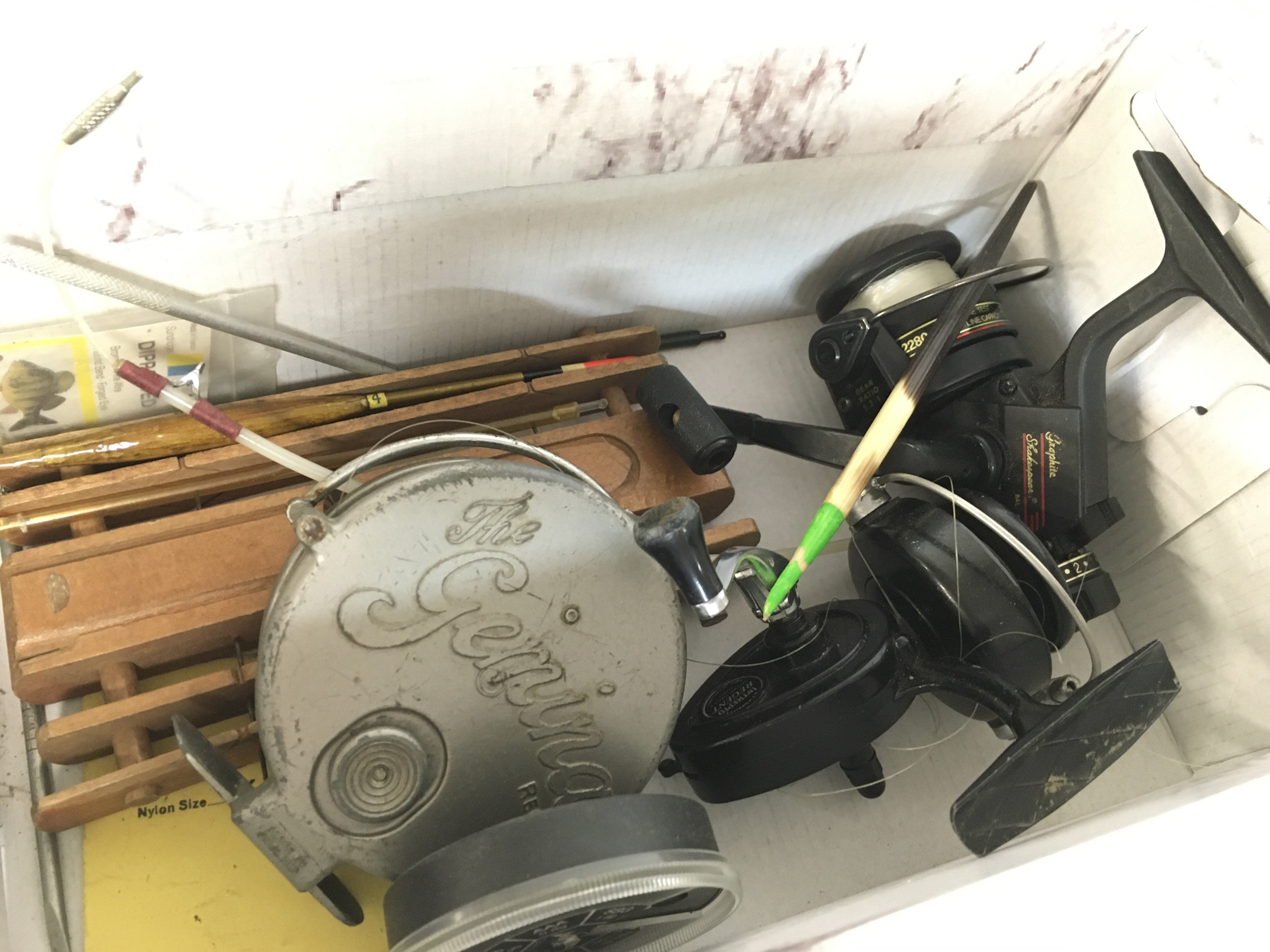 A collection of fishing reels including Intrepid Regent, The Gemina, Graphite Shakespeare and rods