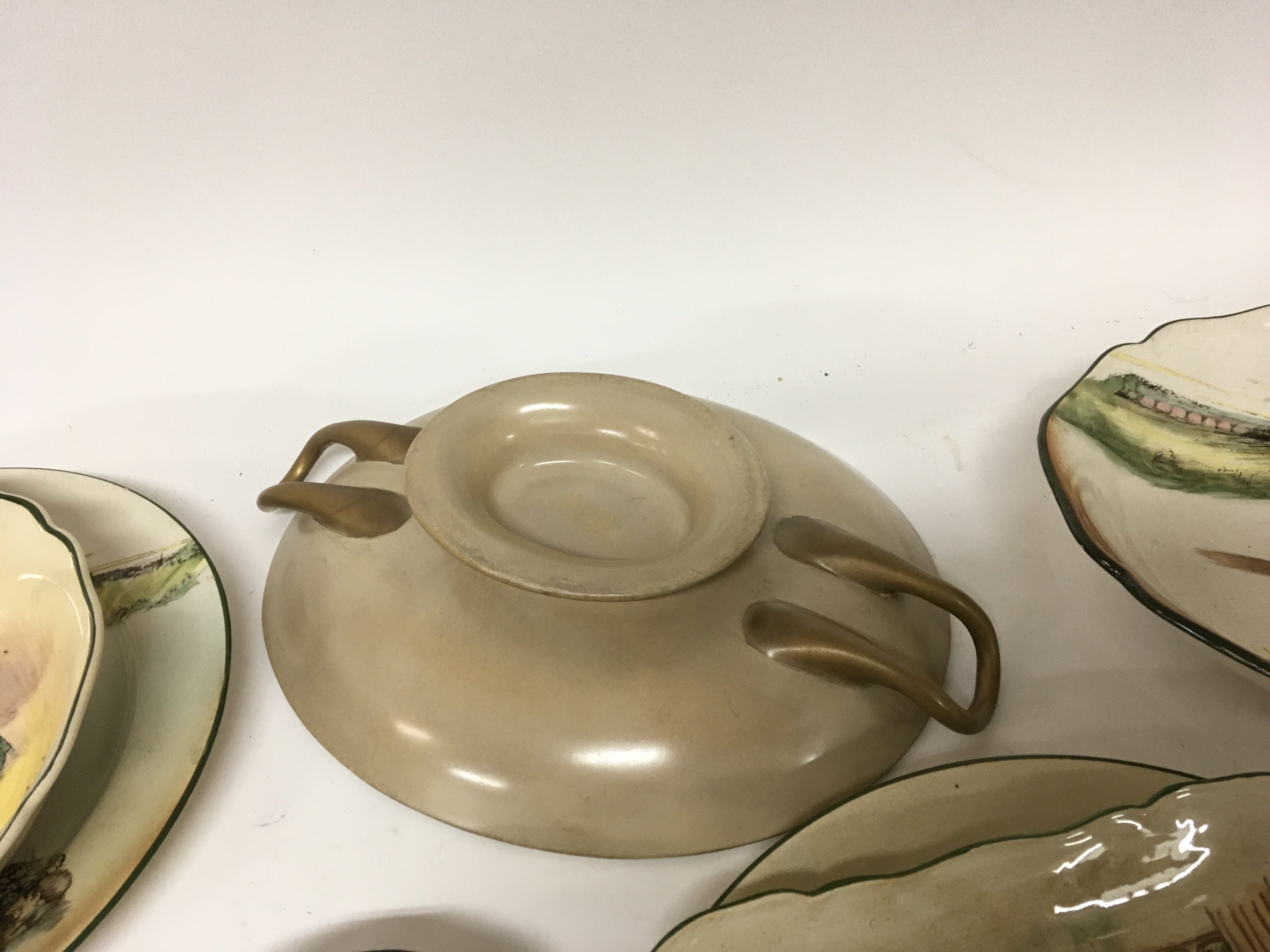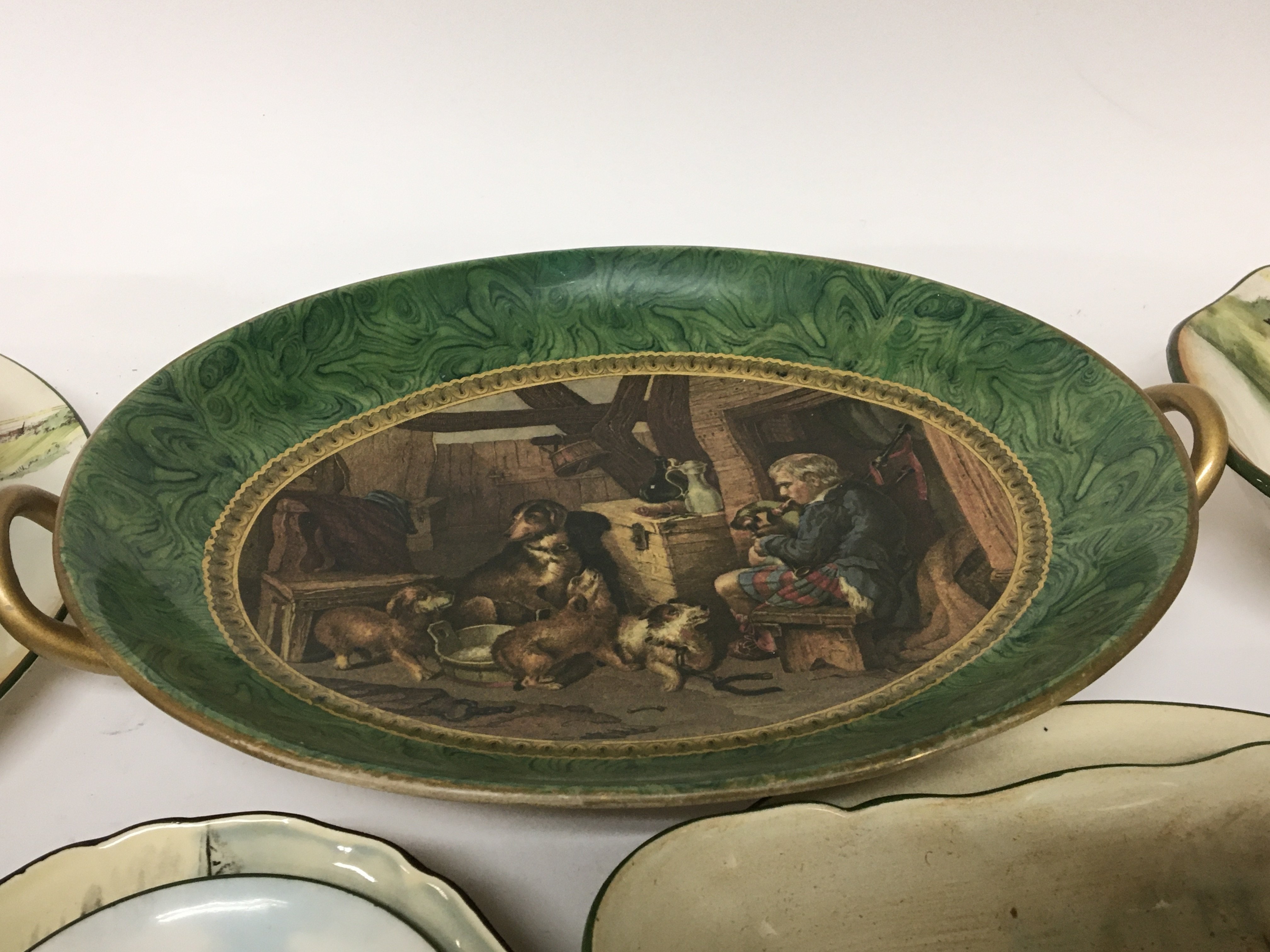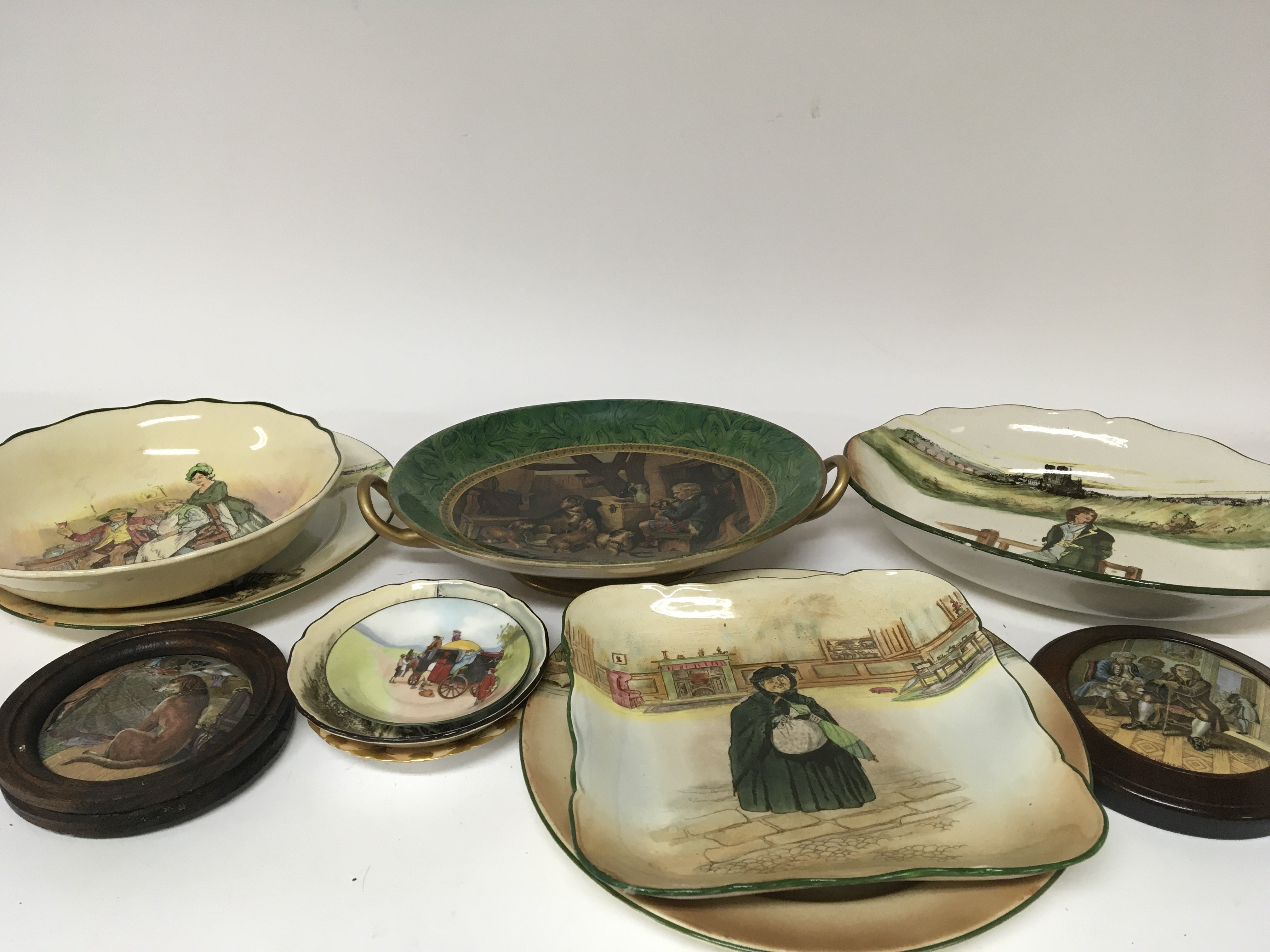 Two Victorian pot lids a conforming dish and a collection of Doulton series ware plates a d bowls. Victorian dish restored.