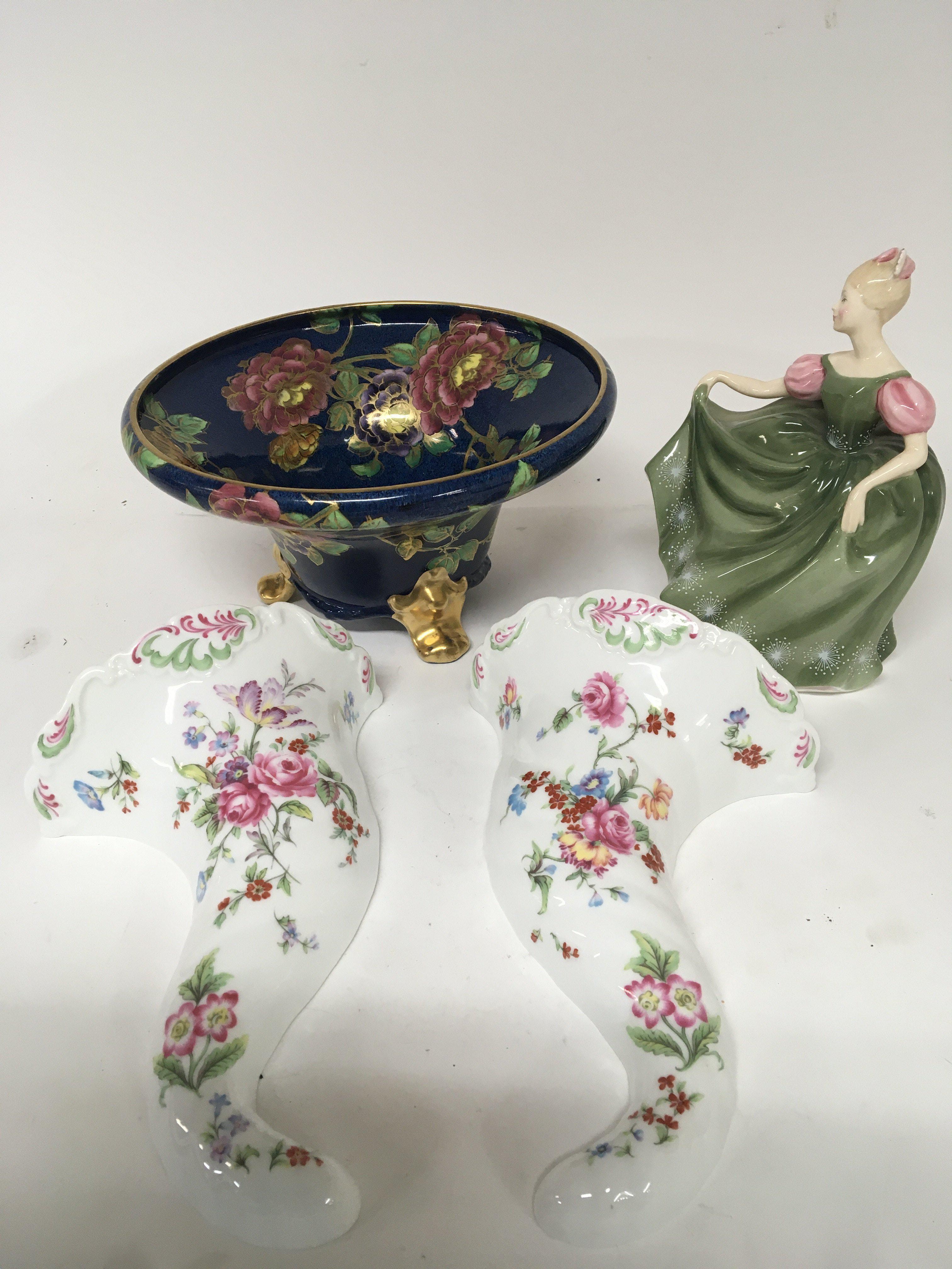 A Maling Ware powder blue bowl decorated with flowers and gilt and a pair of Worcester Porcelain wall pockets and a Royal Doulton figure. No obvious damage or restoration.