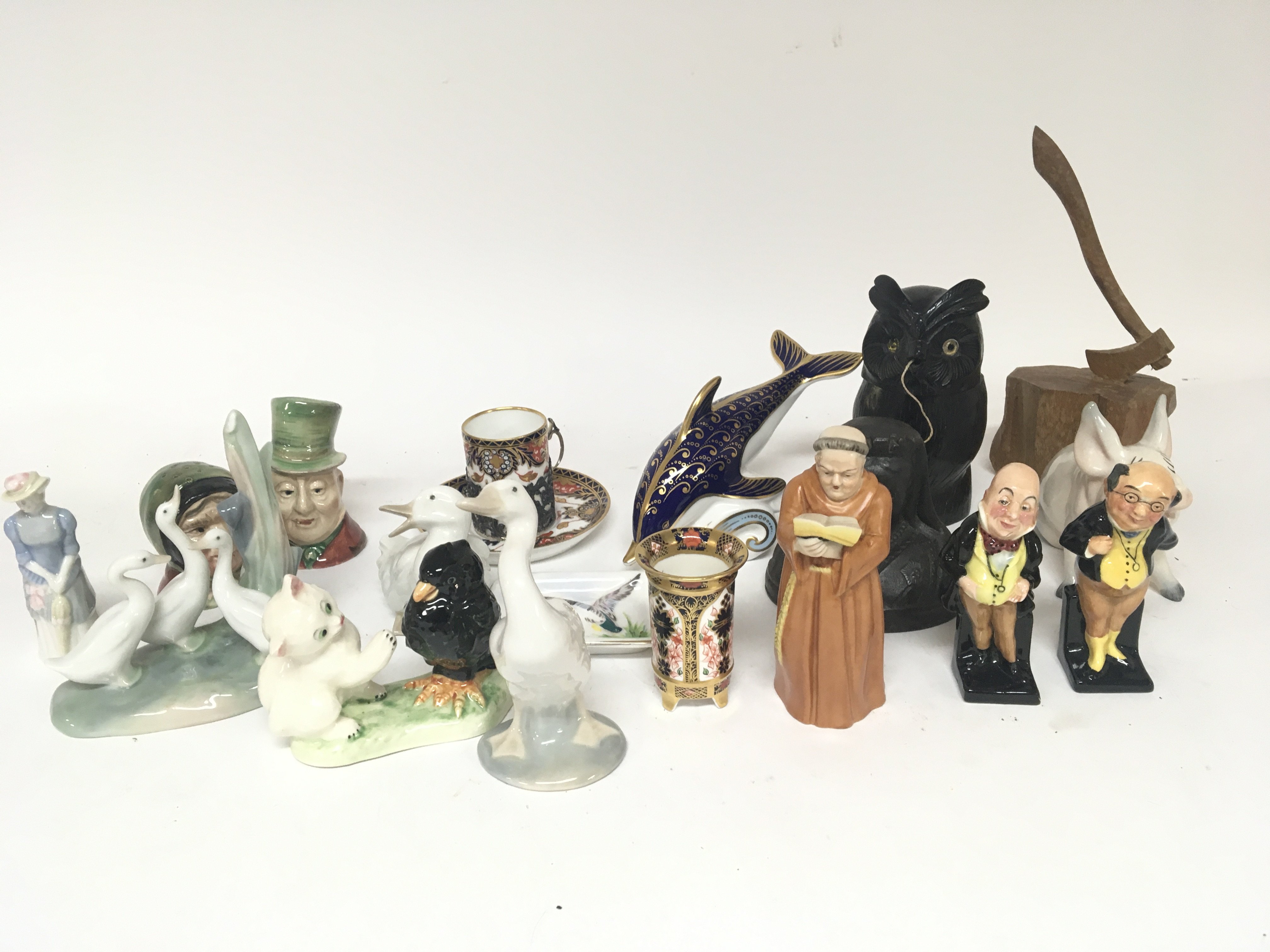 A Royal Crown Derby porcelain dolphin other Royal Crown Derby a Worcester candle snuffer in the form of a Monk Doulton figures a black Forest owl string holder and other oddments.