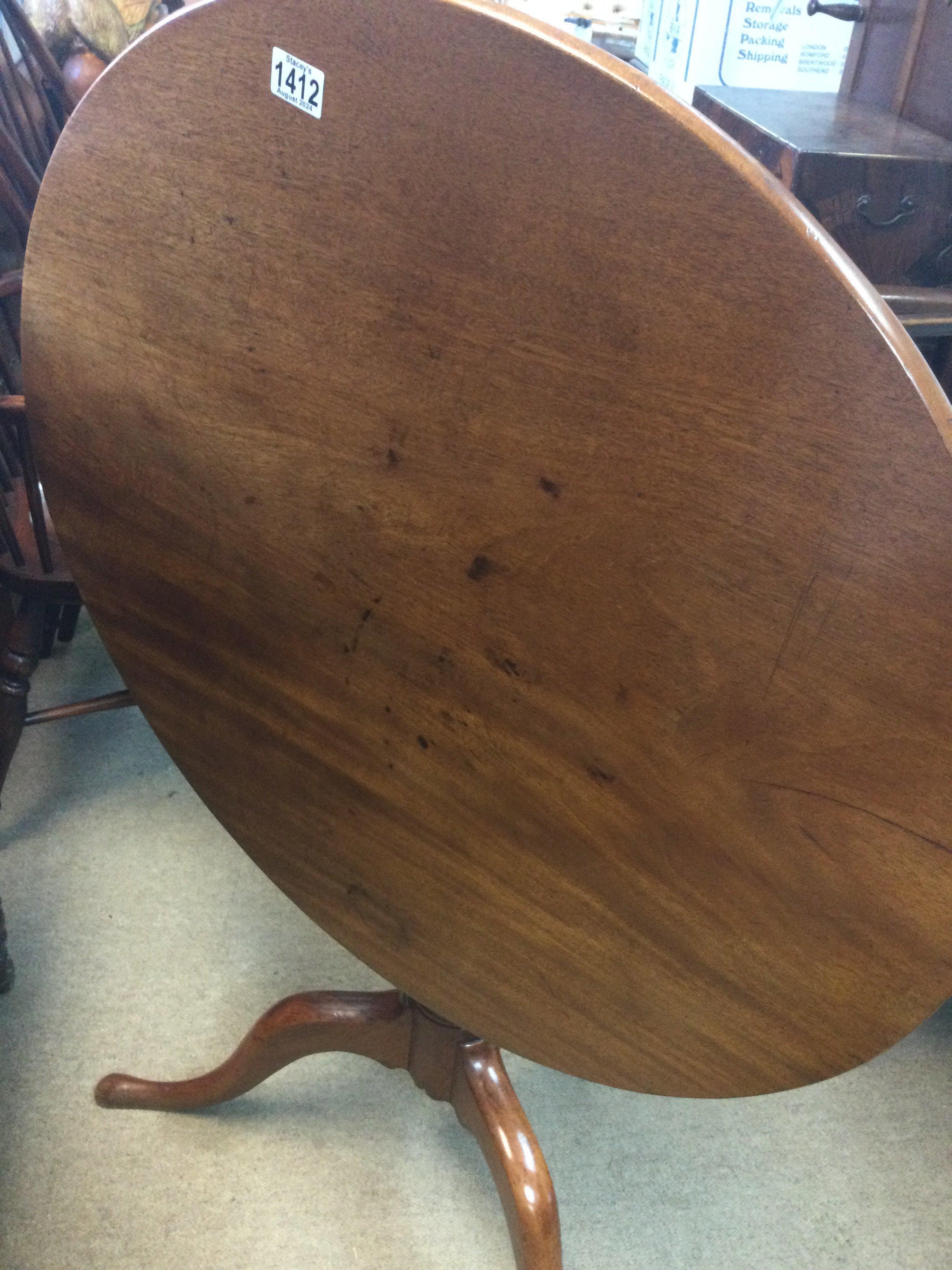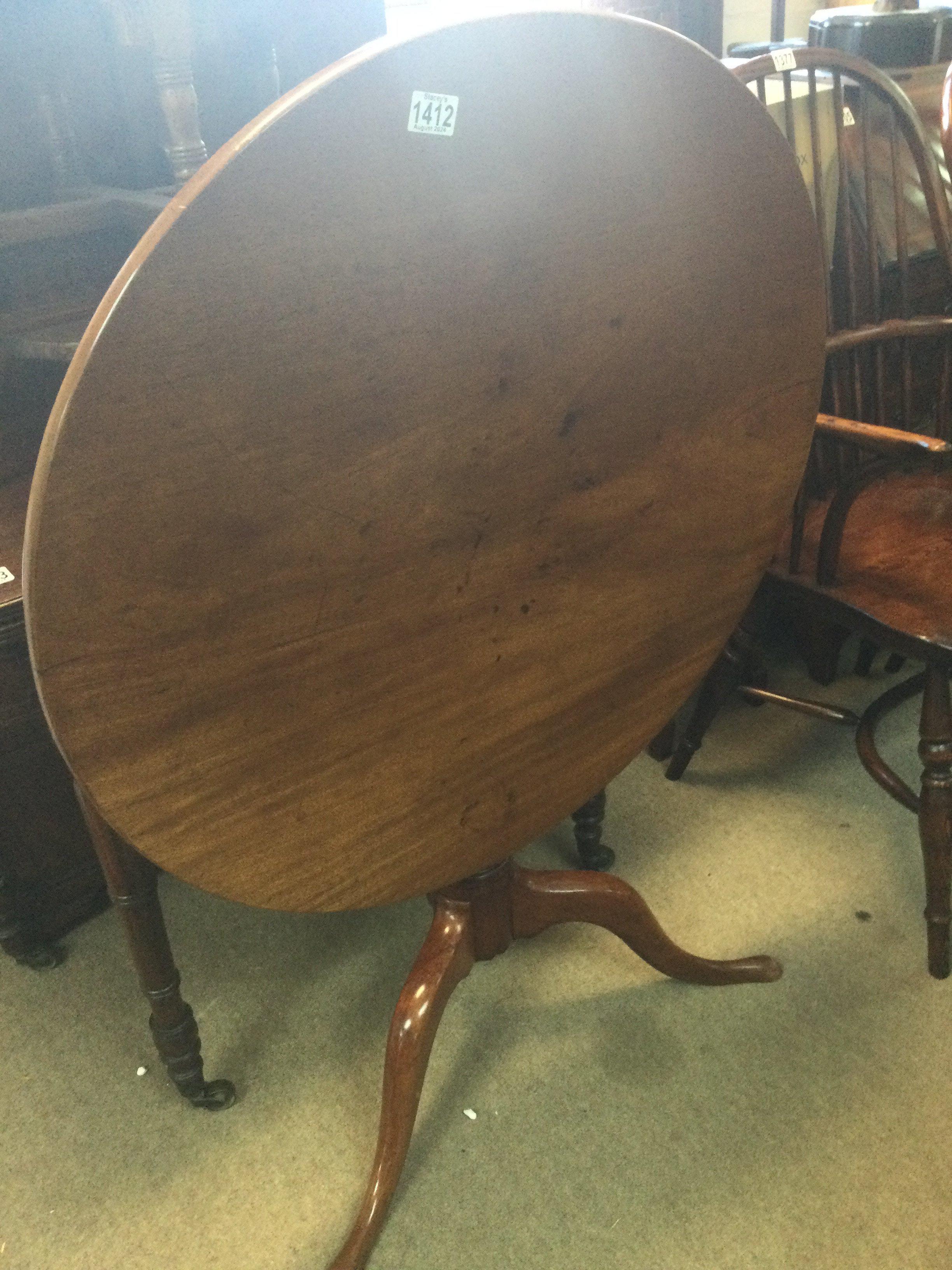 A Georgian mahogany tilt top occasion table the circular top above a turned column on splayed legs .
