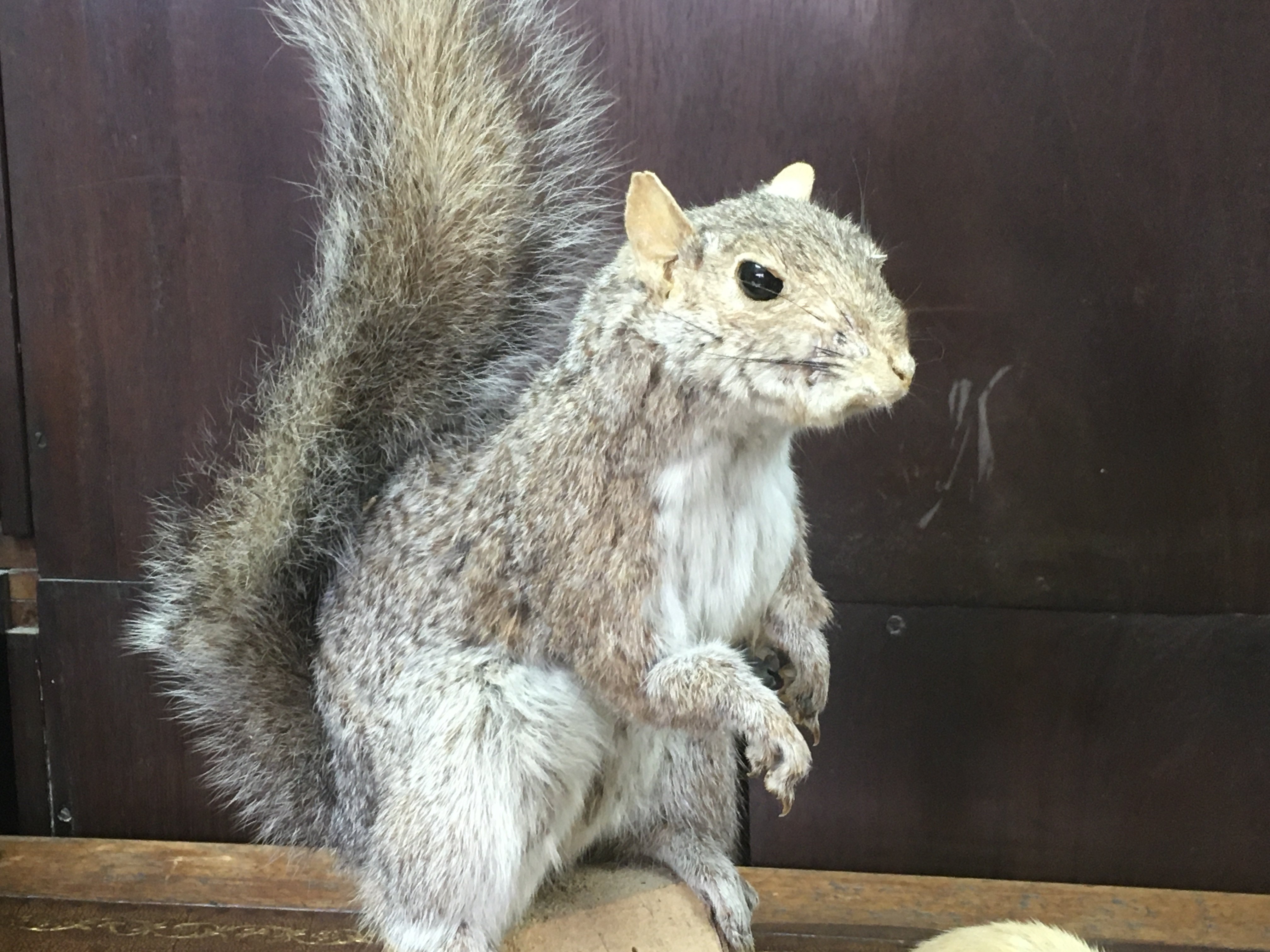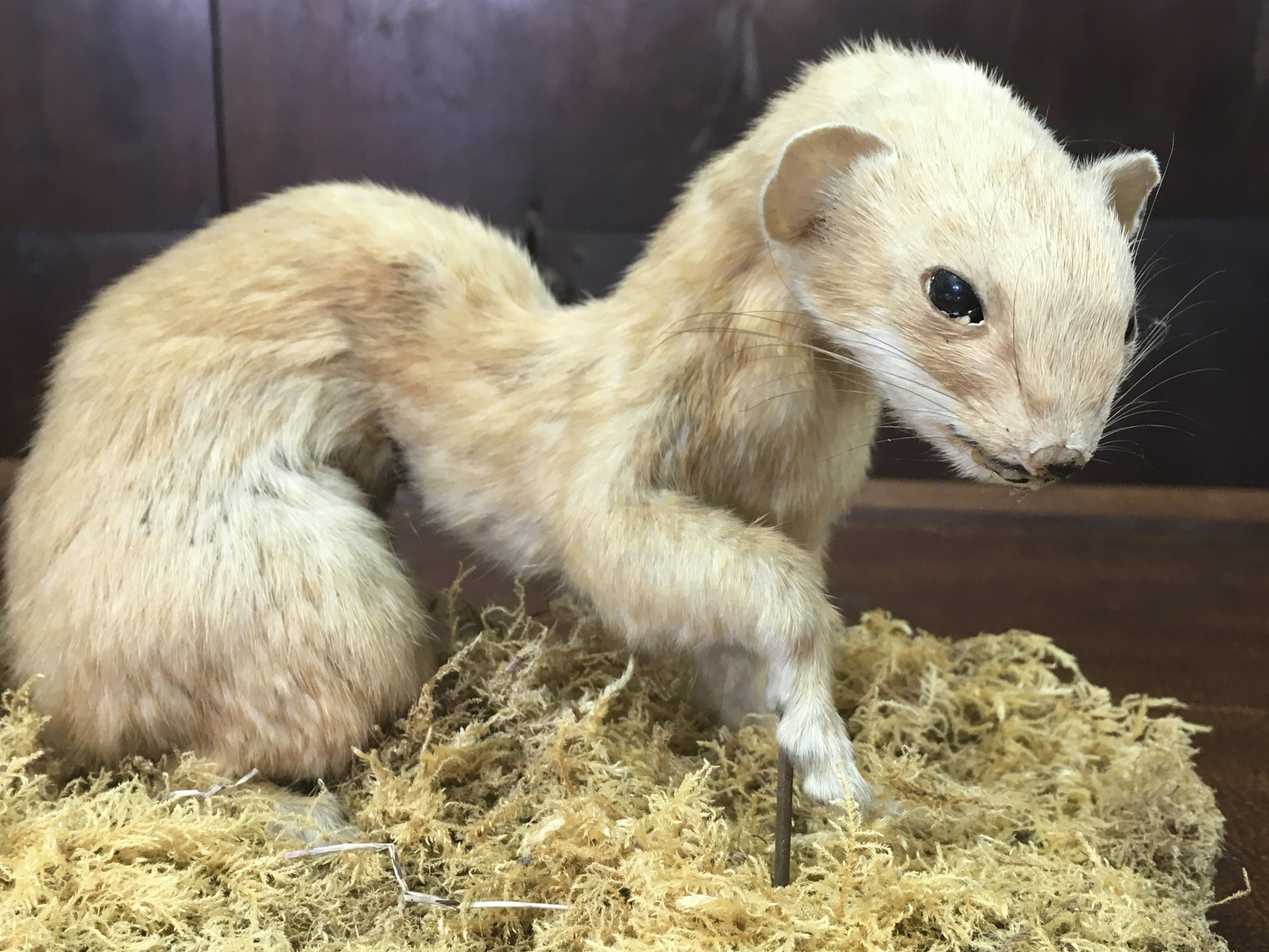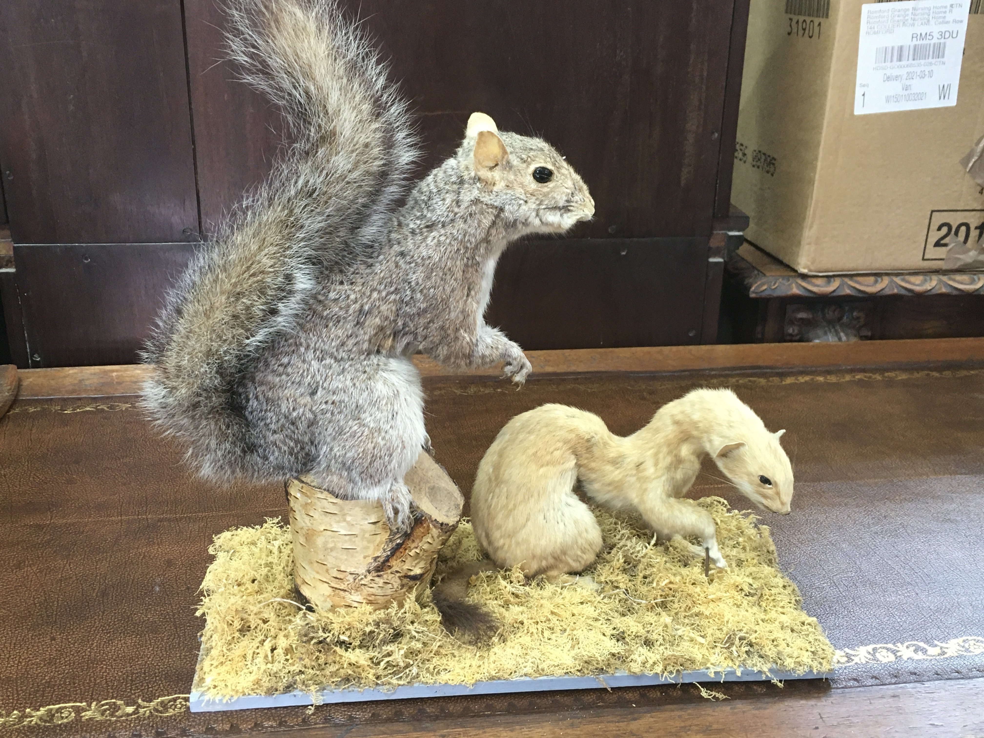 A taxidermy group, a Squirrel and a Stoat. 37cm tall 34cm wide Postage category C
