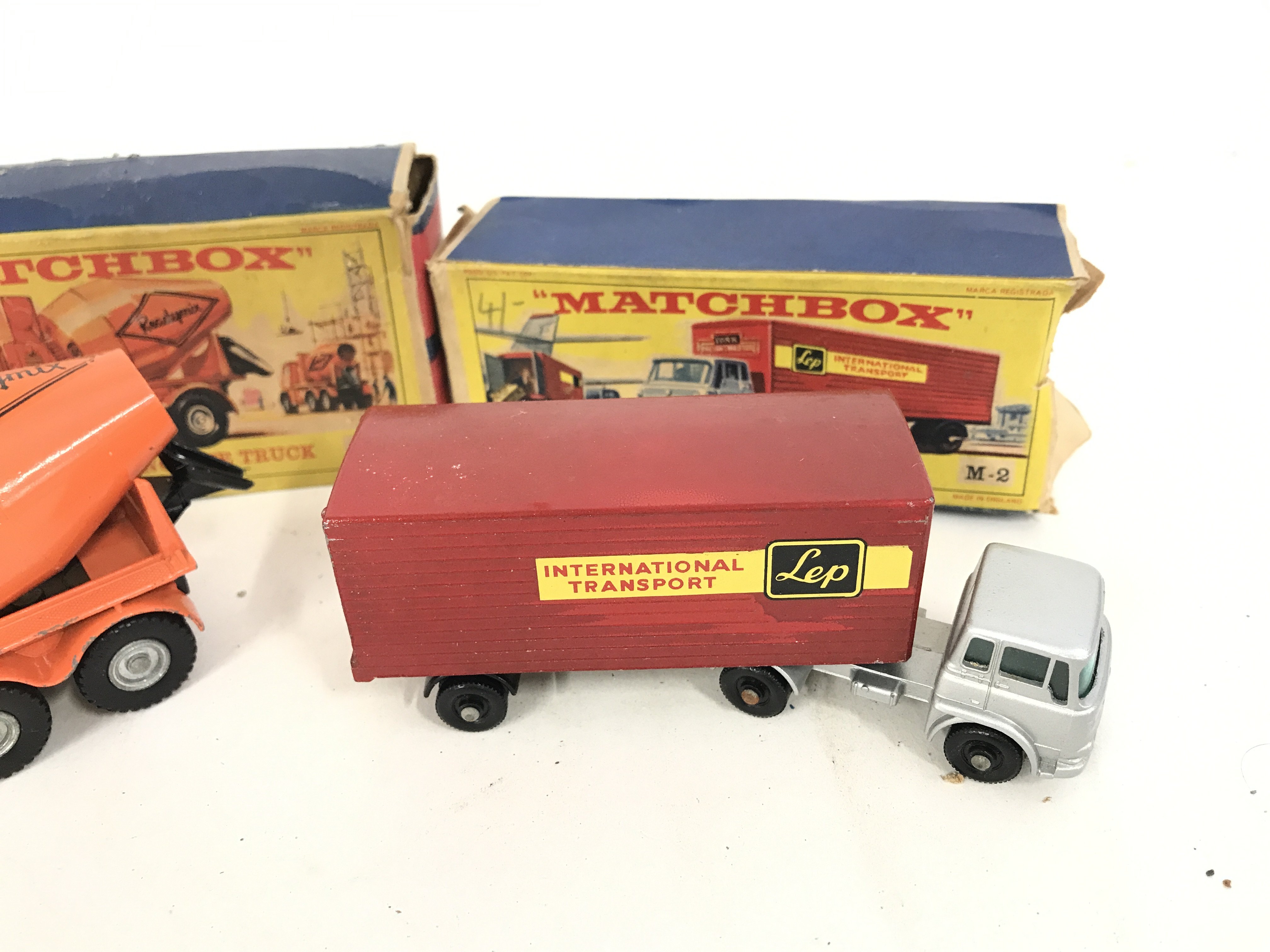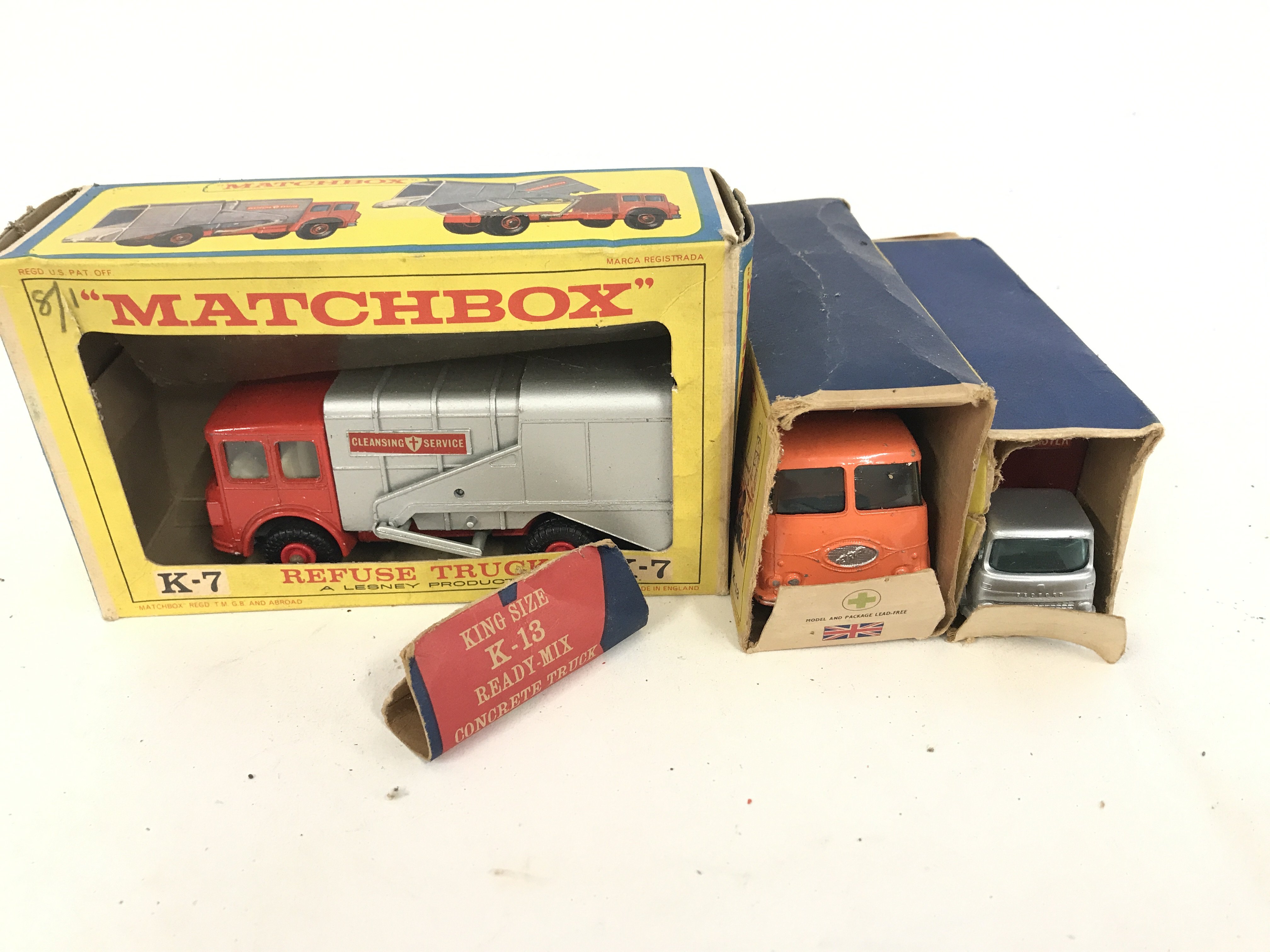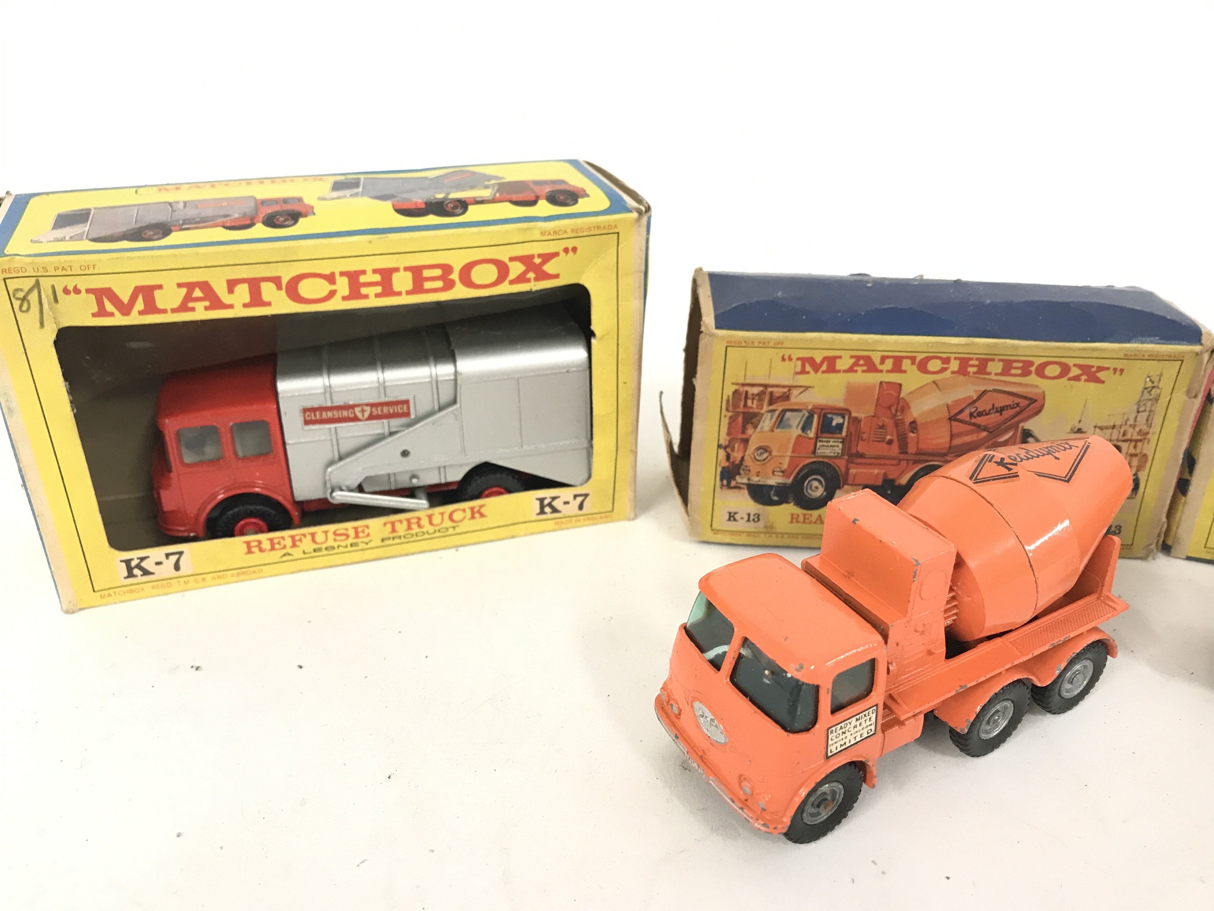 A Boxed Matchbox Refuse Truck #K-7. A Ready Mix Concrete Truck #K-19. And an Articulated Freight Truck #M-2. Boxes are Worn.