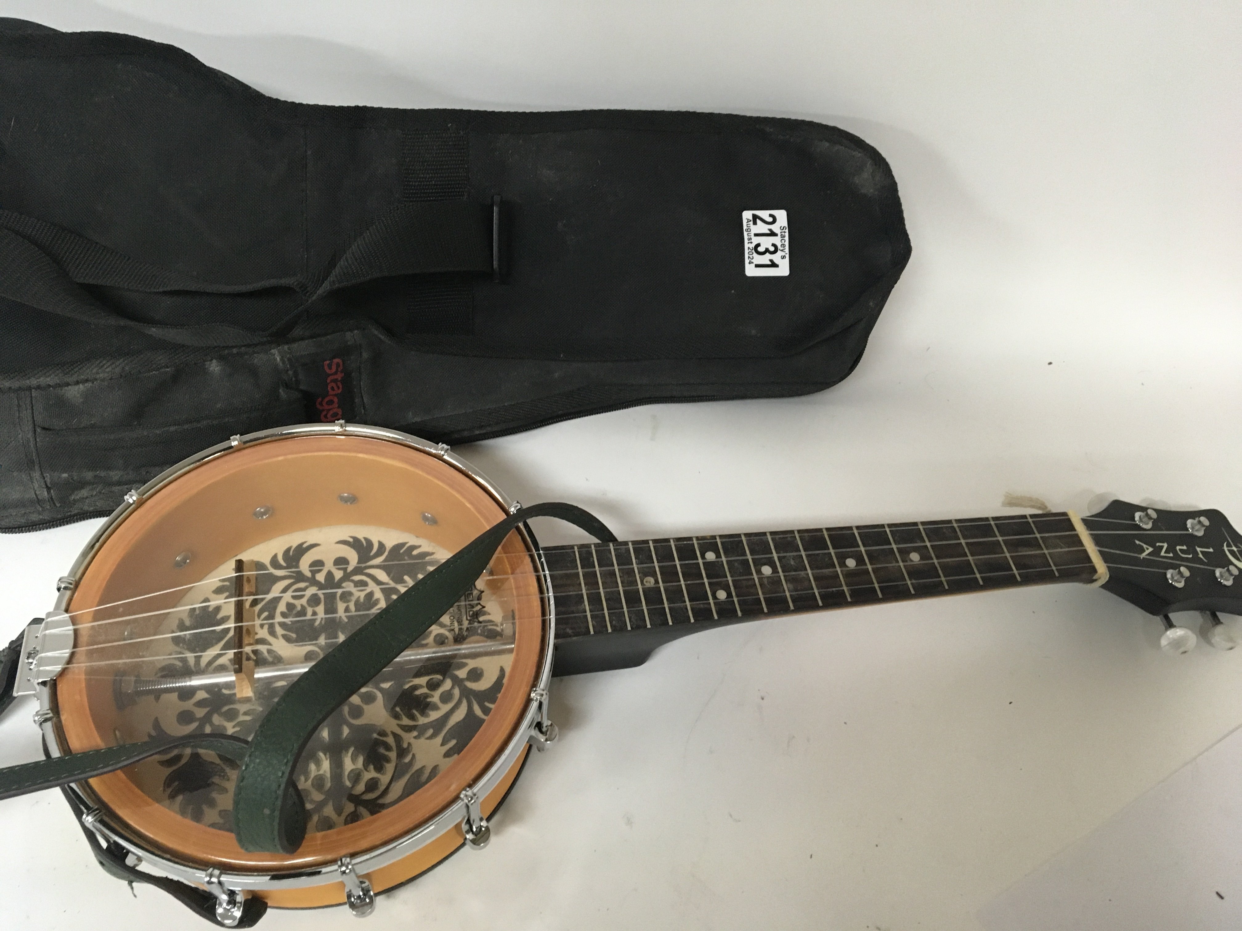 A banjo Ukulele Remo Luna in a fitted case music sheets and stand.