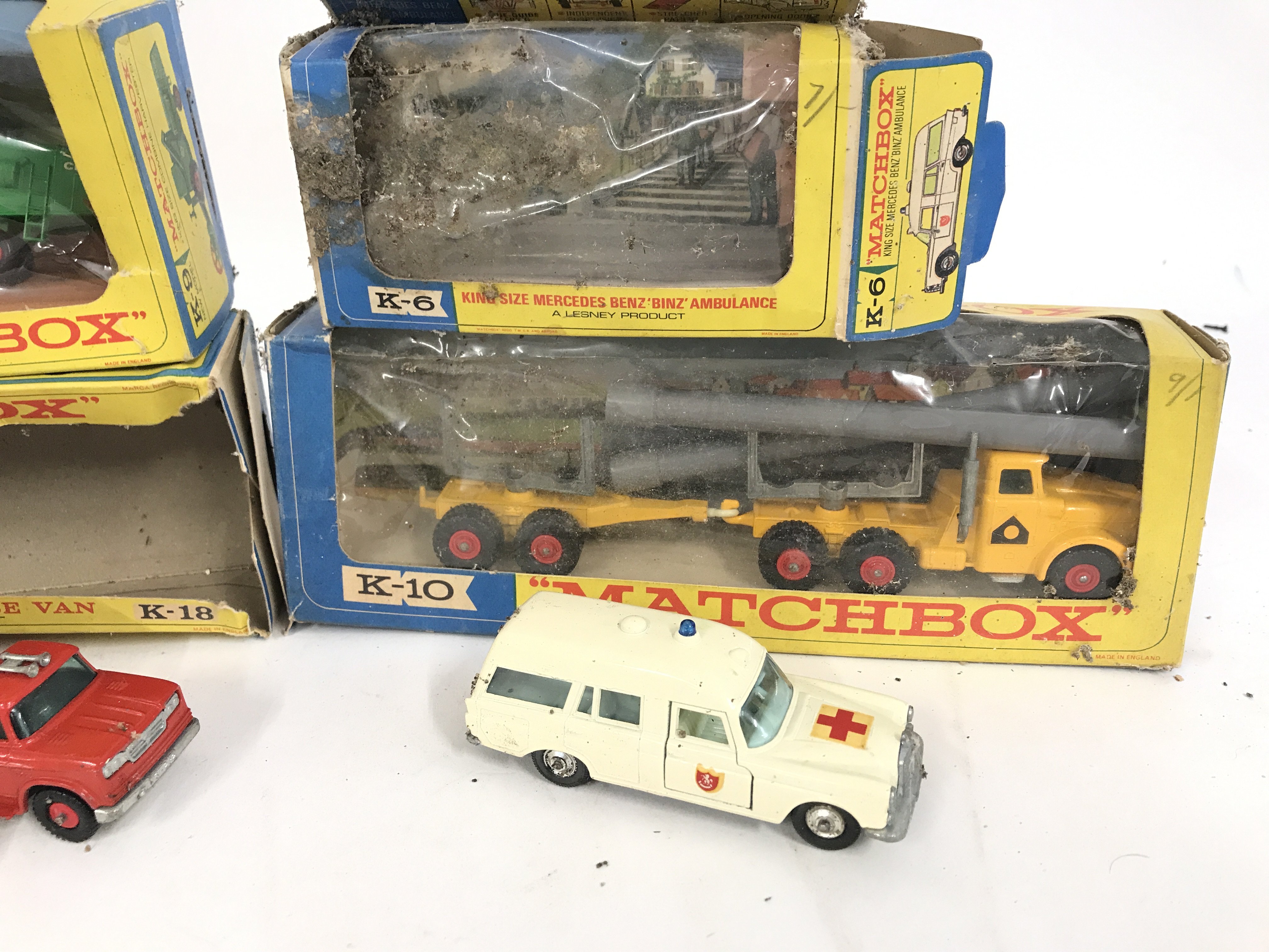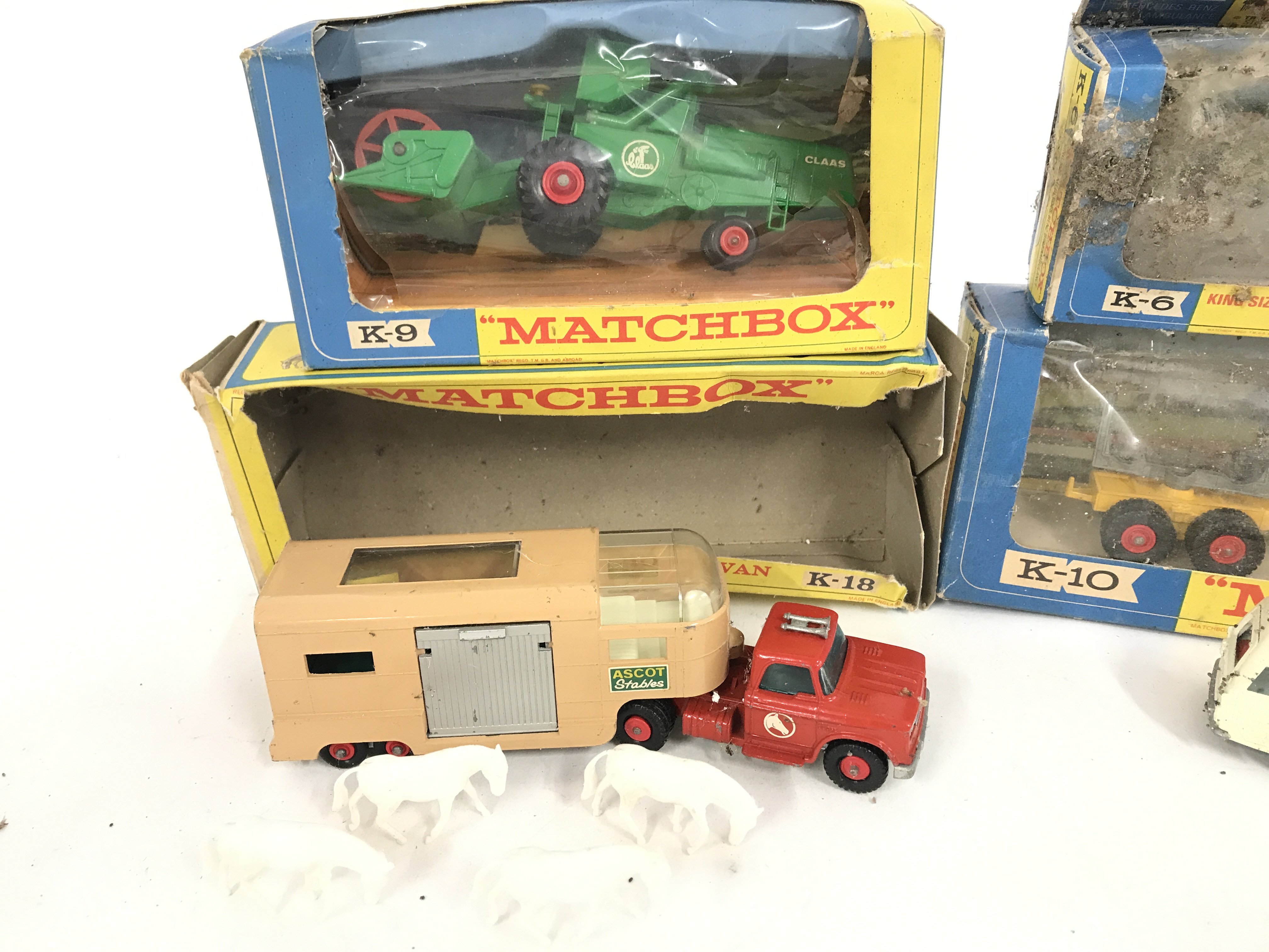 4 Boxed Matchbox Vehicles. A Articulated Horse Van #K-19. A Mercedes Benz Ambulance #k-6. A Combine Harvester #k-9 and a Pipe Truck #K-10. Boxes a Very worn.