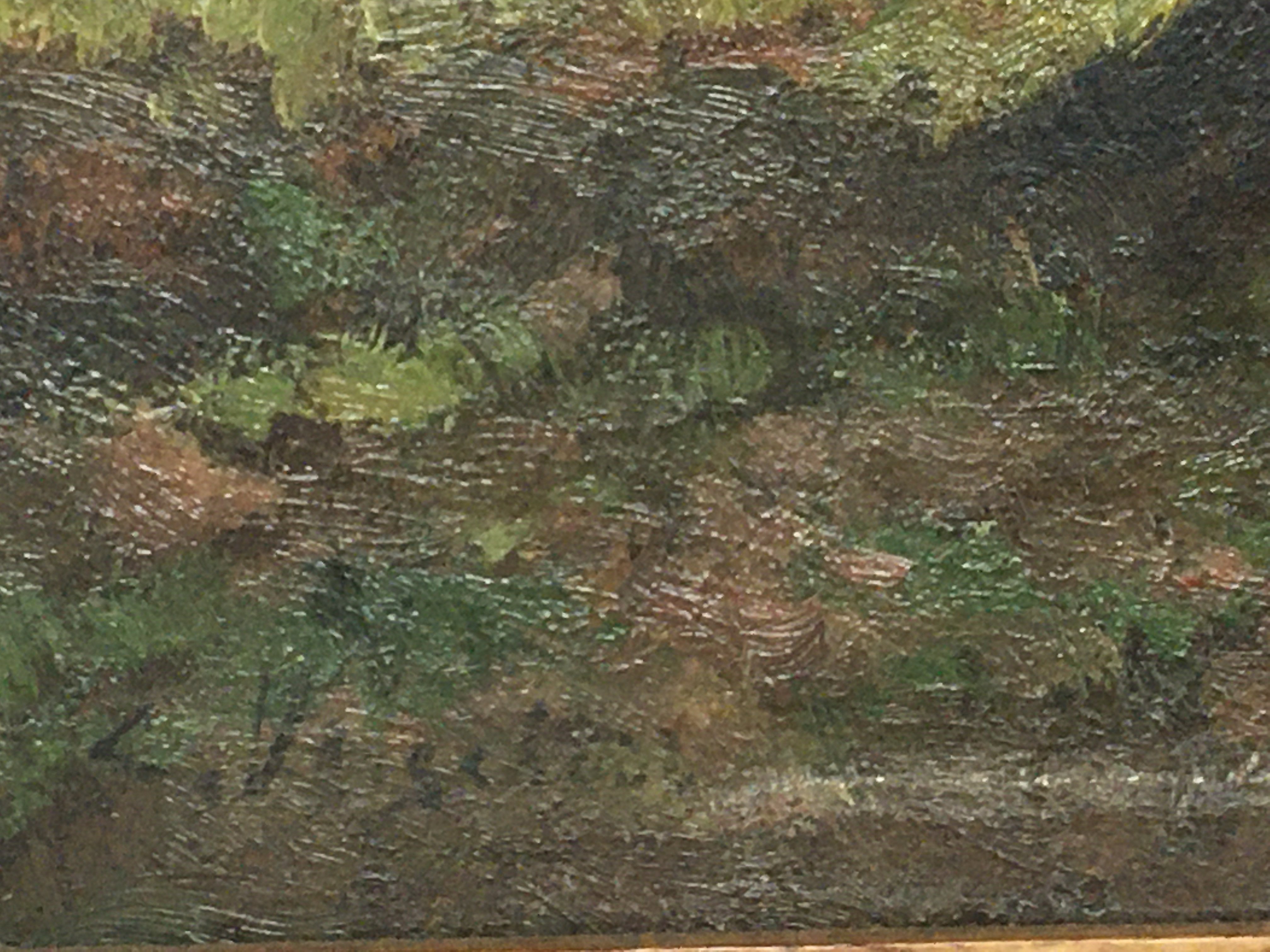 A framed Dutch 20th Century oil painting on canvas study of a wooded landscape in an oak frame Indistinctly signed. 65x57cm