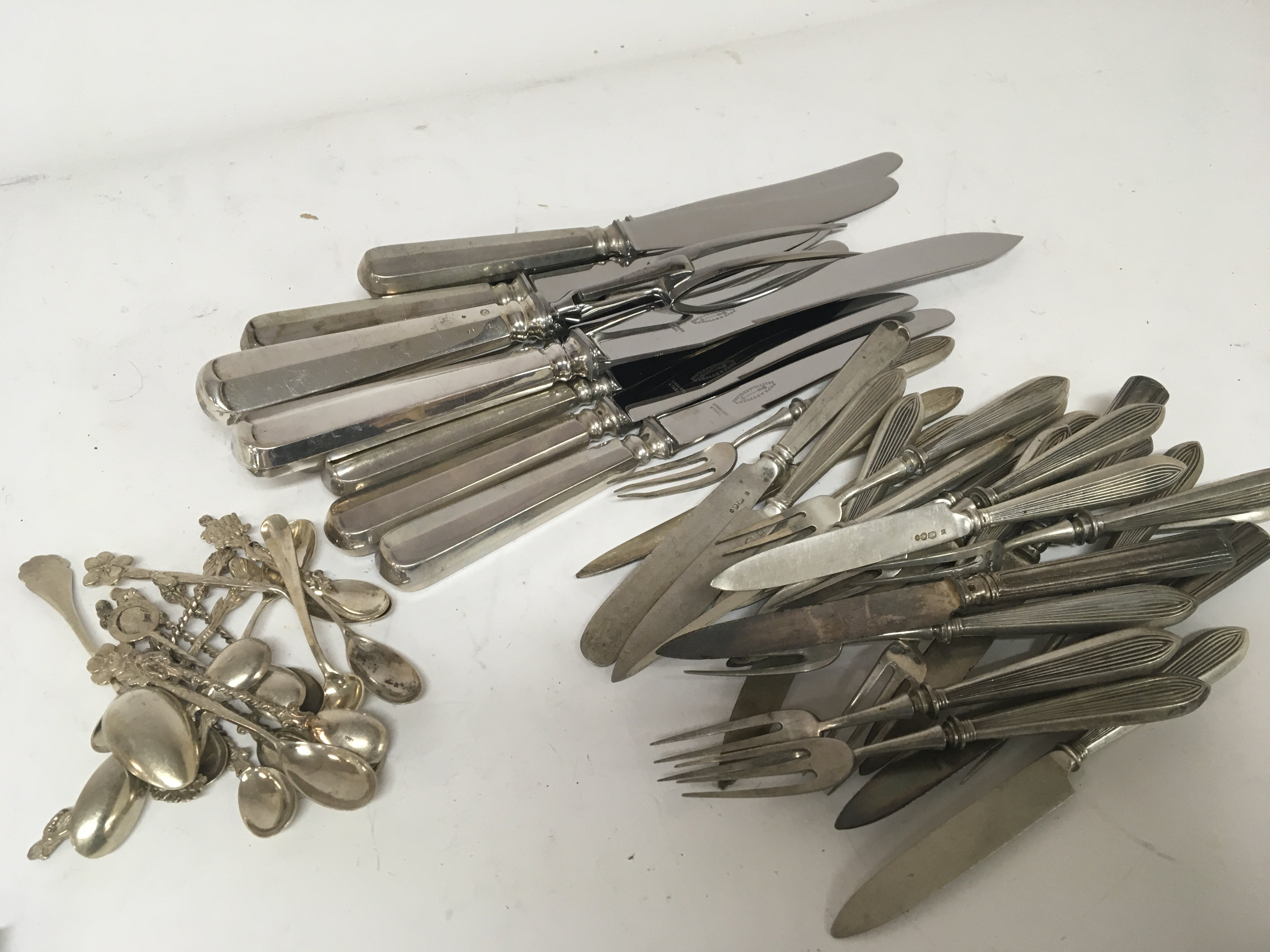 A collection of small decorative Dutch silver tea spoons small apostle type spoons 833/1000 a collection of loaded silver handled table knifes and a quantity of silver bladed fruit knives with loaded silver handles.