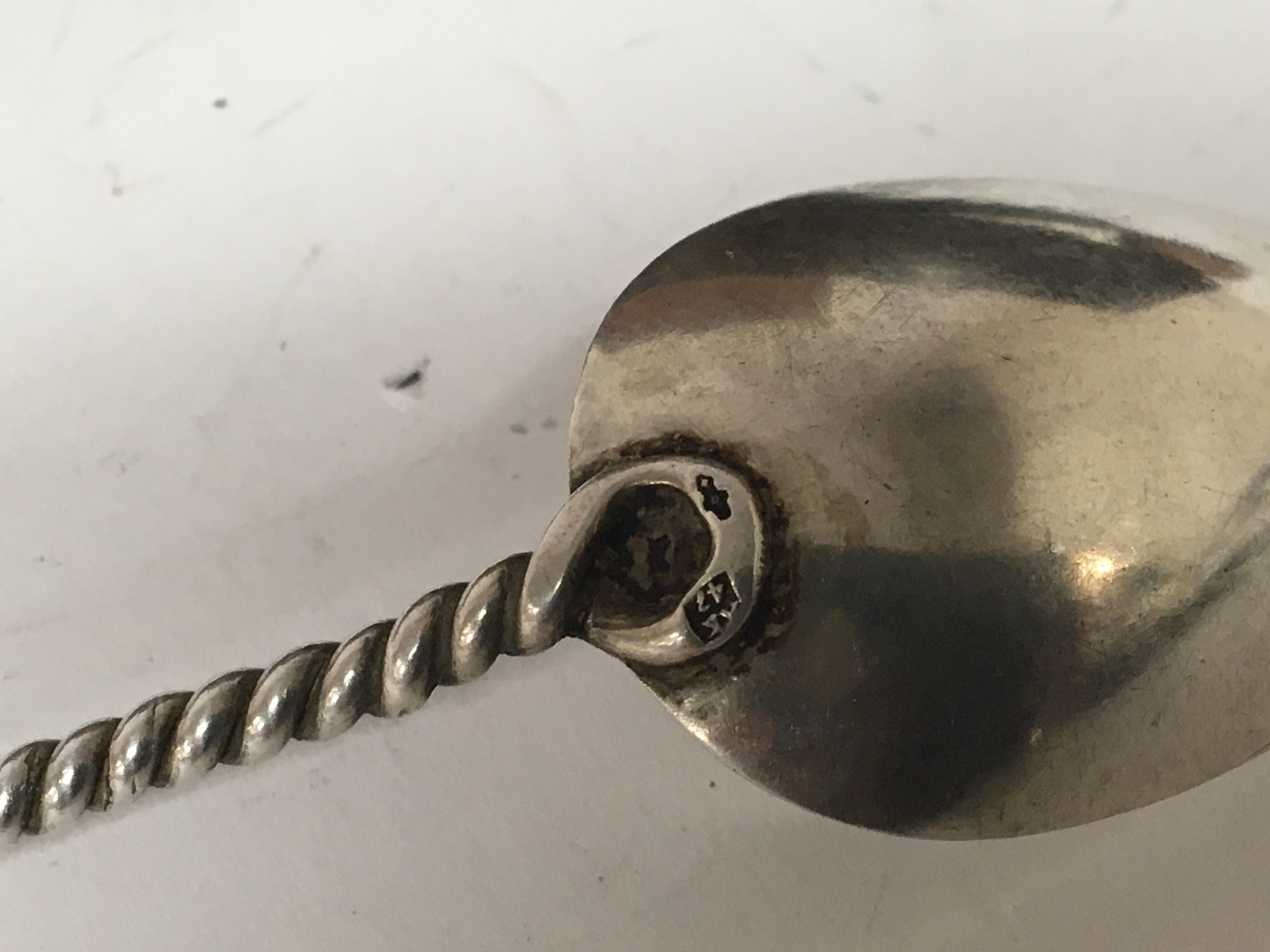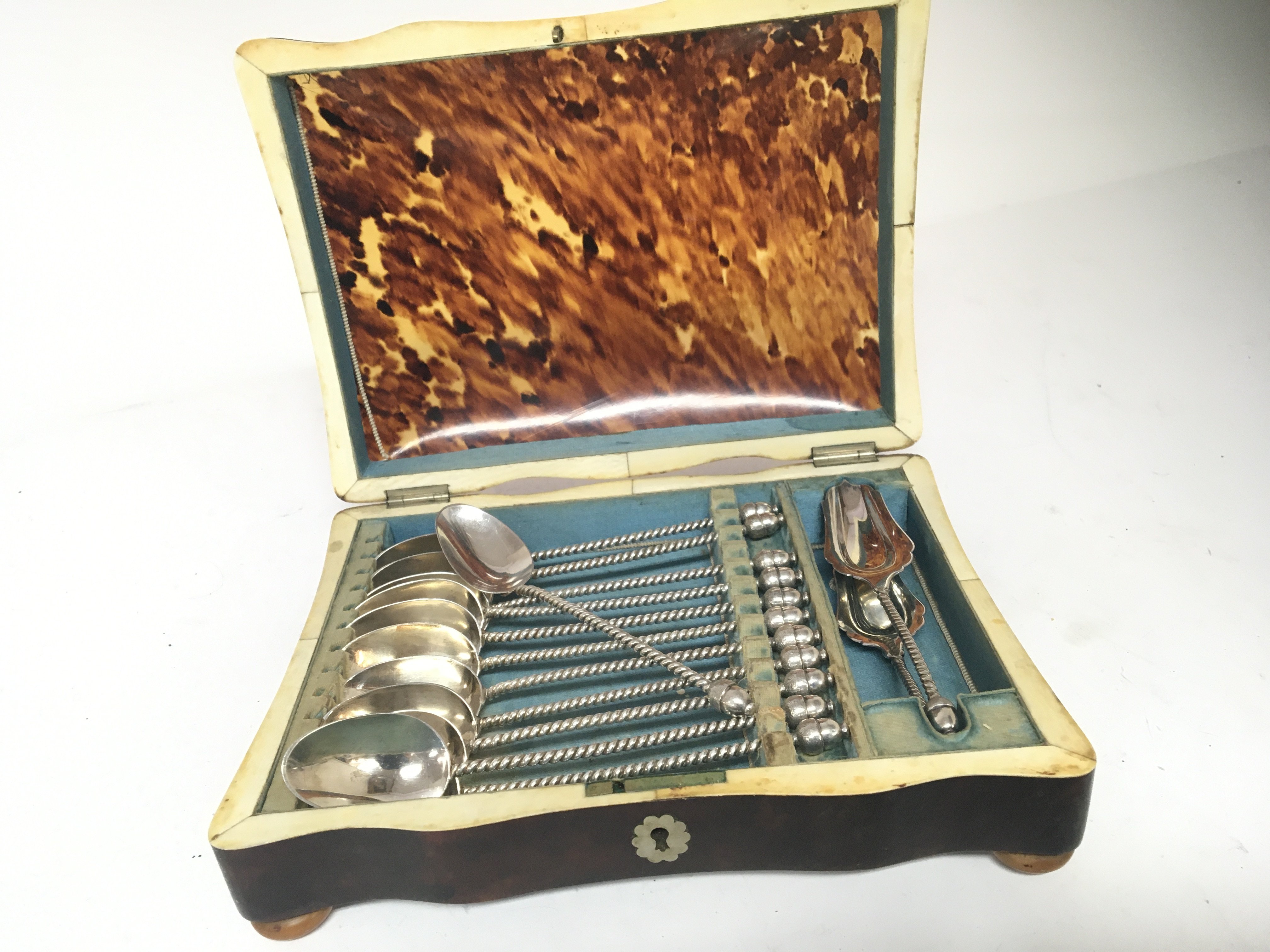 A set of Dutch silver spoons with acorn finials and twist stems in a 19th Century tortoiseshell case.