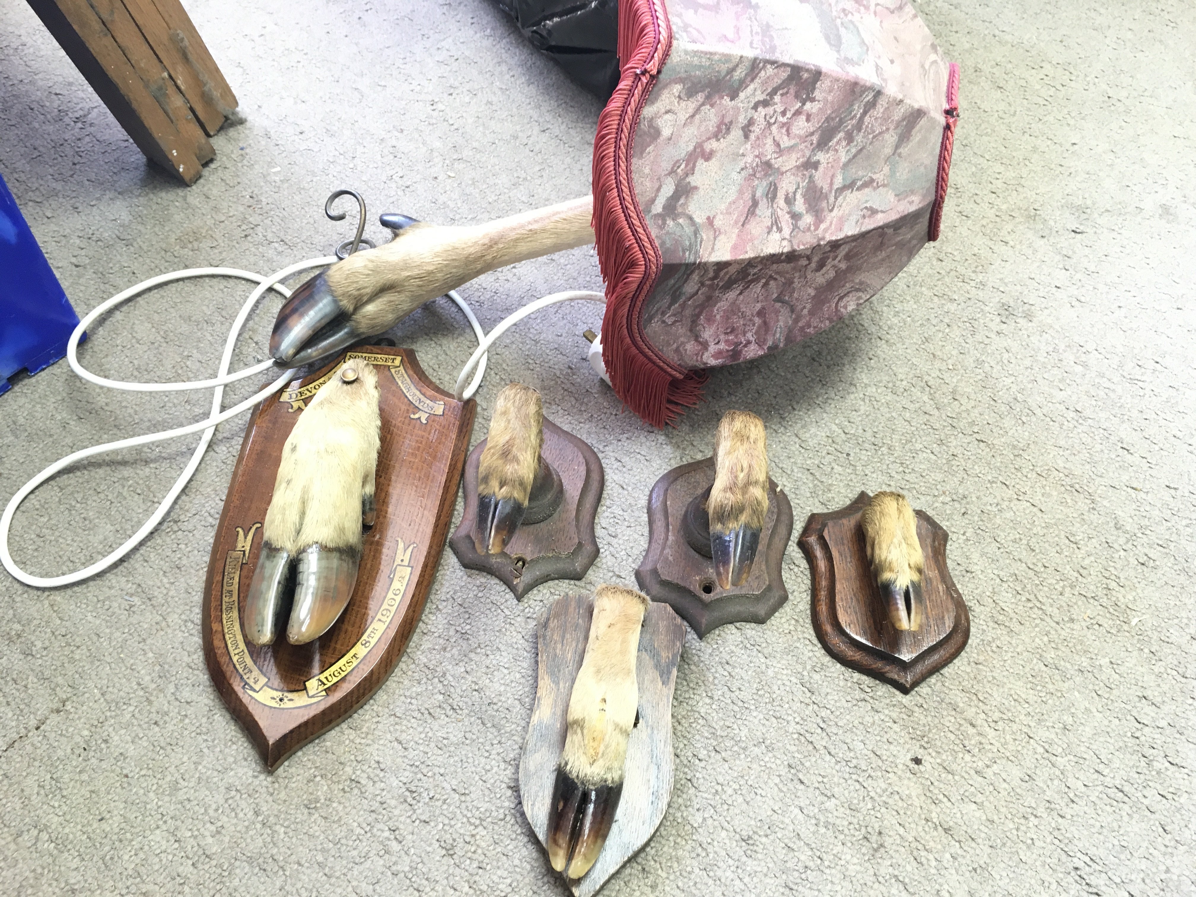 A collection of Deer feet including an unusual lamp and feet mounted on wooden shields. Postage category C